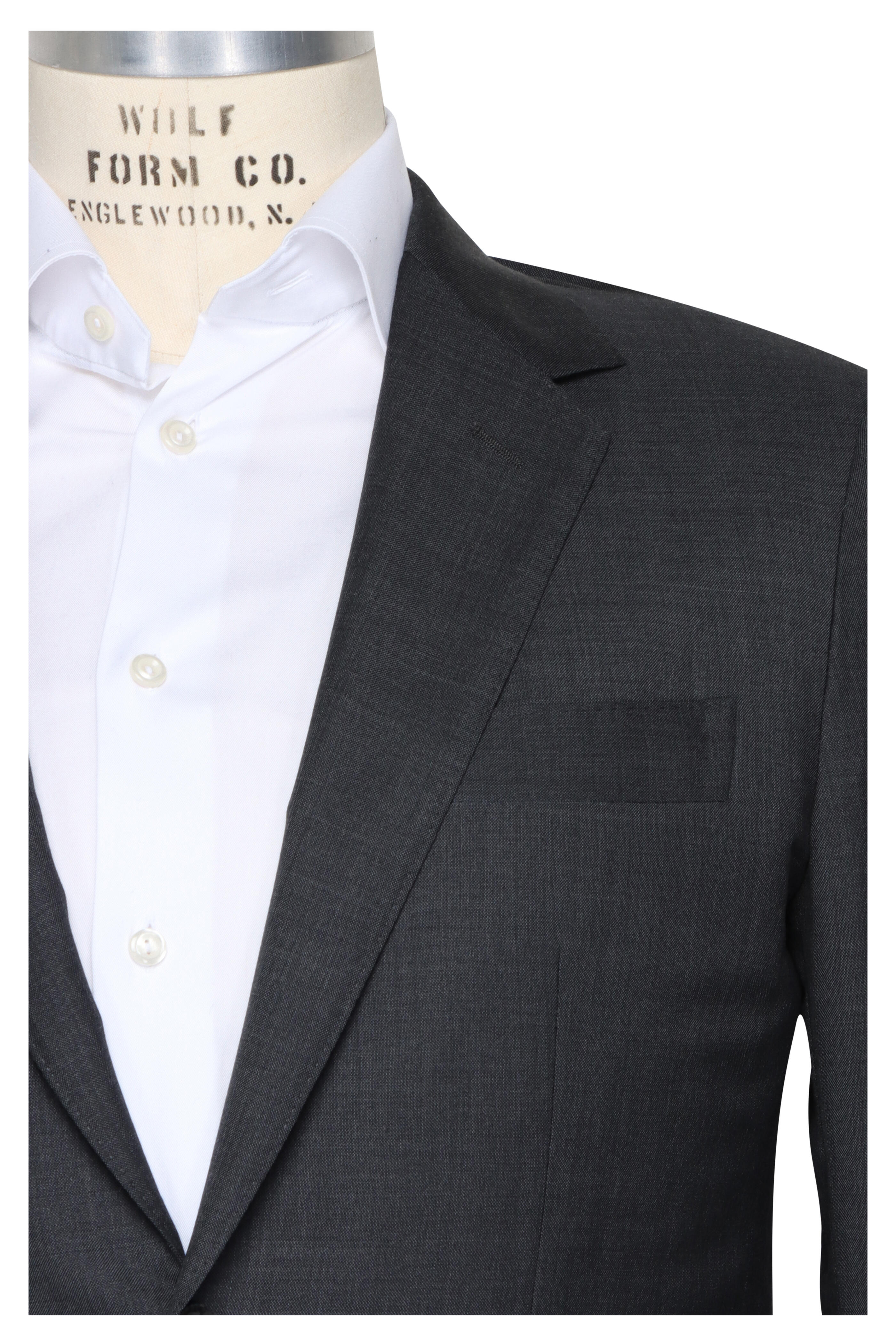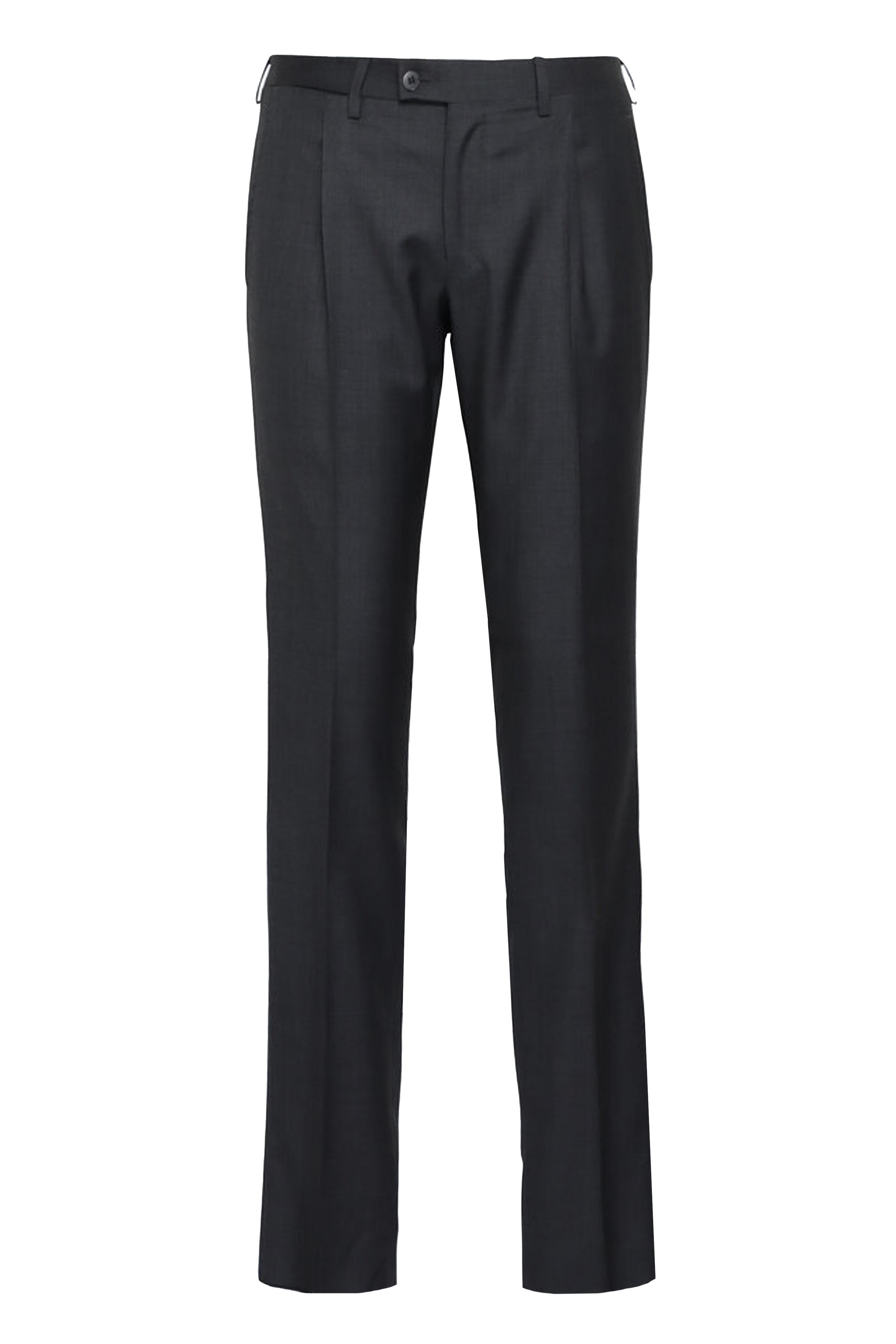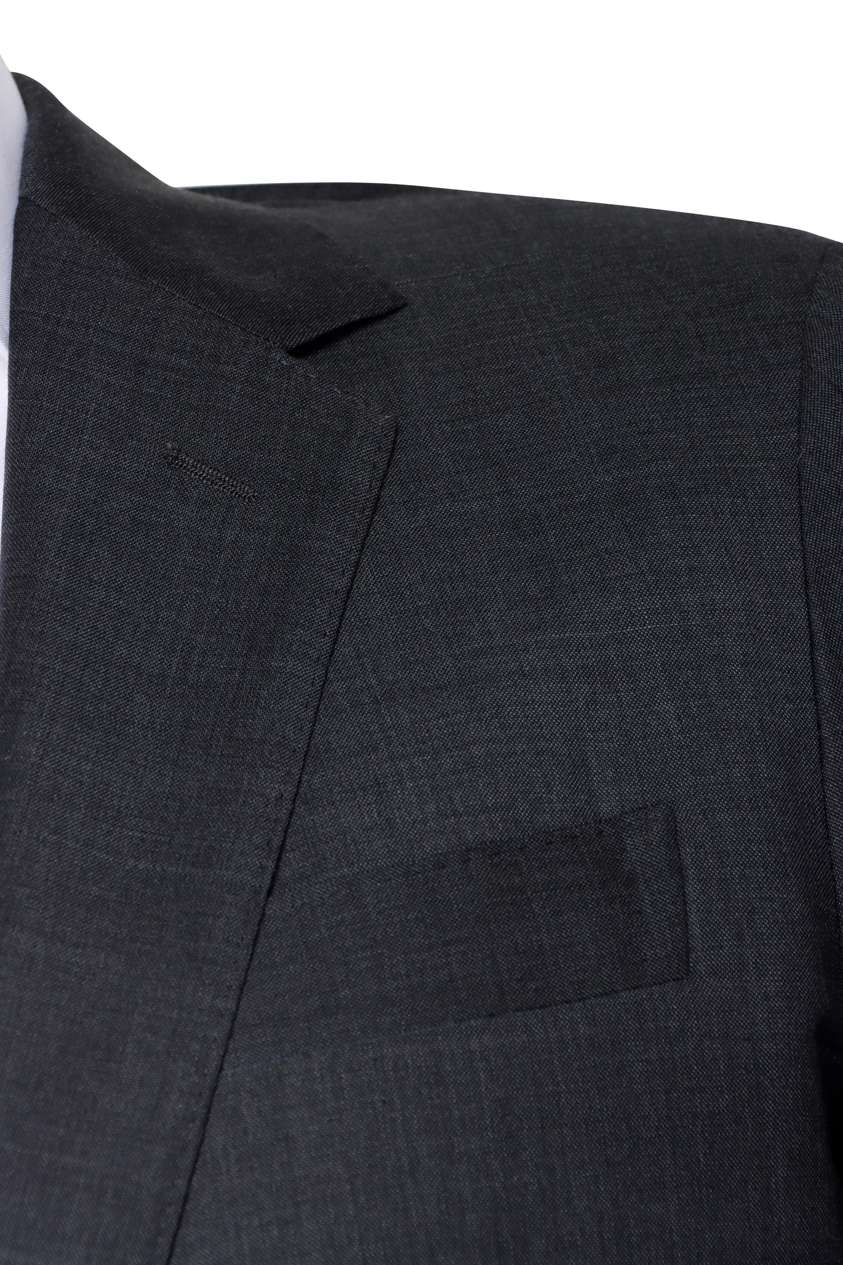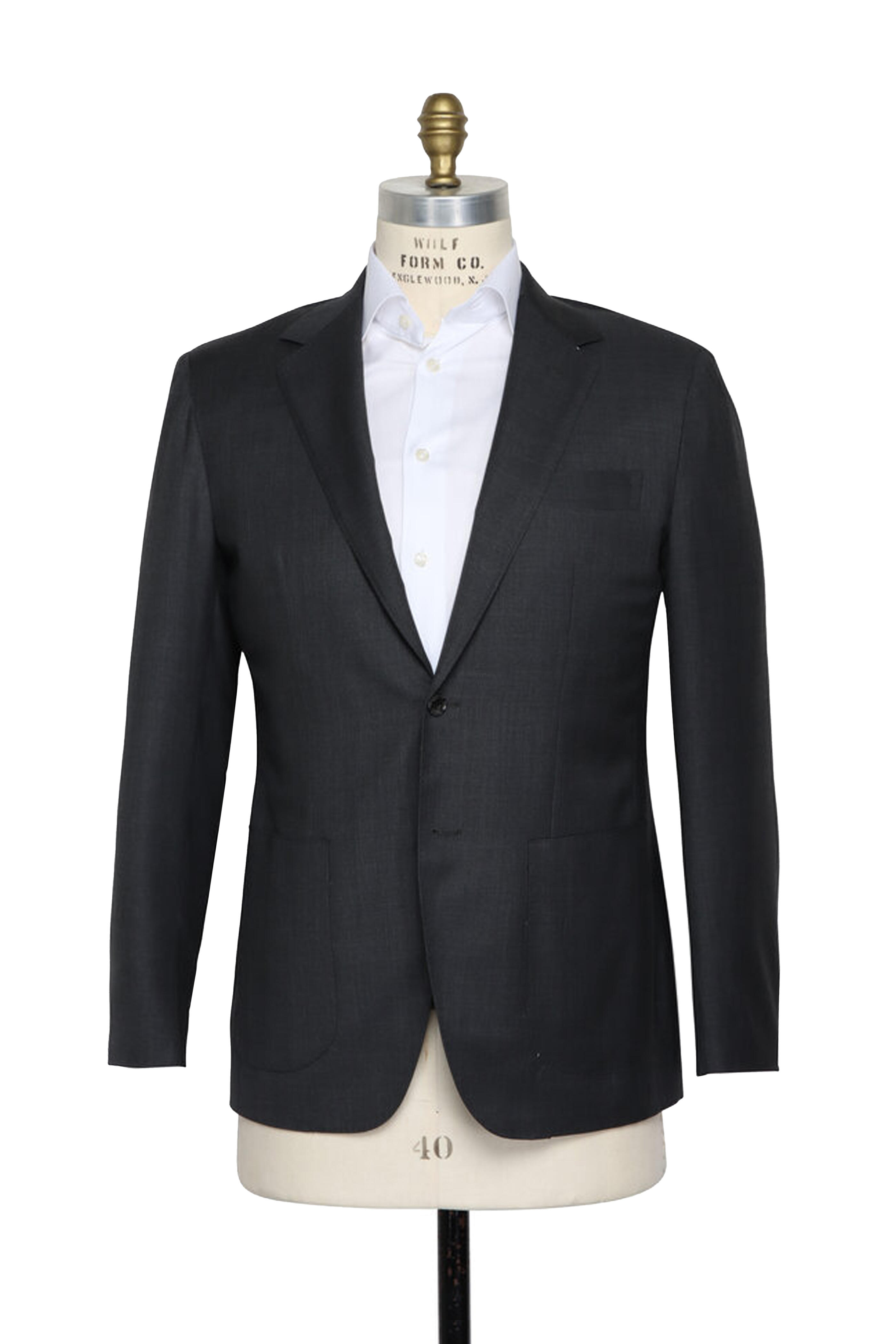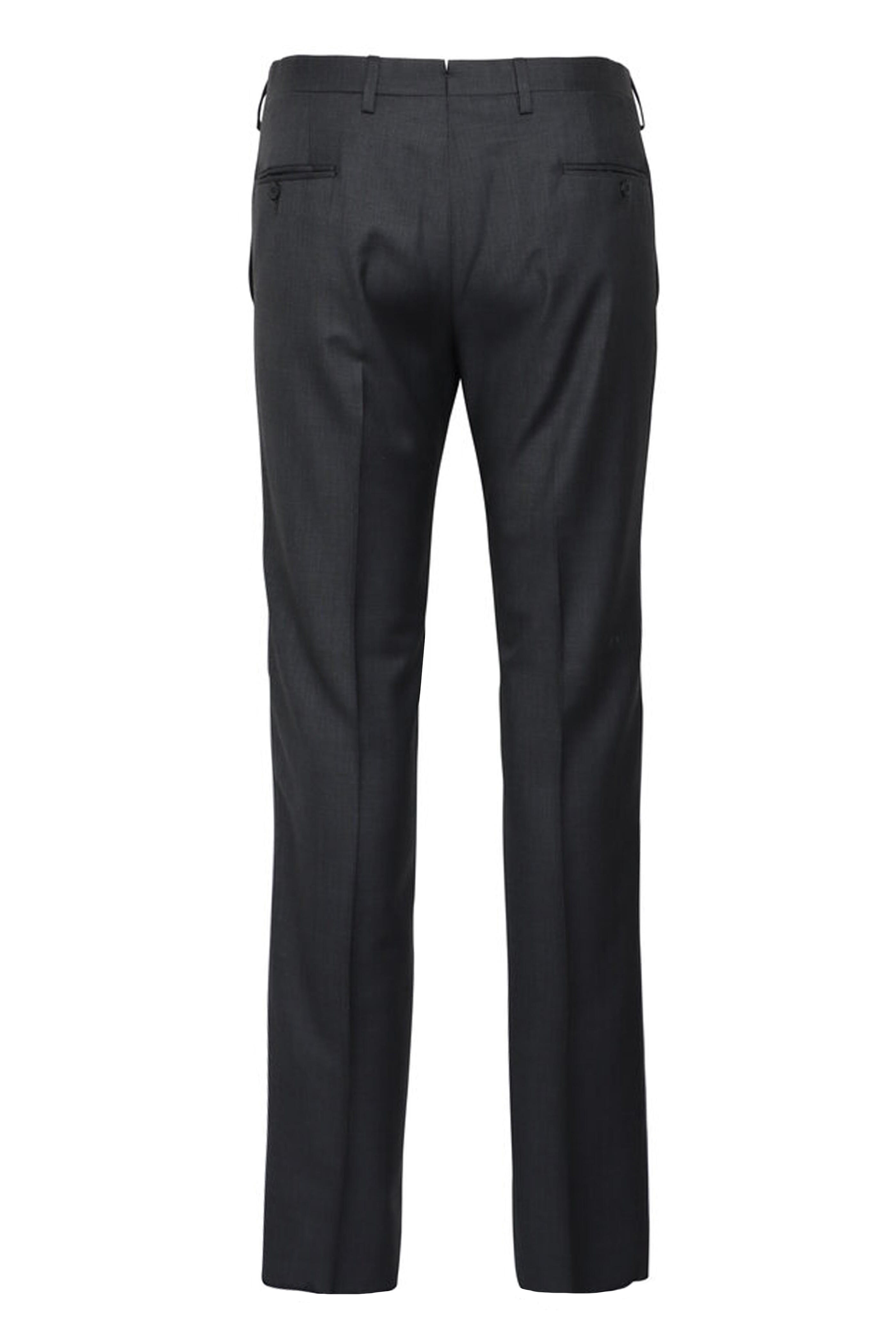 Made in Italy. Jacket: Fully lined. Notched lapels. Front two button closure. Left chest welt pocket; lower waist patch pockets; interior slip pockets. No buttons attached. Double back vents. Pant: Banded waist; belt loops. Front slip pockets; back besom pockets. Unfinished hem. 100% Wool. Dry clean.