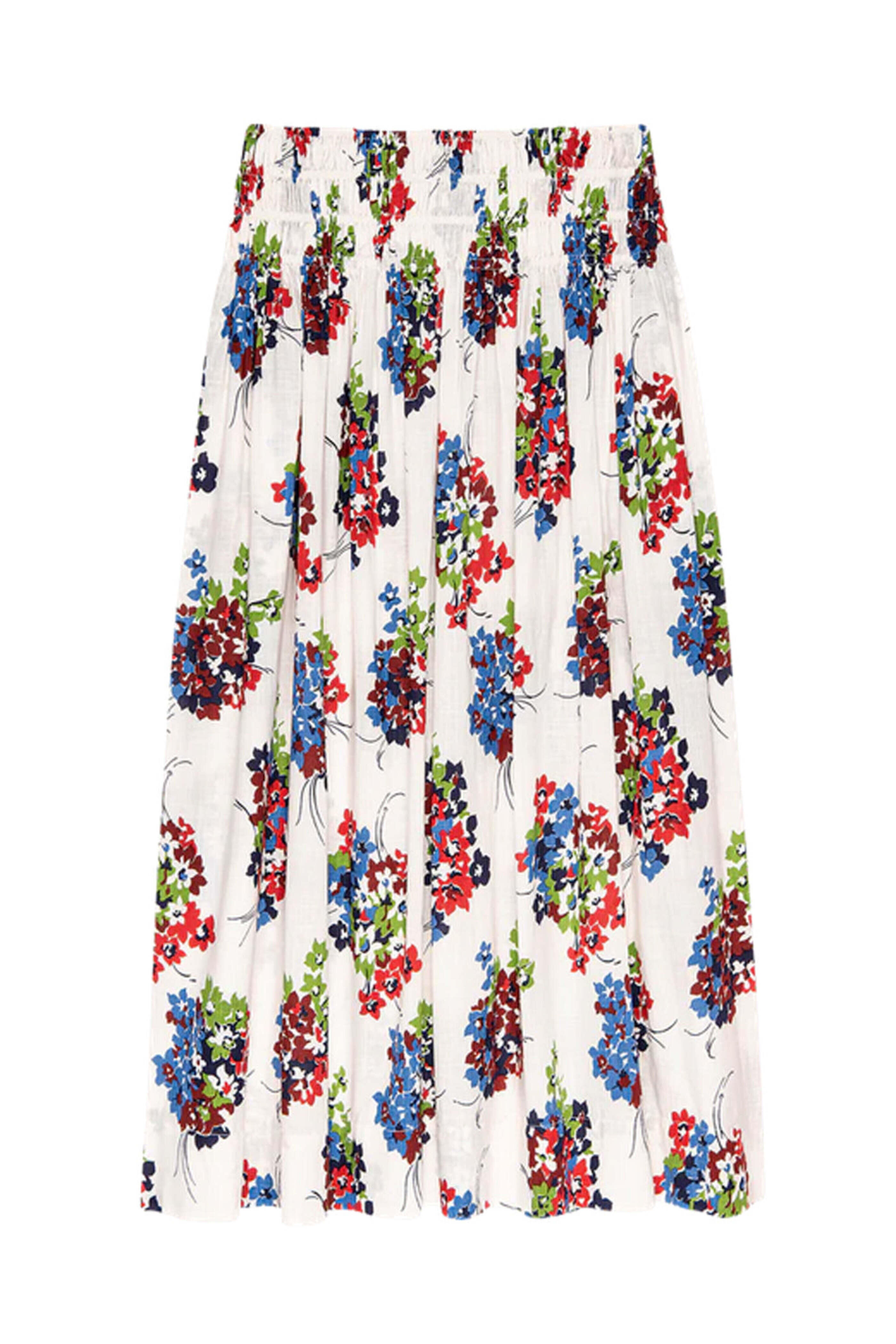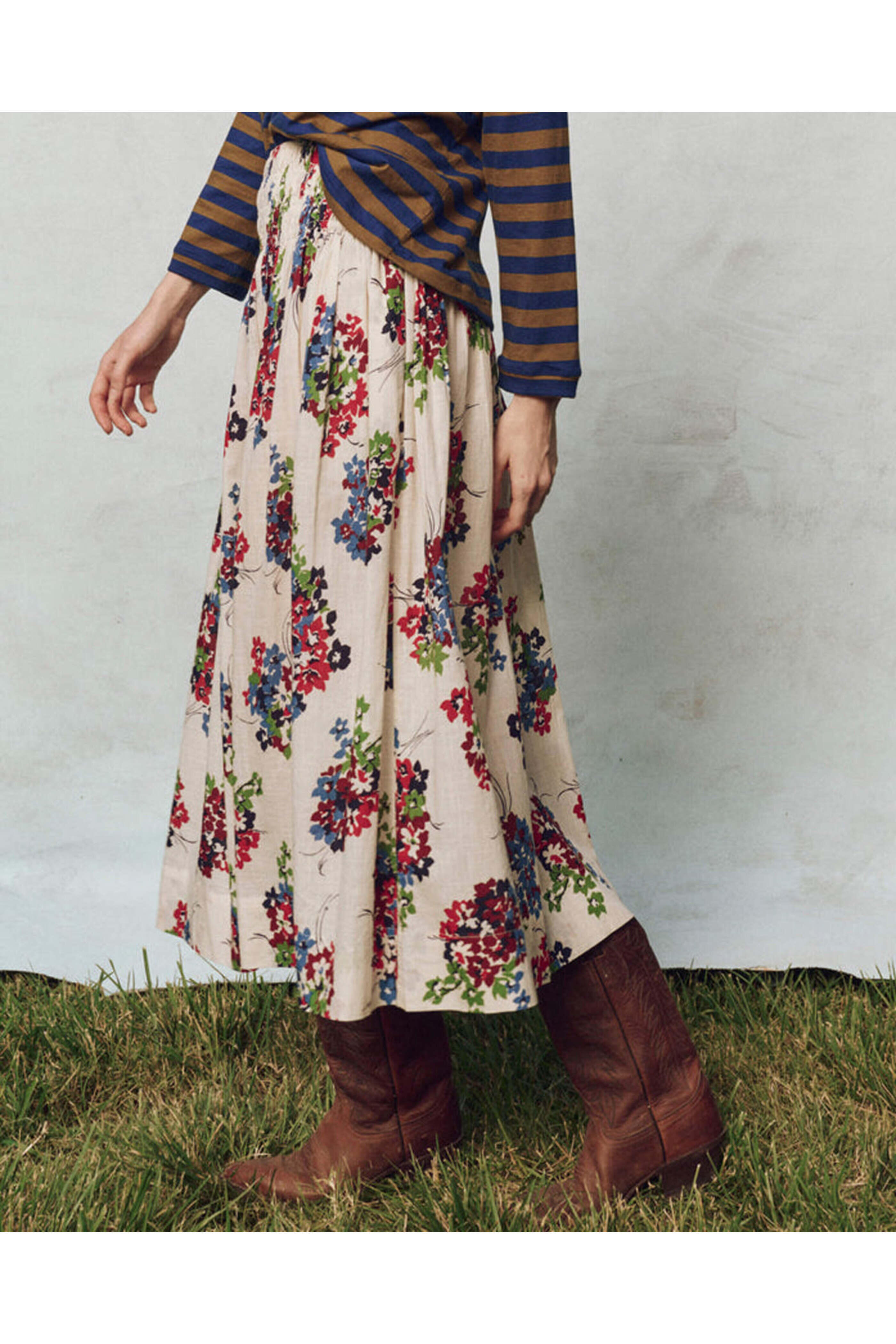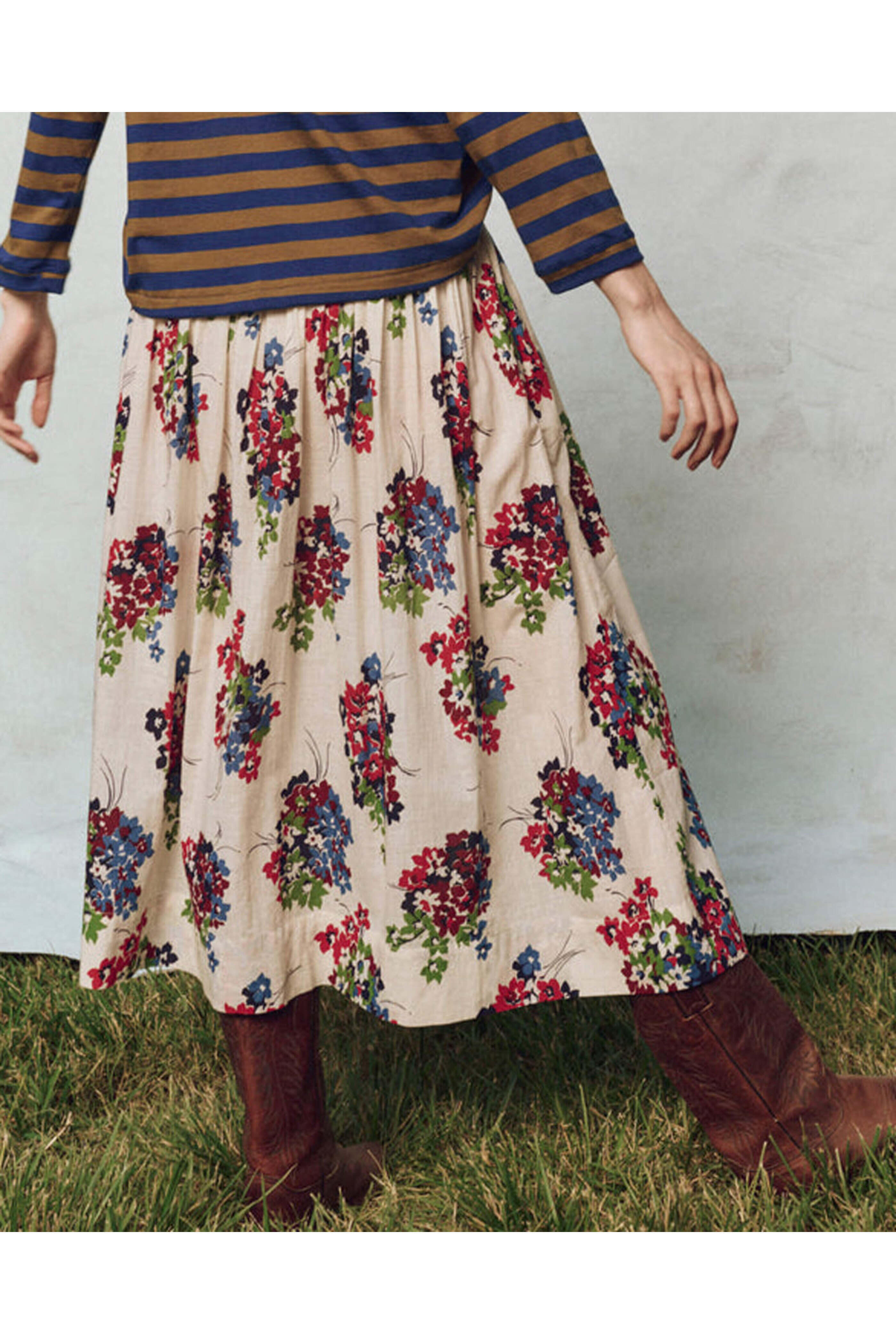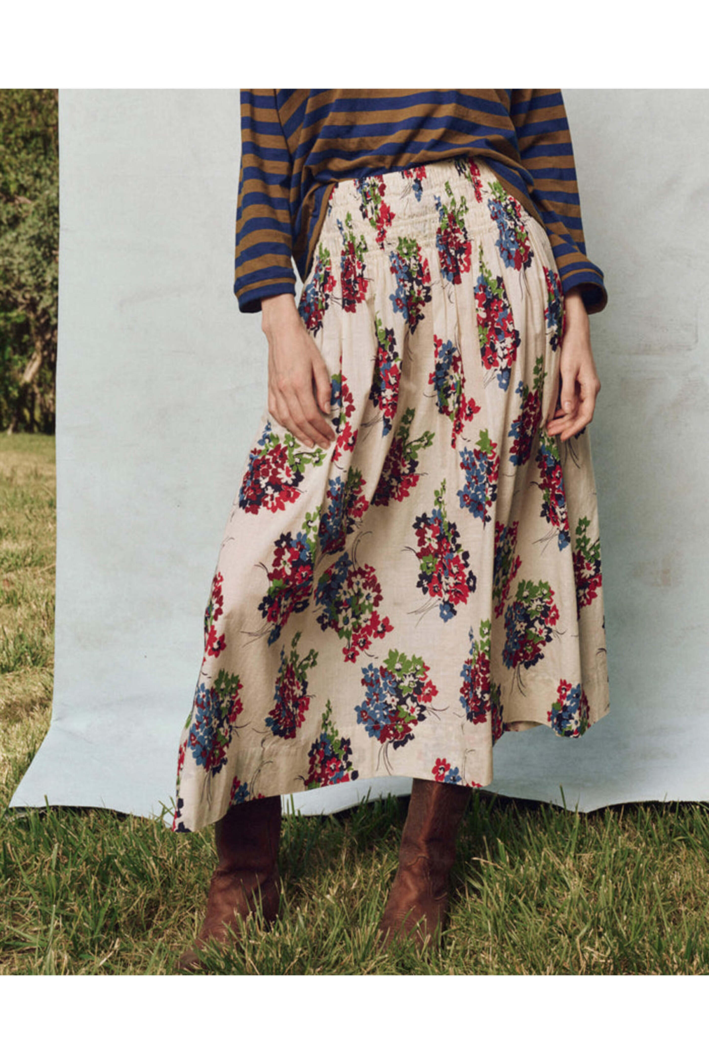 The Great Oasis Floral Viola Skirt. High rise. Smocked waist. Aline silhouette. Midi length. 100% cotton.