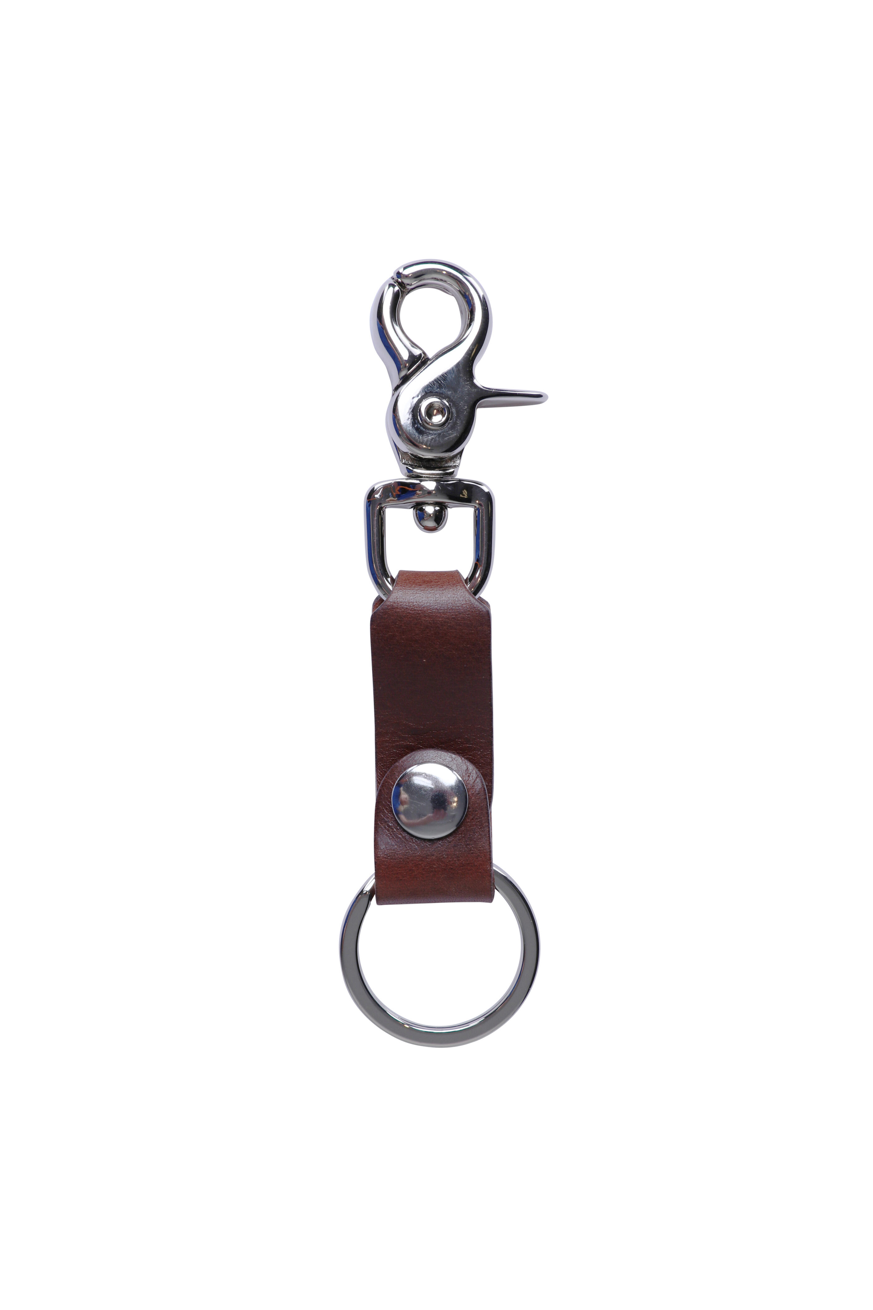 Hand-cut leather strap in a warm, classic chestnut hue. Nickel swivel clasp and key ring provide polished functionality. Secure snap-loop allows for quick attachment or release. Heritage-inspired and ideal for gifting or everyday carry. Designed and handcrafted in the USA.