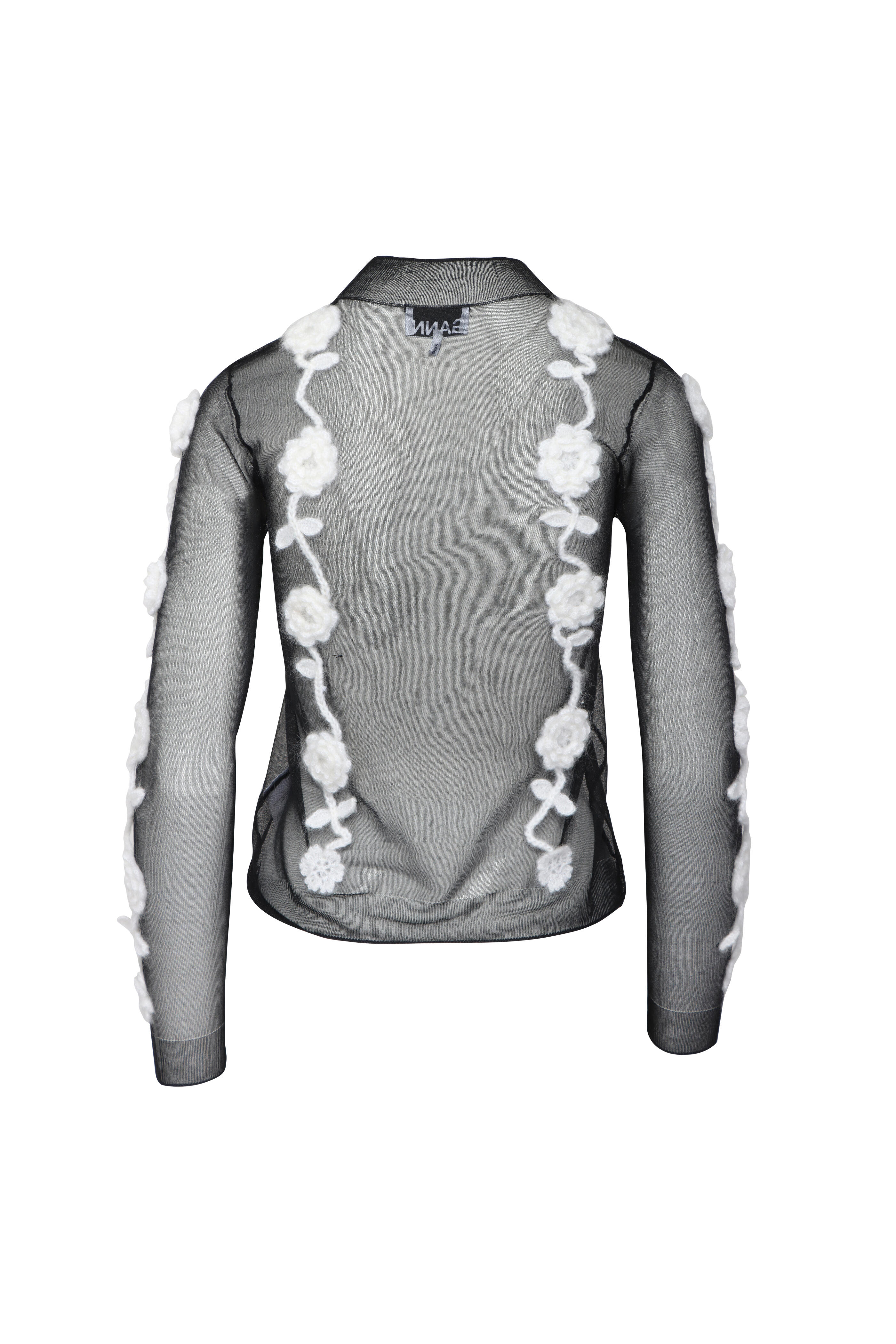 Round neck. Long sleeves. Relaxed fit. Straight hem. Crochet flower detail. Sheer fabrication. Imported. 56% recycled polyamide, 28% mohair, 8% wool, 8% polyester. Dry clean.