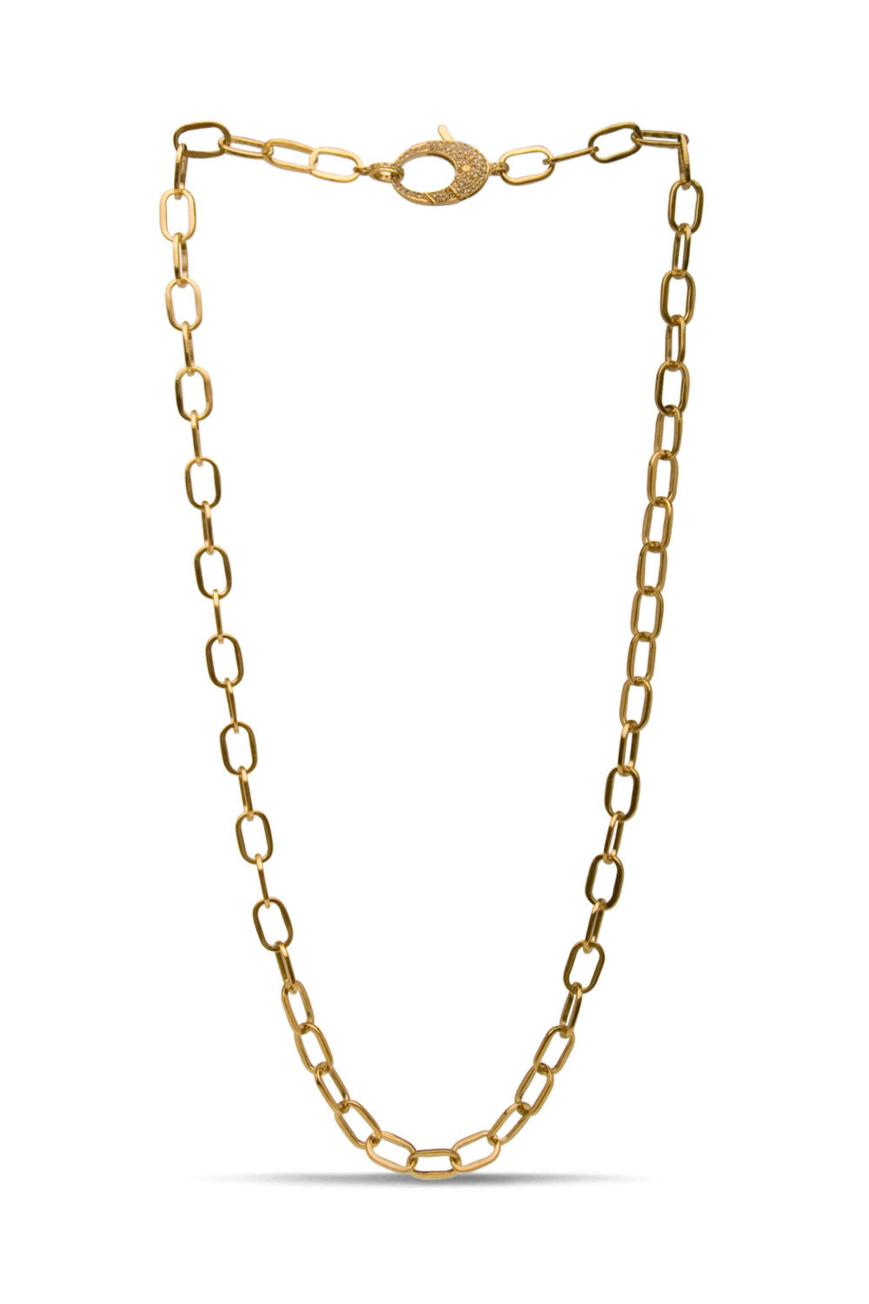 The Woods Fine Jewelry Small Brass and Diamond Chain Link Necklace. Brass. Diamond. Chain link. 24 L. Oversized lobster claw clasp.