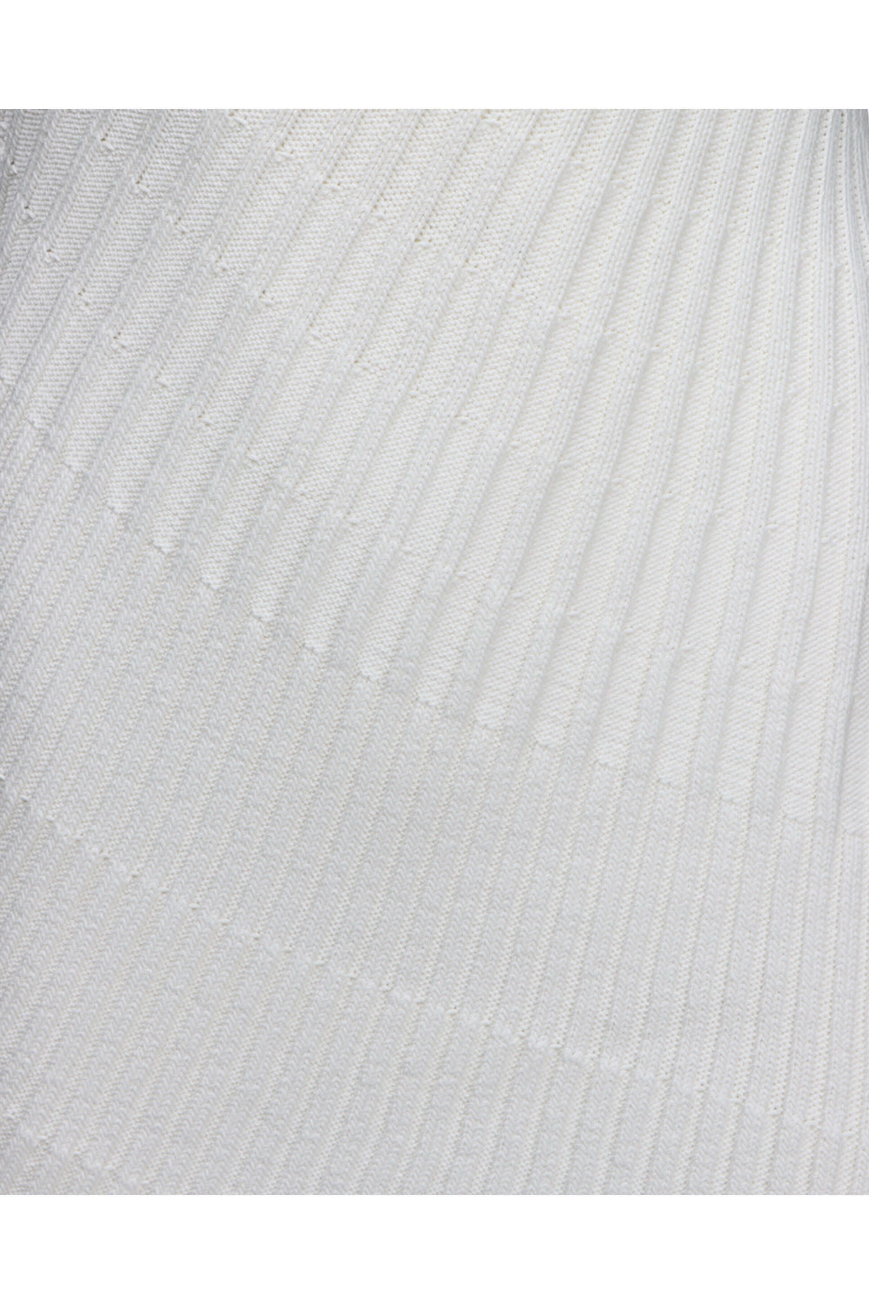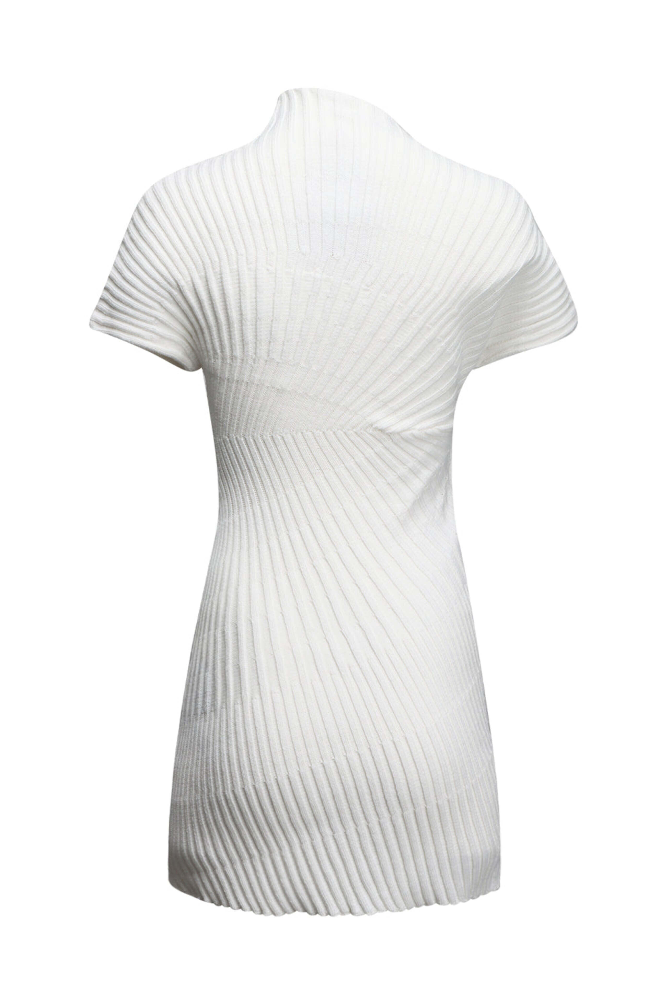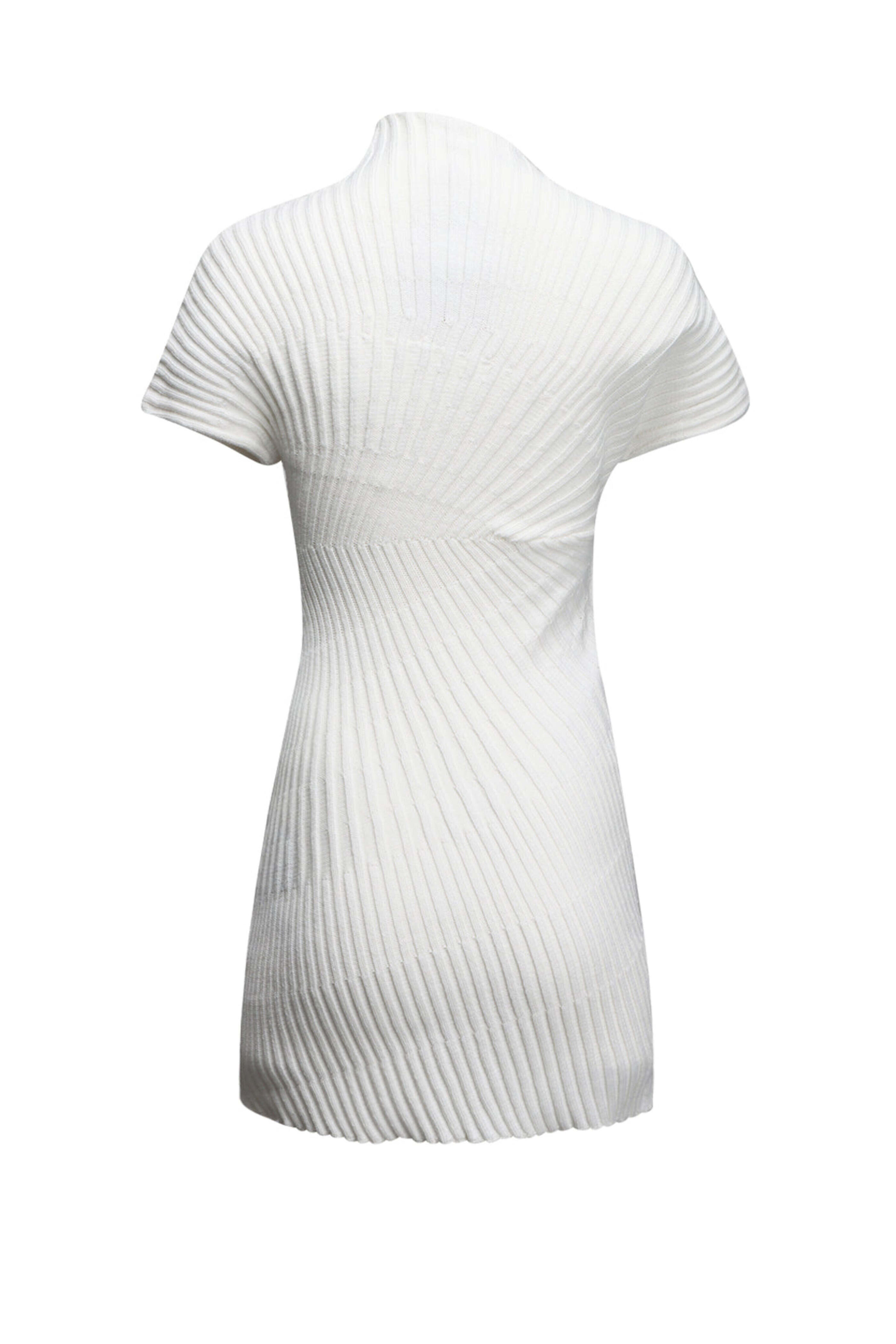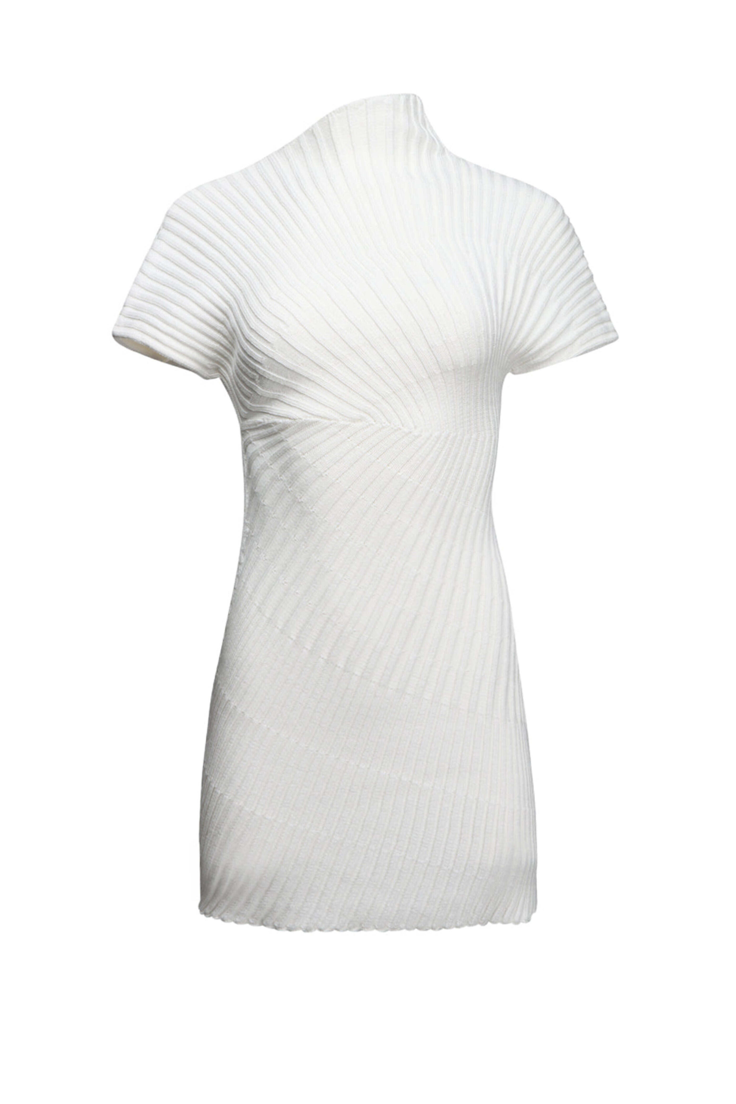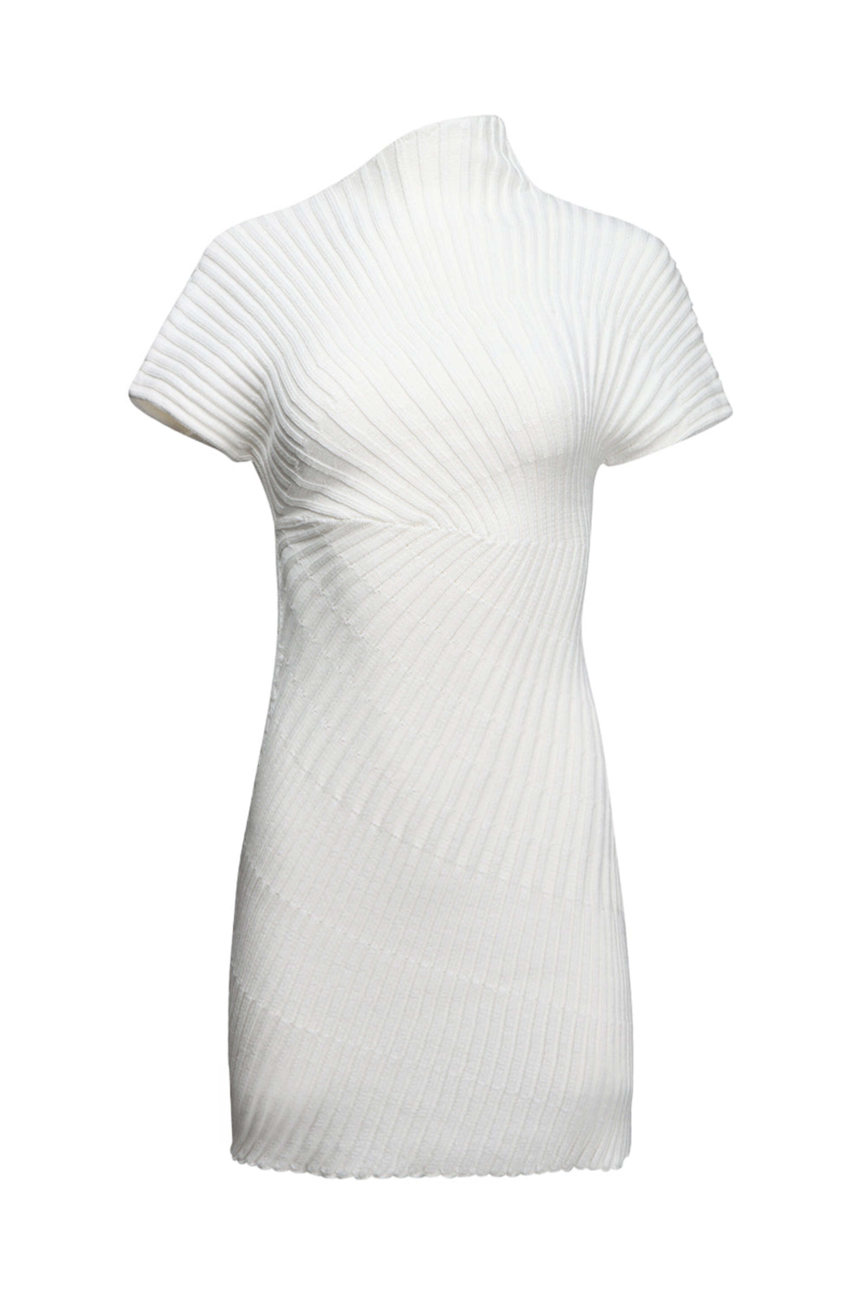 Cult Gaia Off White Luka Knit Dress. Asymmetrical mockneck. Short dolman sleeves. Slim silhouette. Mini length. Knit fabrication. 100% cotton.