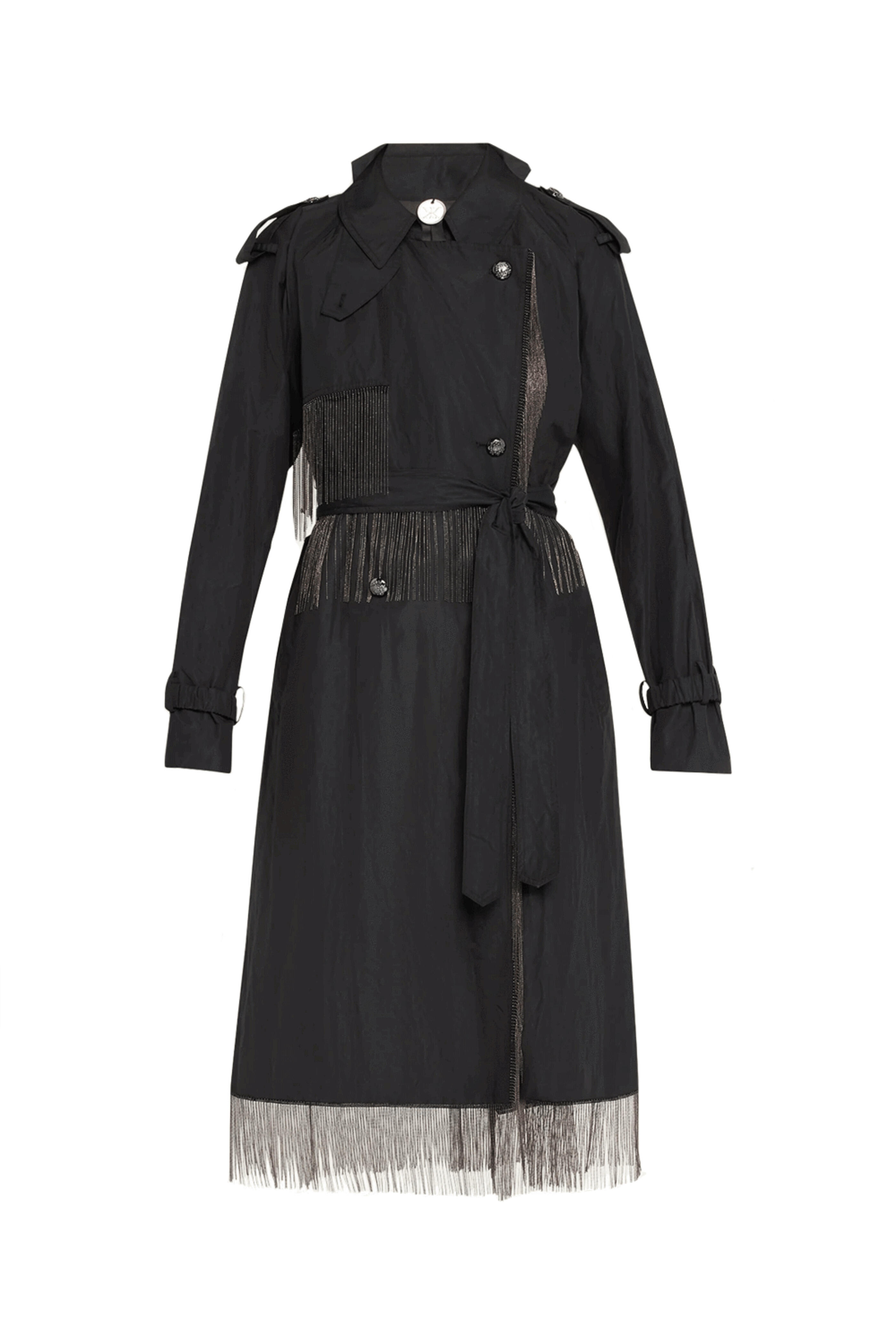 Kobi Halperin Black Crinkled Chain Fringe Coat . Spread collar . Button front . Shoulder epaulets . Long sleeves . Elasticized cuffs . Waist self-tie . On-seam pockets . Hem falls below the knee . A-line silhouette . Cotton/Amni® nylon/metallic fibers . Imported . Dry clean .