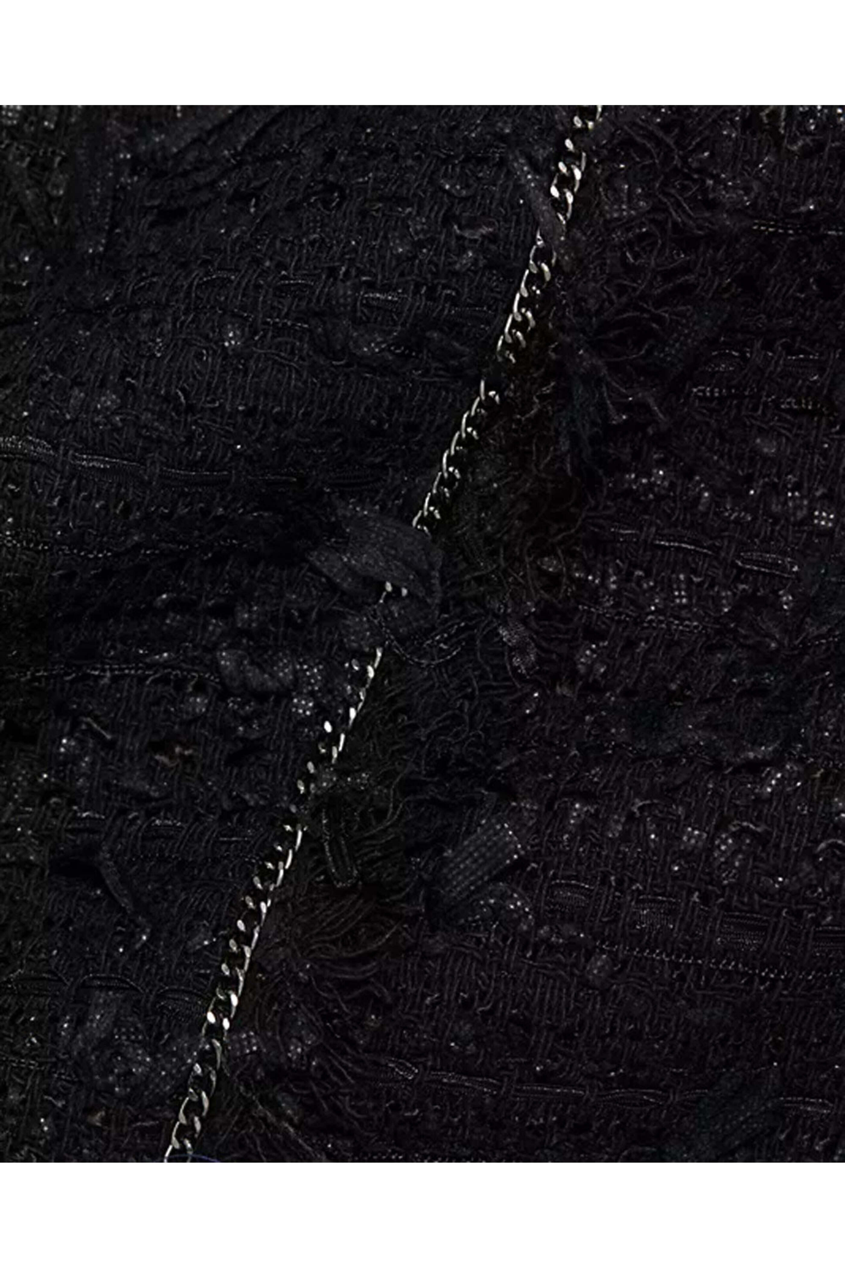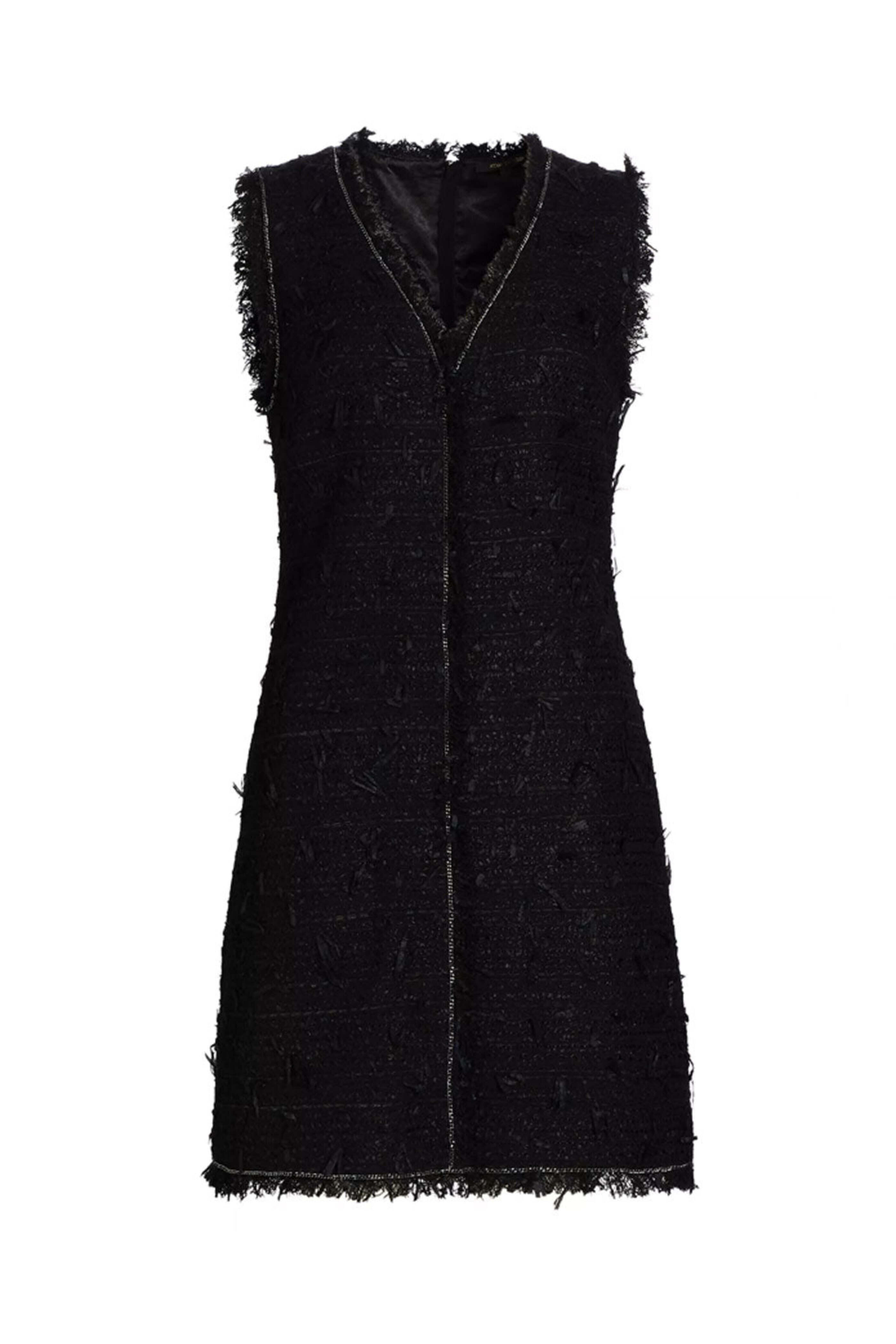 Kobi Halperin Black Lilo Dress . V-neck . Sleeveless . Frayed trim . Concealed back zip closure . 67% cotton, 26% nylon, 7% viscose . Lining: 93% polyester, 7% elastane .