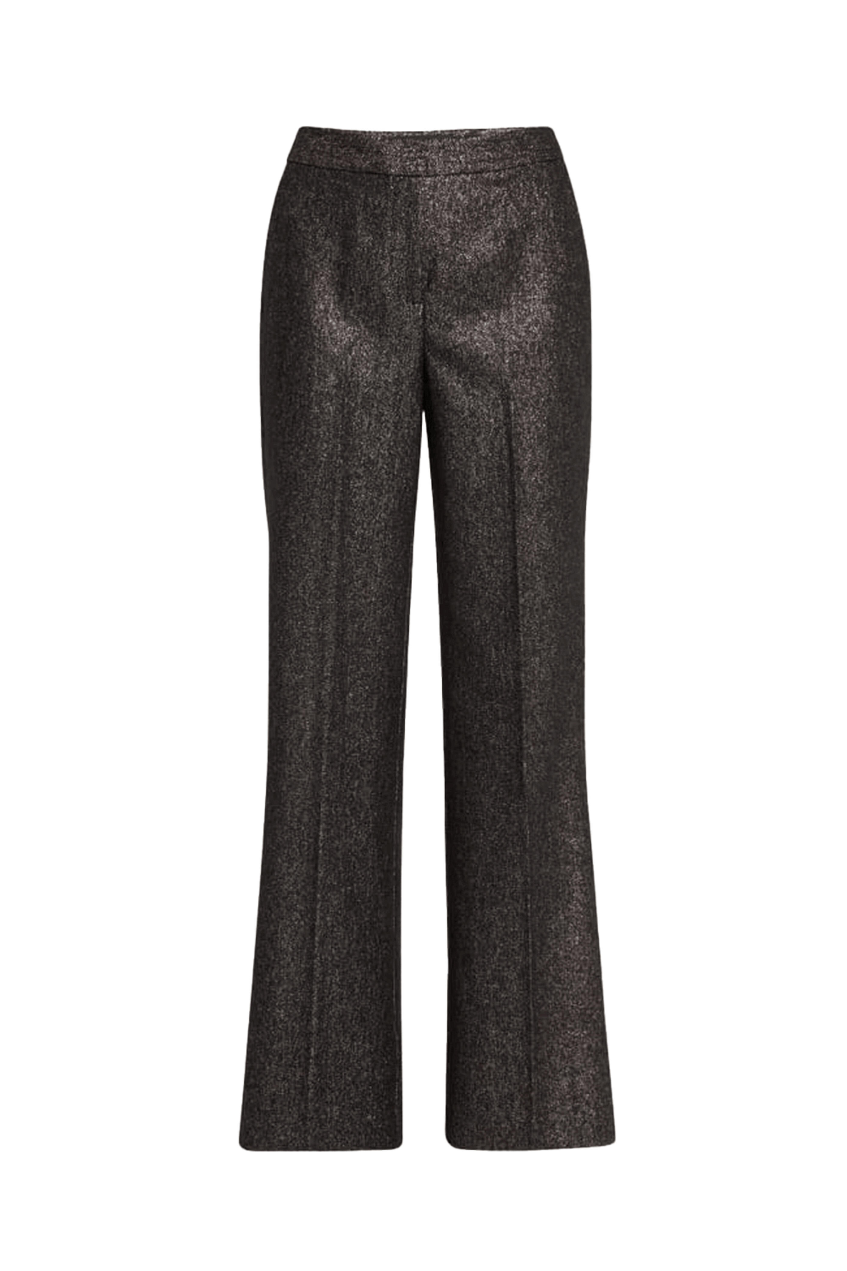 Kobi Halperin Metallic Misha Flare-Leg Pants . Mid-rise . Flat front . Side slant pockets . Back welt pockets . Full length . Flared legs . Invisible back zipper . Wool/nylon/polyamide/polyester . Lining: Polyester . Imported . Dry clean .