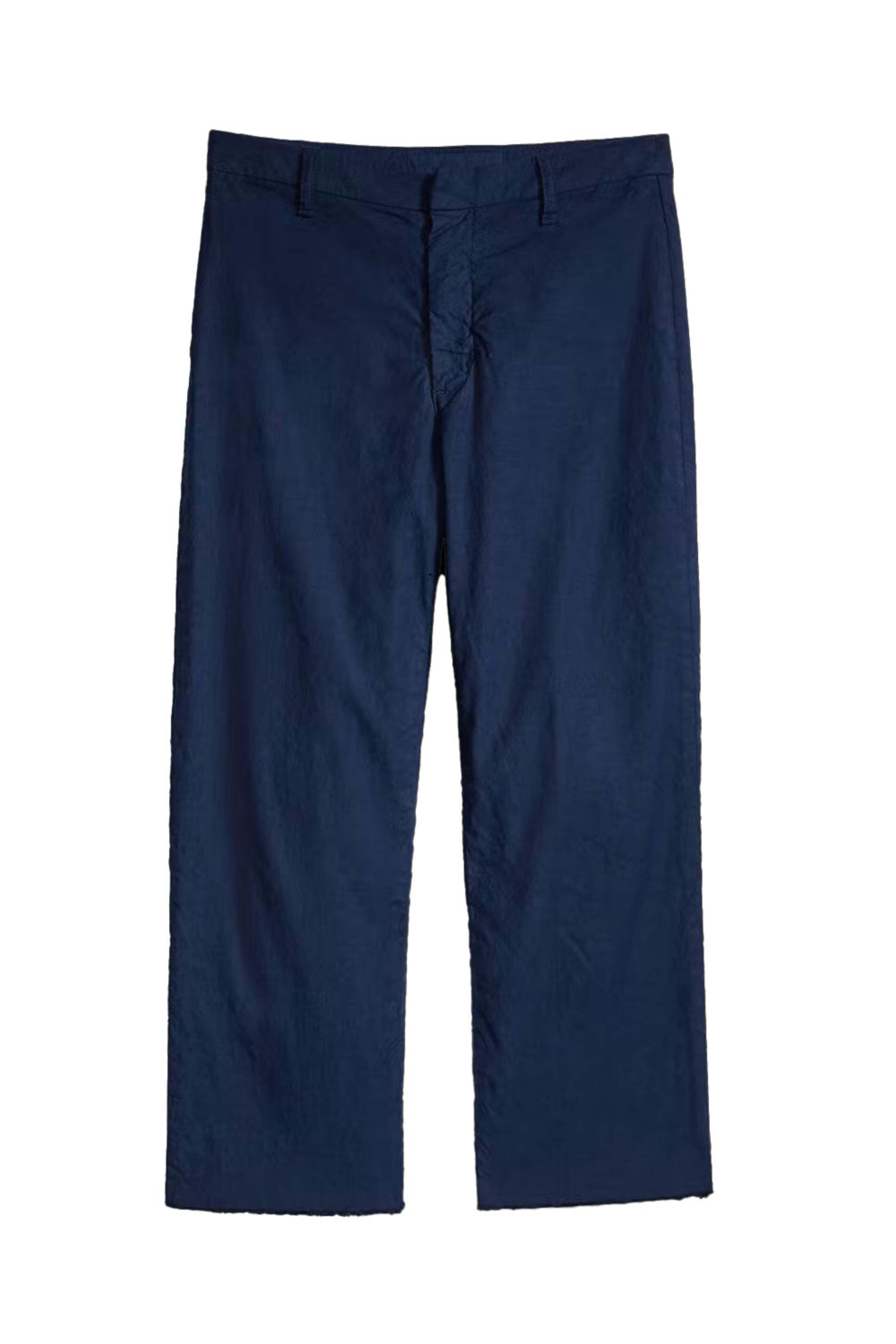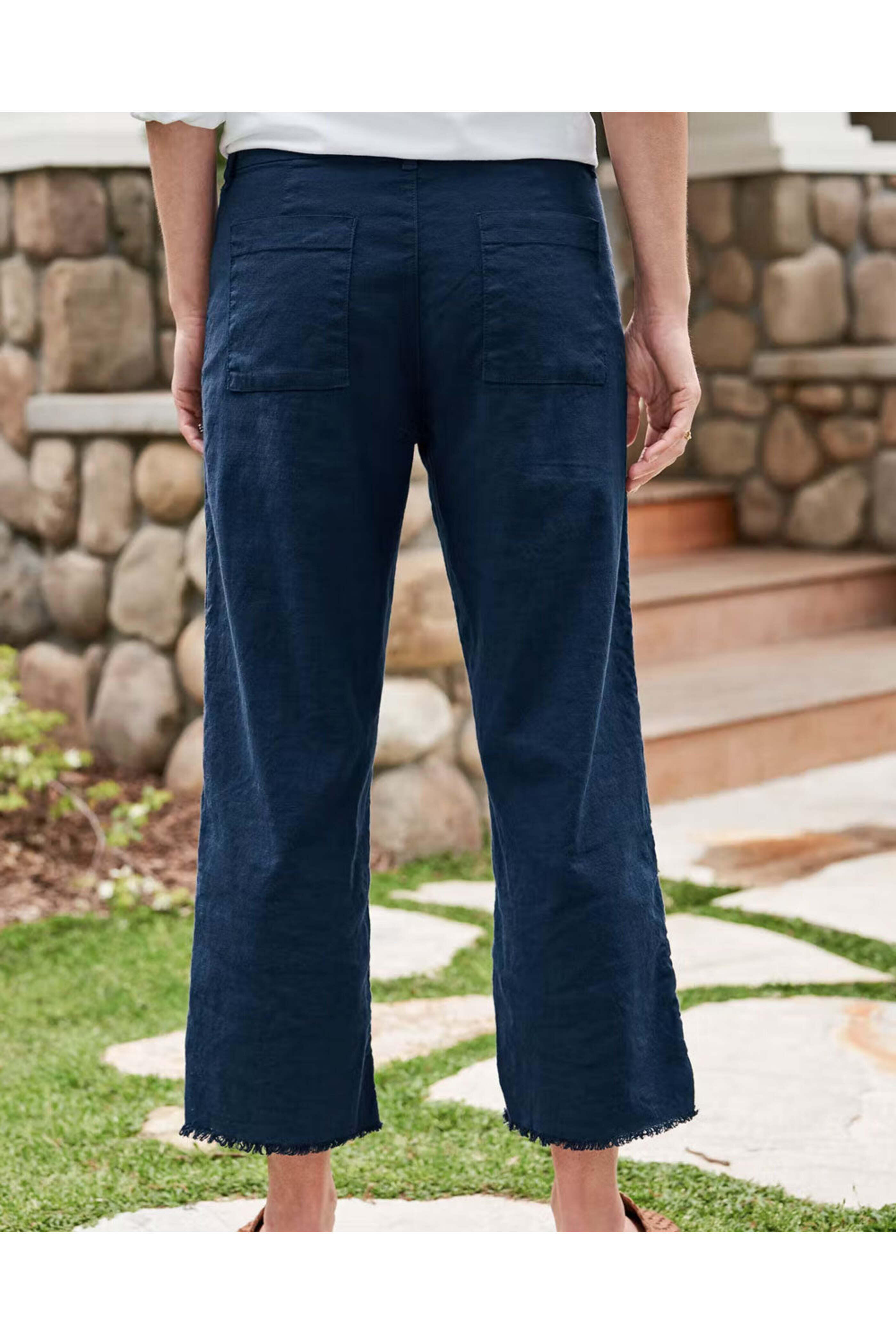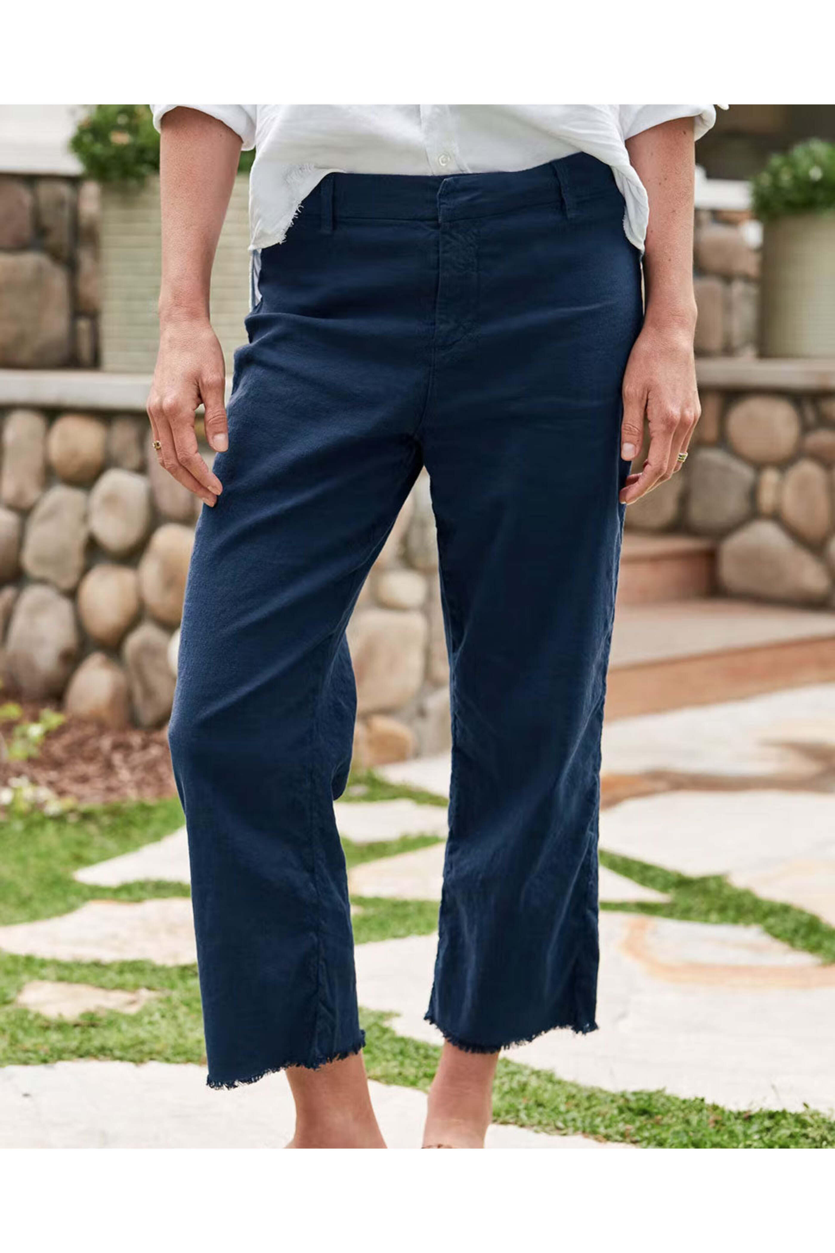 Frank & Eileen Navy Kinsale Straight Pant. High rise. Hook and eye closure. Zip fly. Belt loops. Back patch pockets. Straight silhouette. Cropped length. Raw hem. Linen fabrication. 50% cotton, 48% linen, 2% elastane.