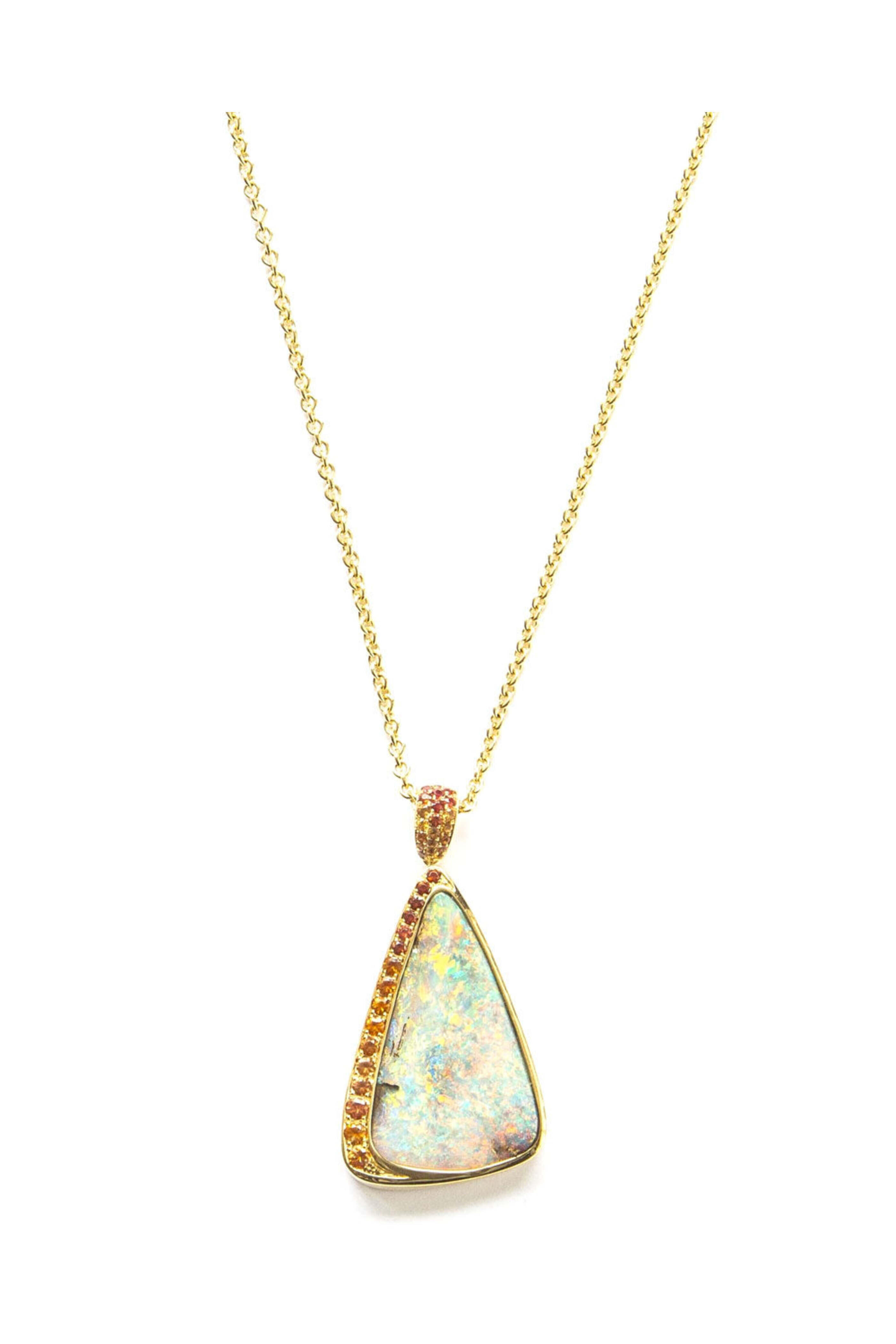 - Katherine Jetter Australian Boulder Opal and Garnet Pendant Necklace 18K yellow gold Australian boulder opal Garnet Ombre colored sapphire accent stones Large oblong pendant: 2" L x 1" W 28 chain Sliding bail Pastel Sunset Collection