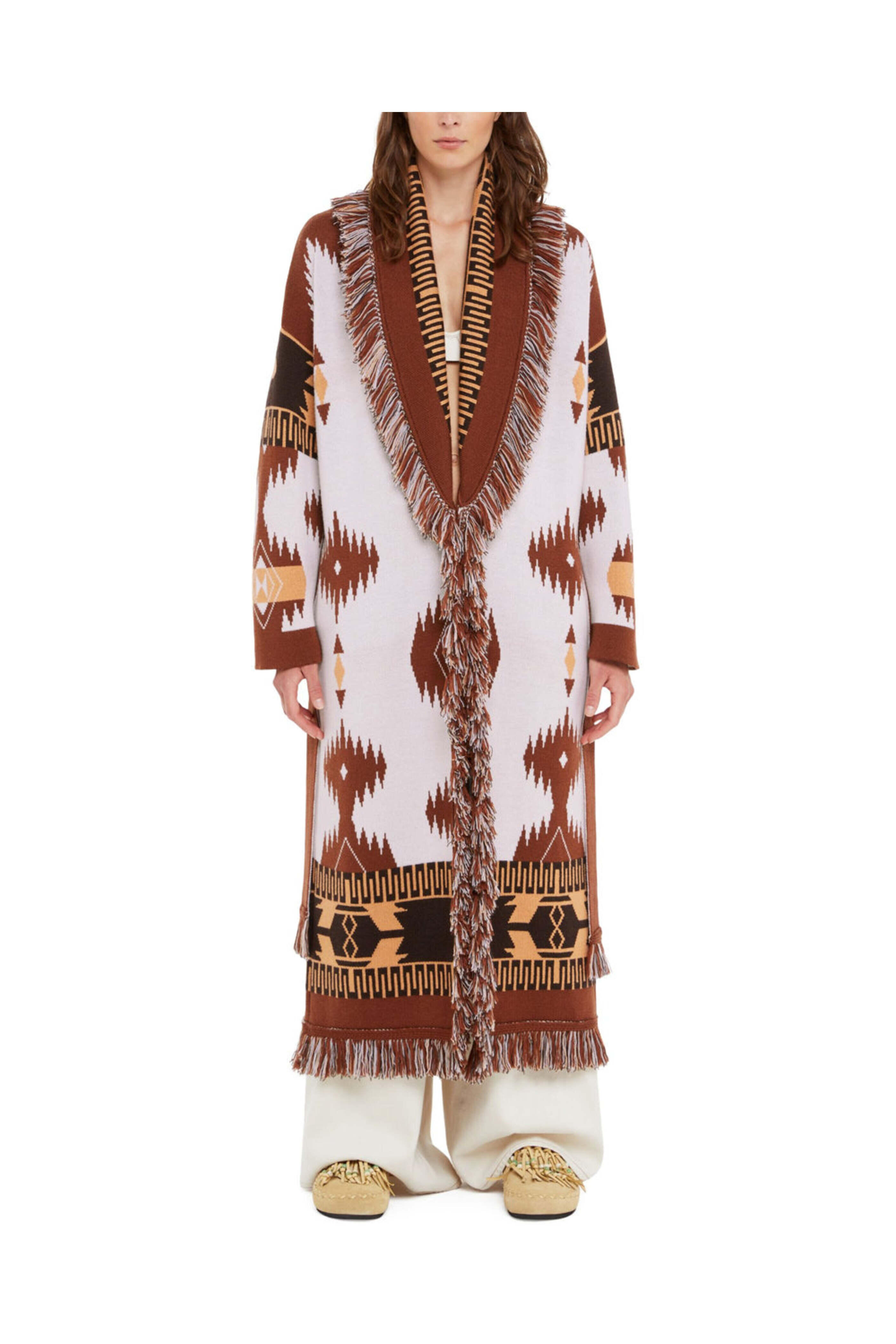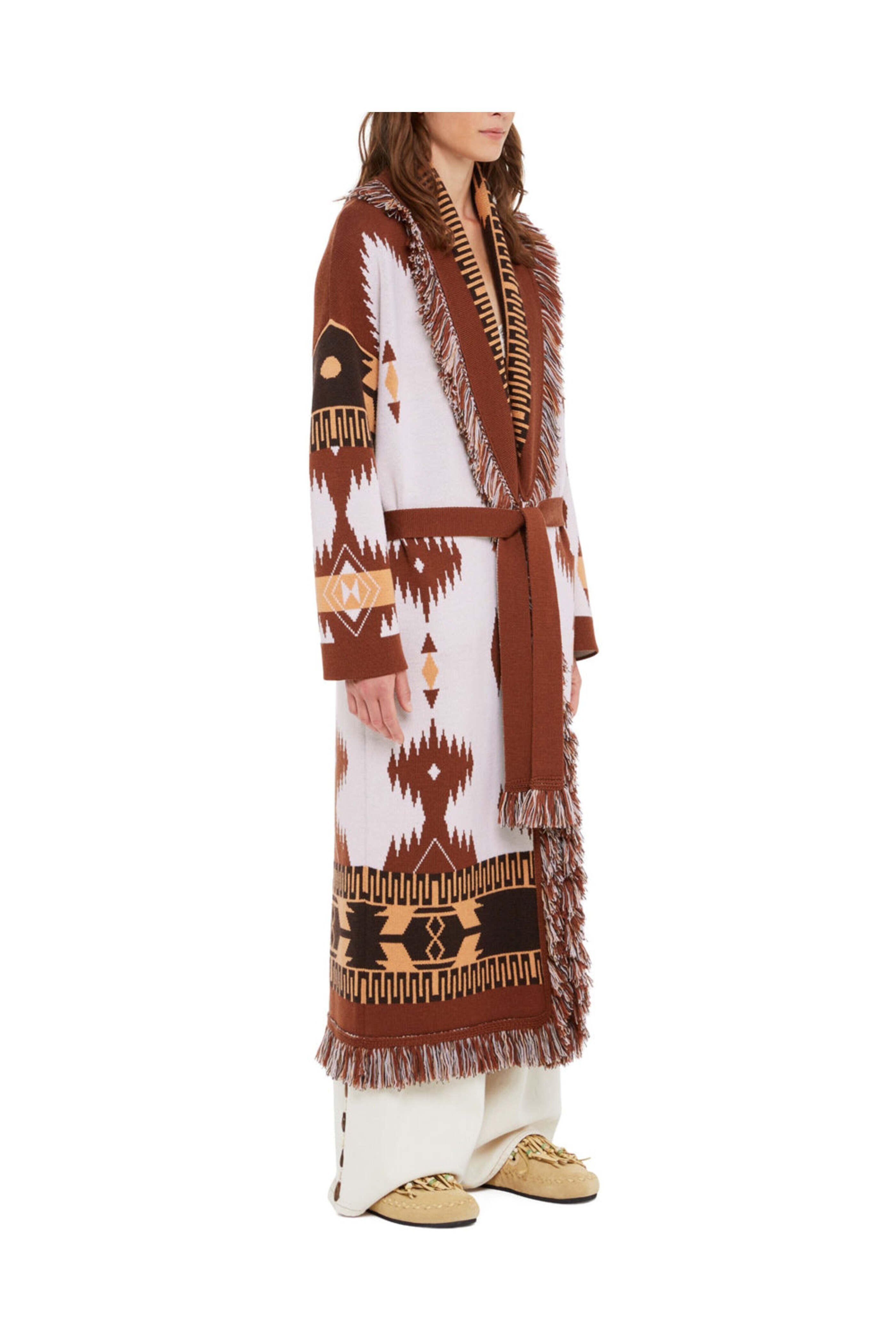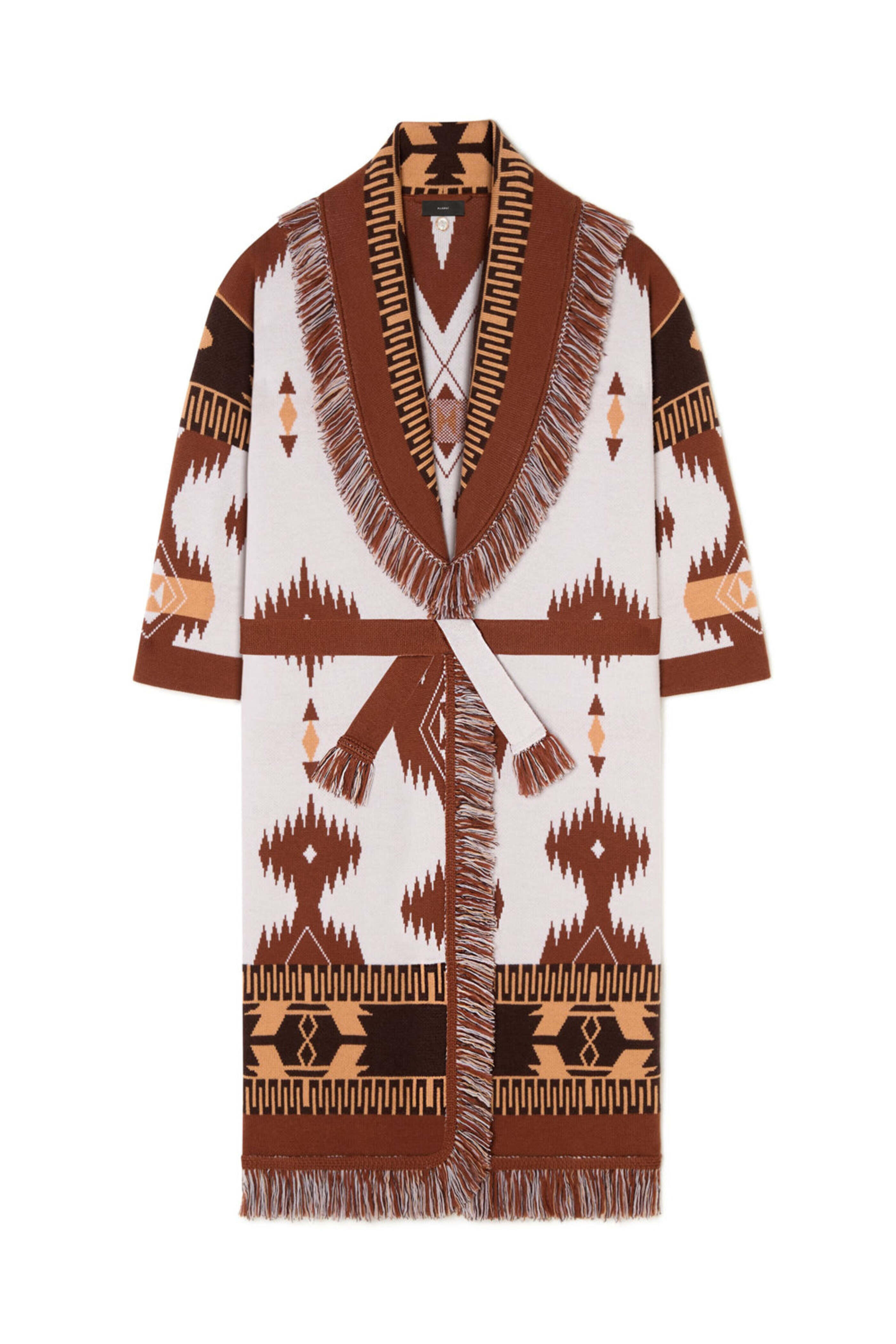 Alanui Chalk and Pecan Jacquard Icon Coat. Shawl collar. Drop shoulders. Long sleeves. Removable self-tie belt; self-fabrication. Fringe trim detail. Long length. Made in Italy. 100% virgin wool.