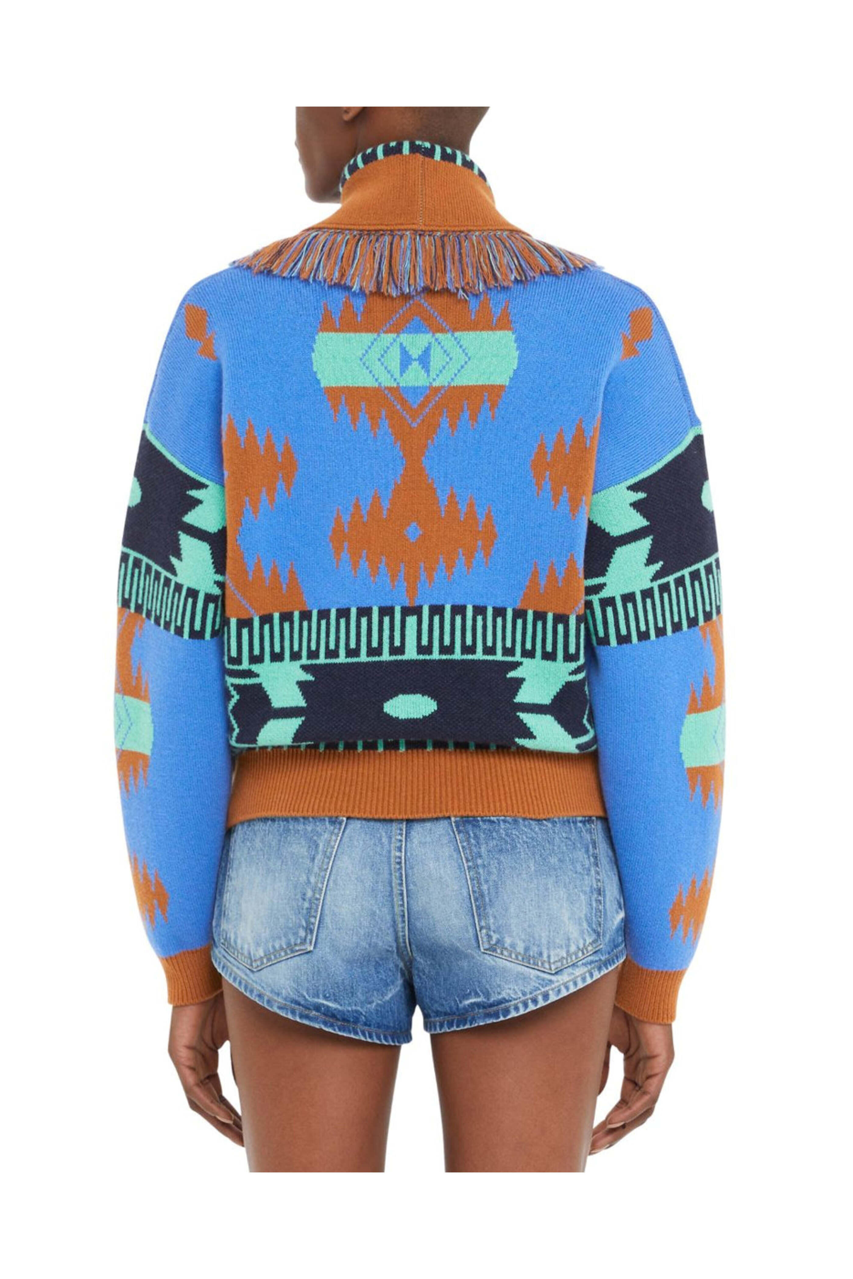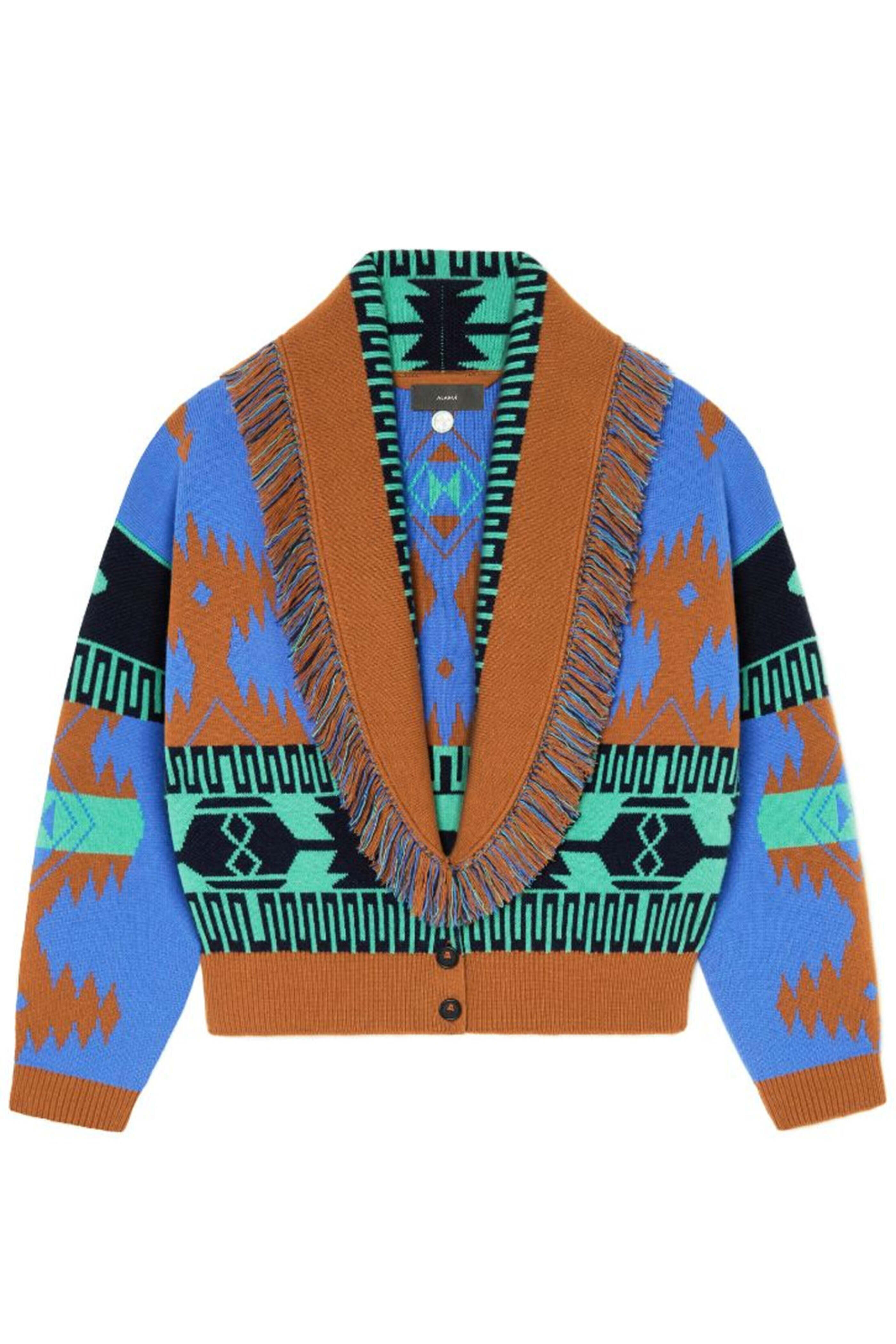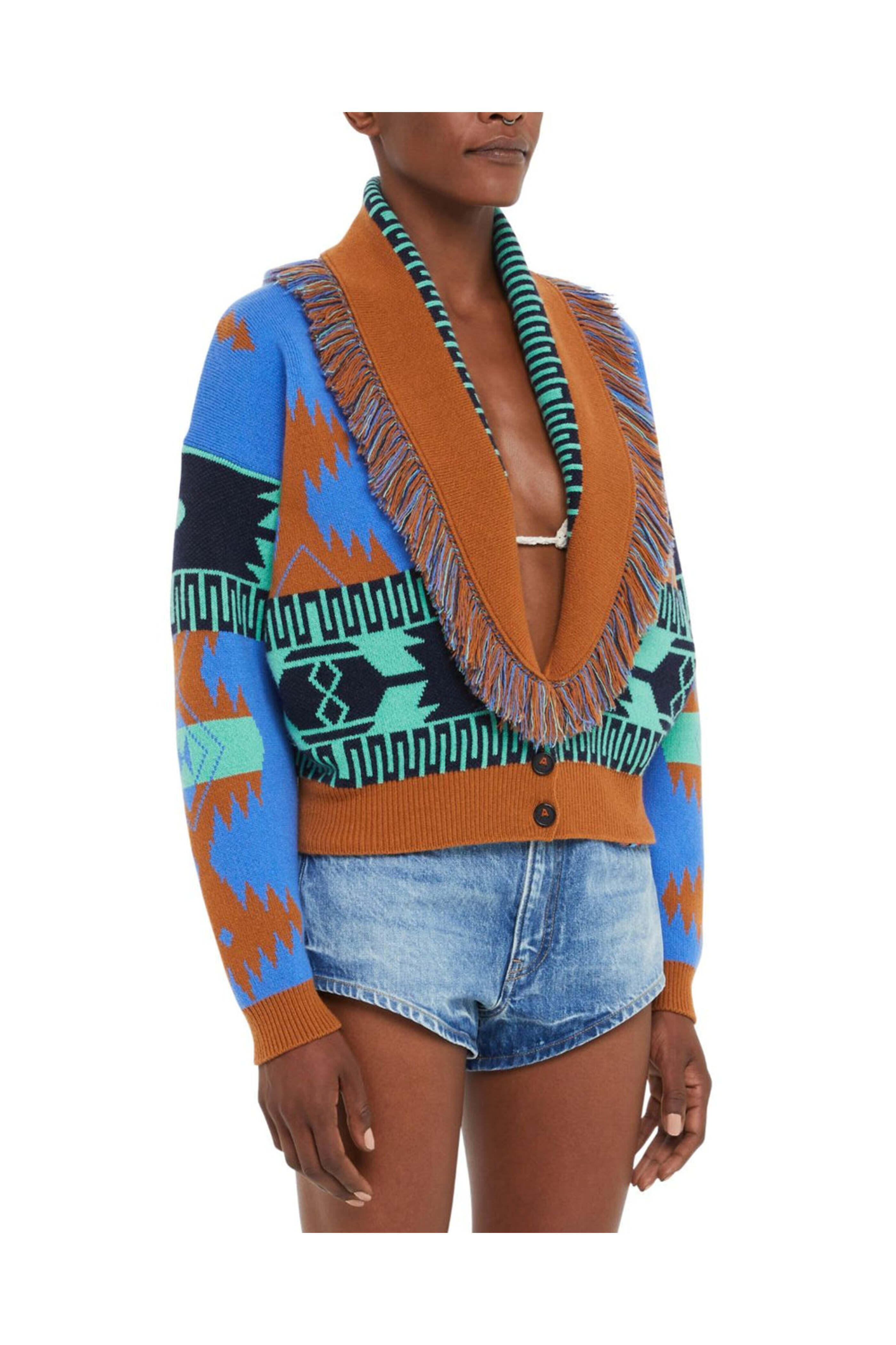 Alanui Cognac Jacquard Icon Cardibomber Cardigan. Shawl collar. Drop shoulders. Long sleeves. Button front closure. Fringe trim detail. Hip length. Made in Italy. 70% virgin wool, 30% cashmere.
