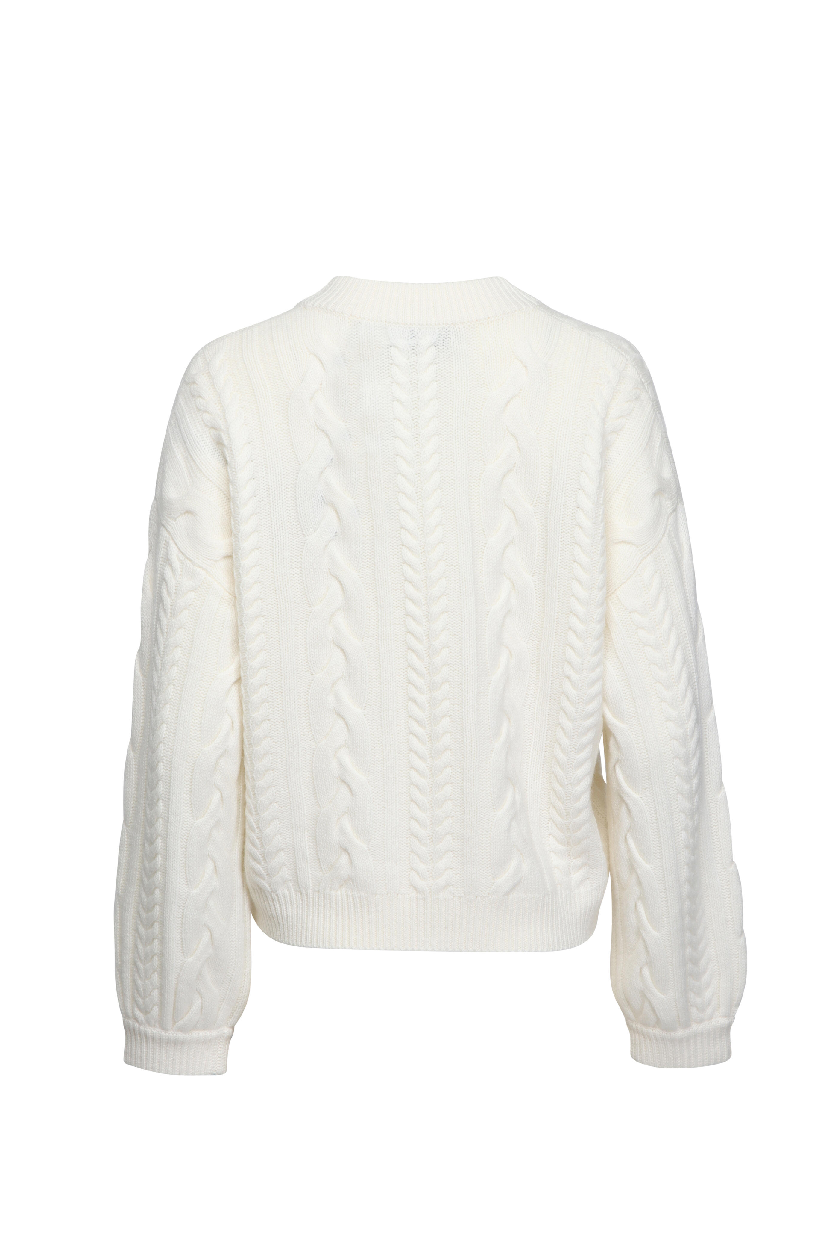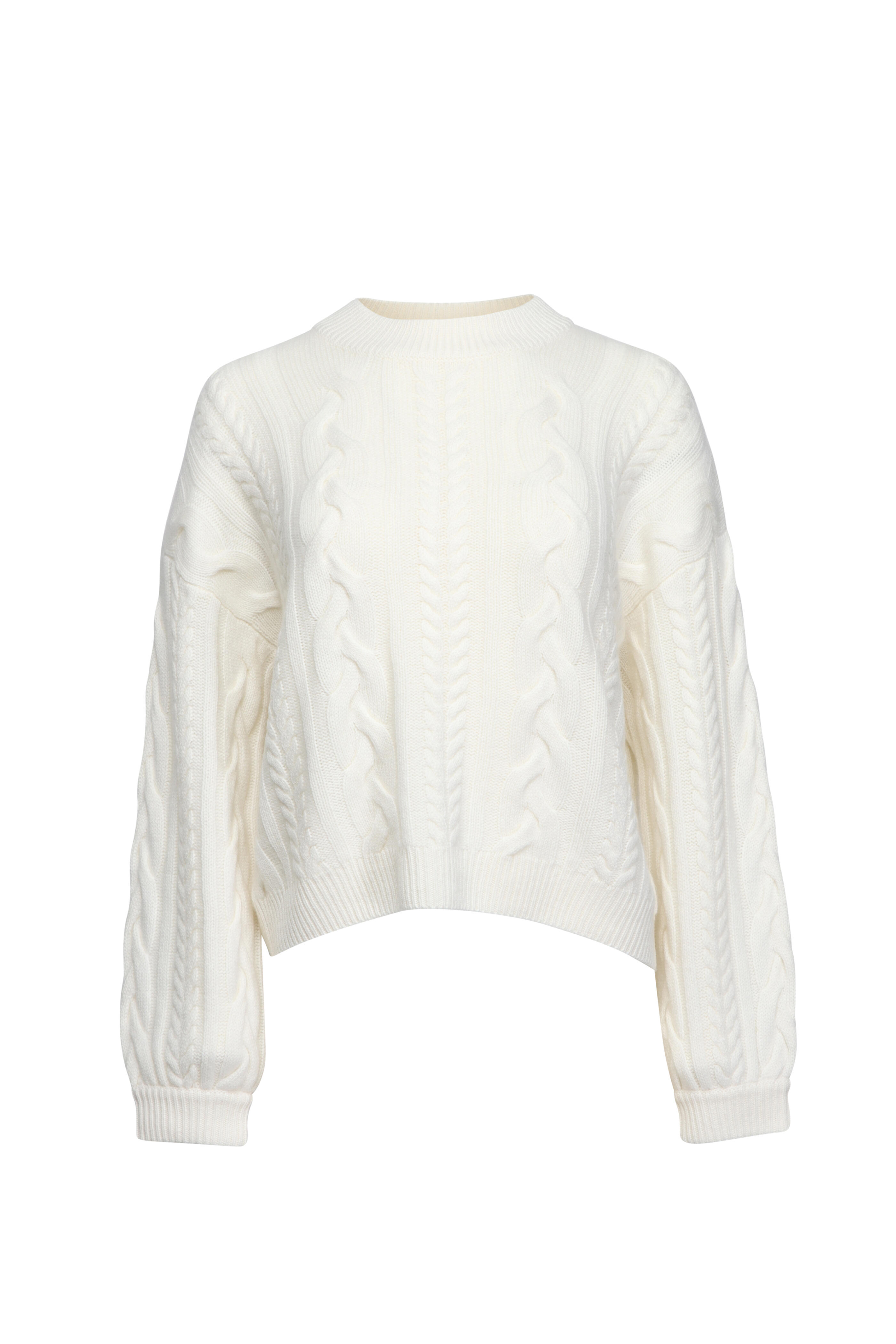 Crewneck. Drop shoulders. Long sleeves. Boxy fit. Ribbed neck, cuffs, and hem. Cableknit fabrication. Imported. 100% cashmere. Dry clean.