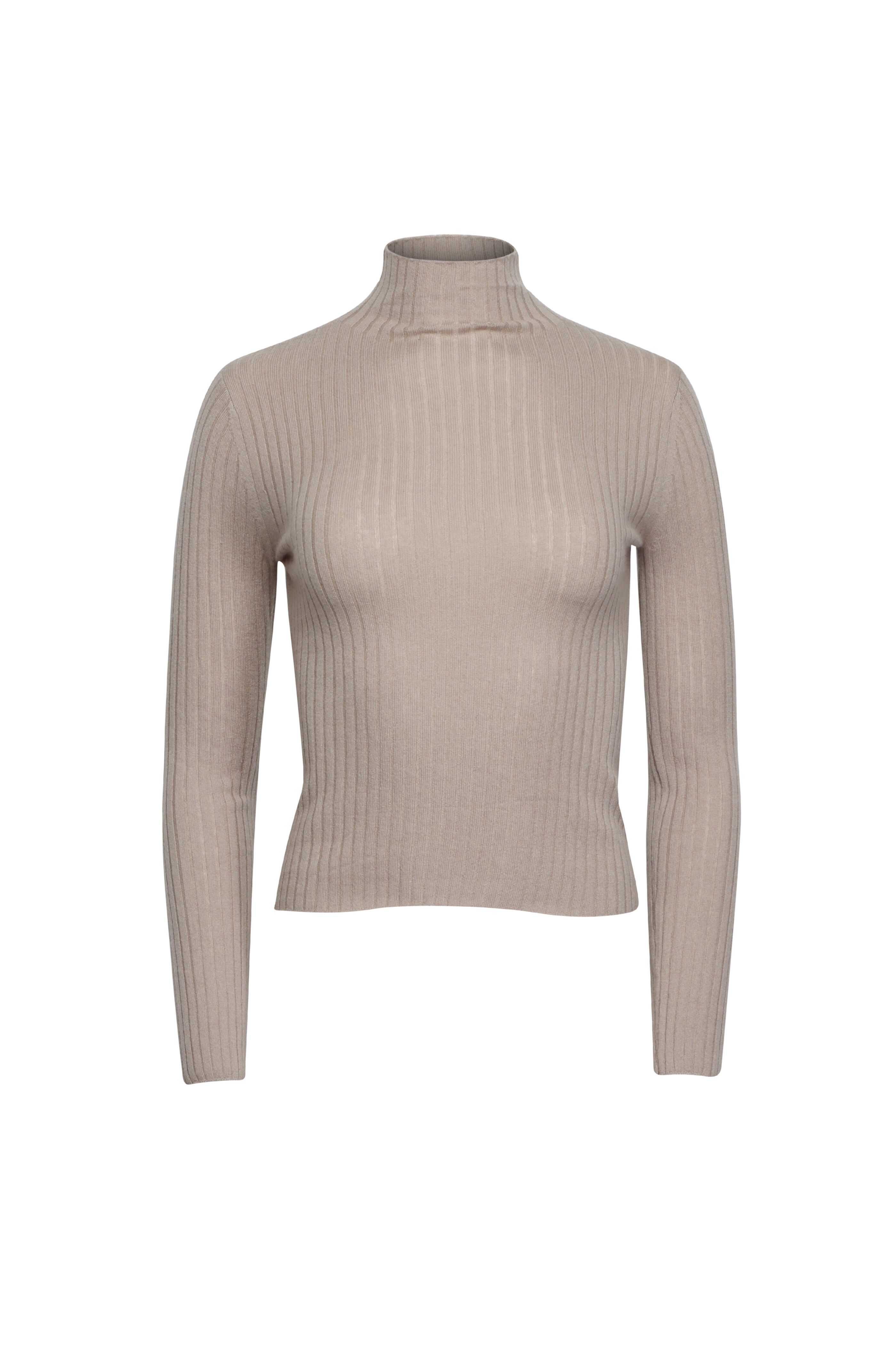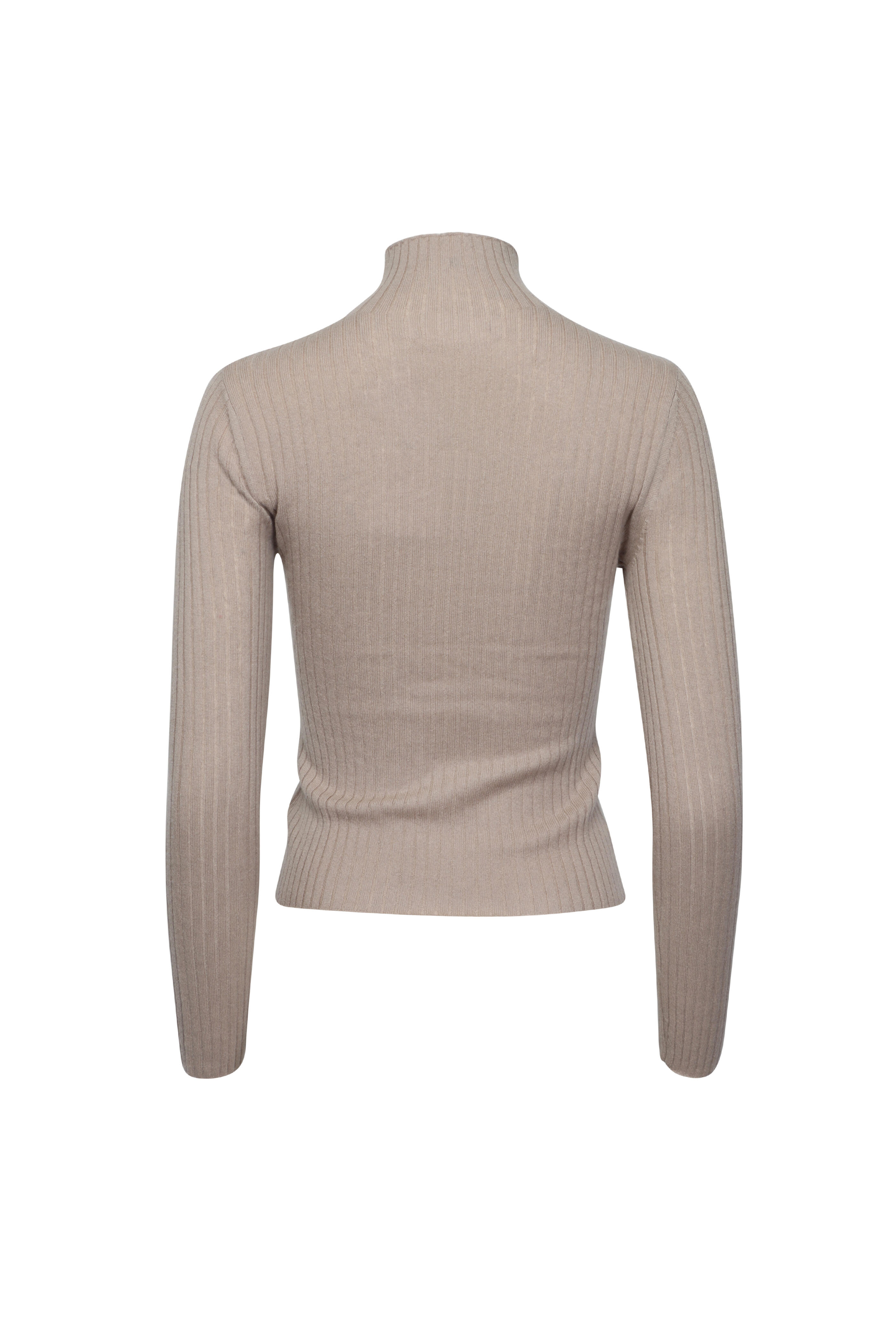 Funnel neck. Long sleeves. Slim fit. Ribbed throughout. Imported. 100% cashmere. Dry clean.