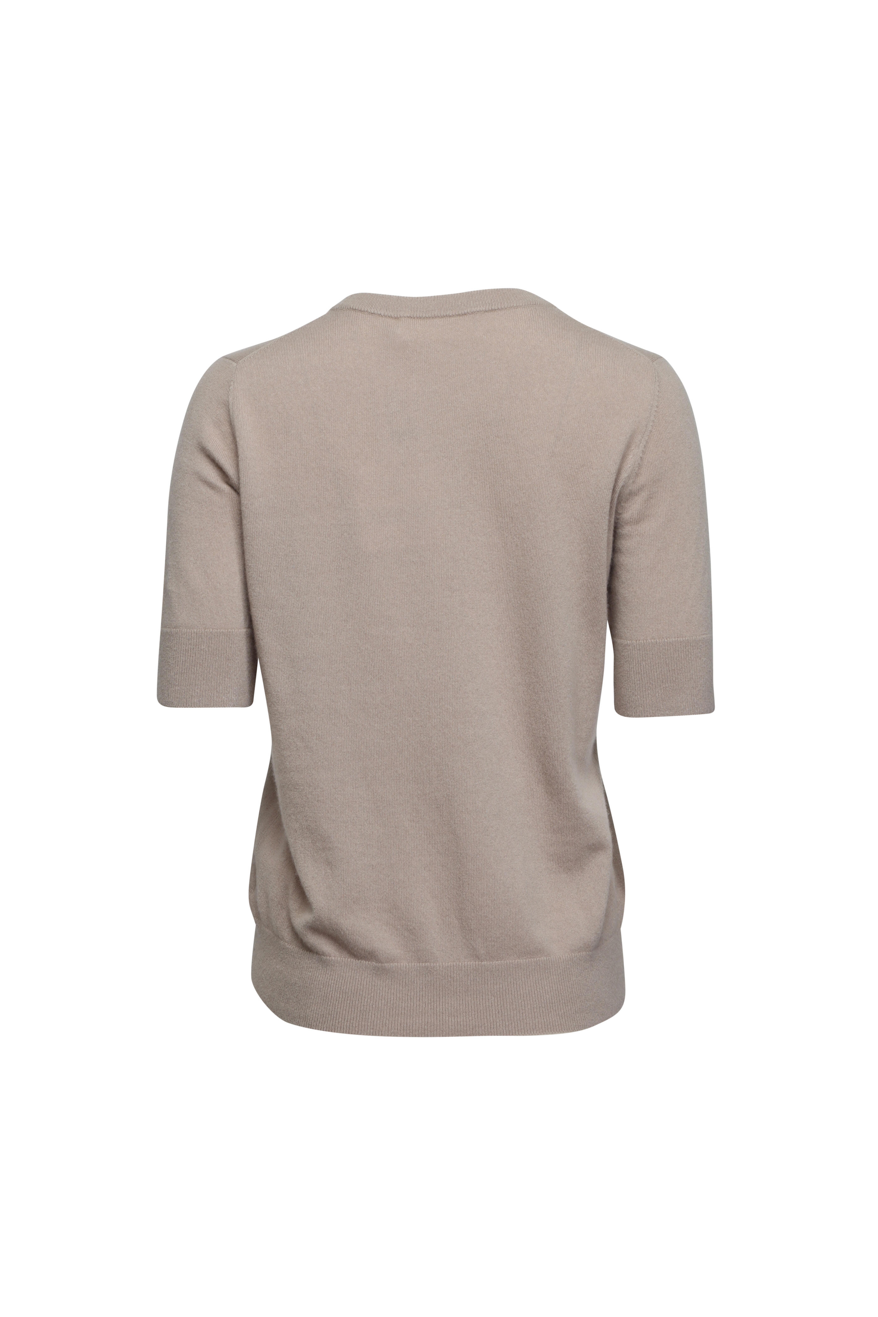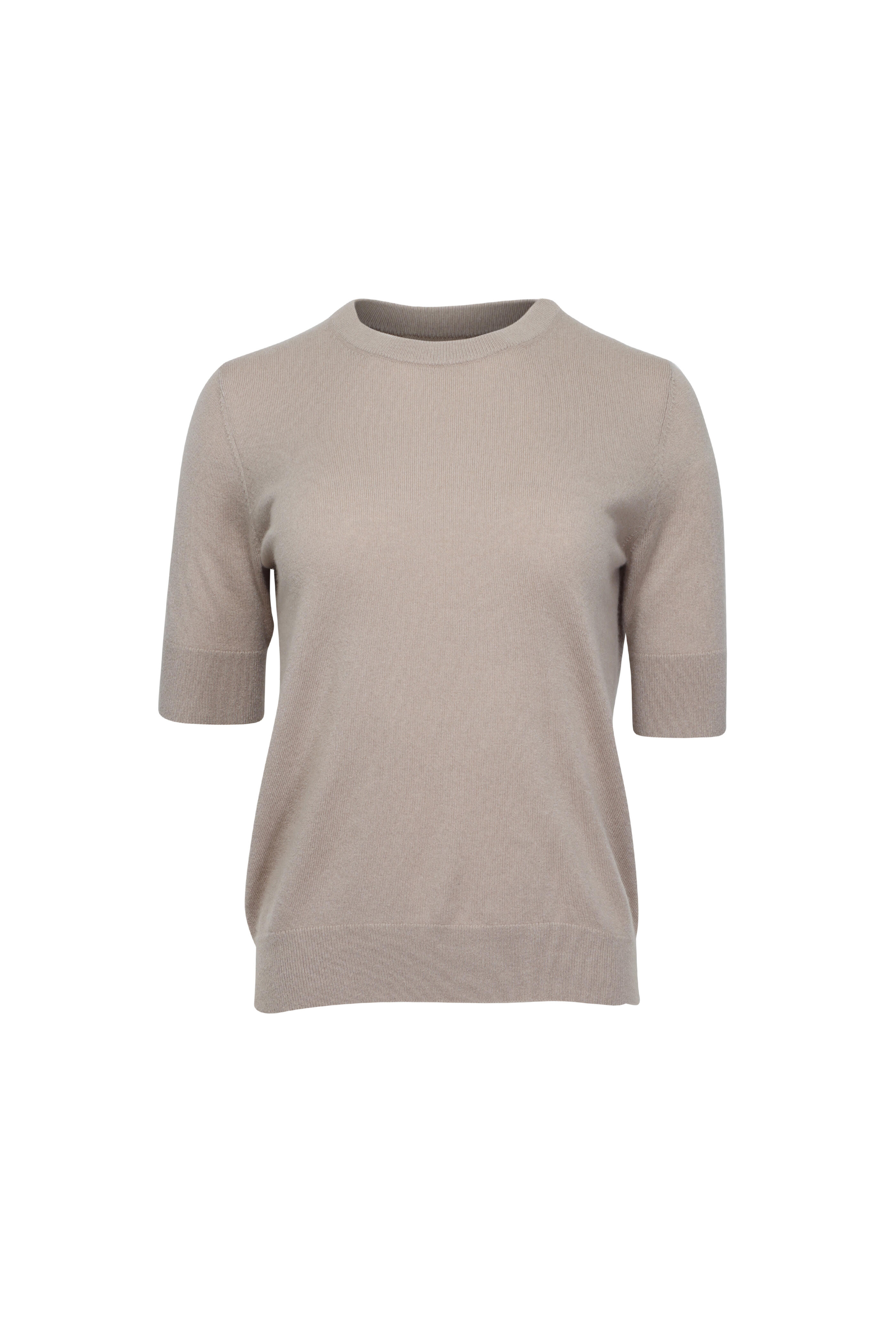 Crewneck. Short sleeves. Relaxed fit. Straight hem. Ribbed neck, cuffs, and hem. Imported. 100% cashmere. Dry clean.