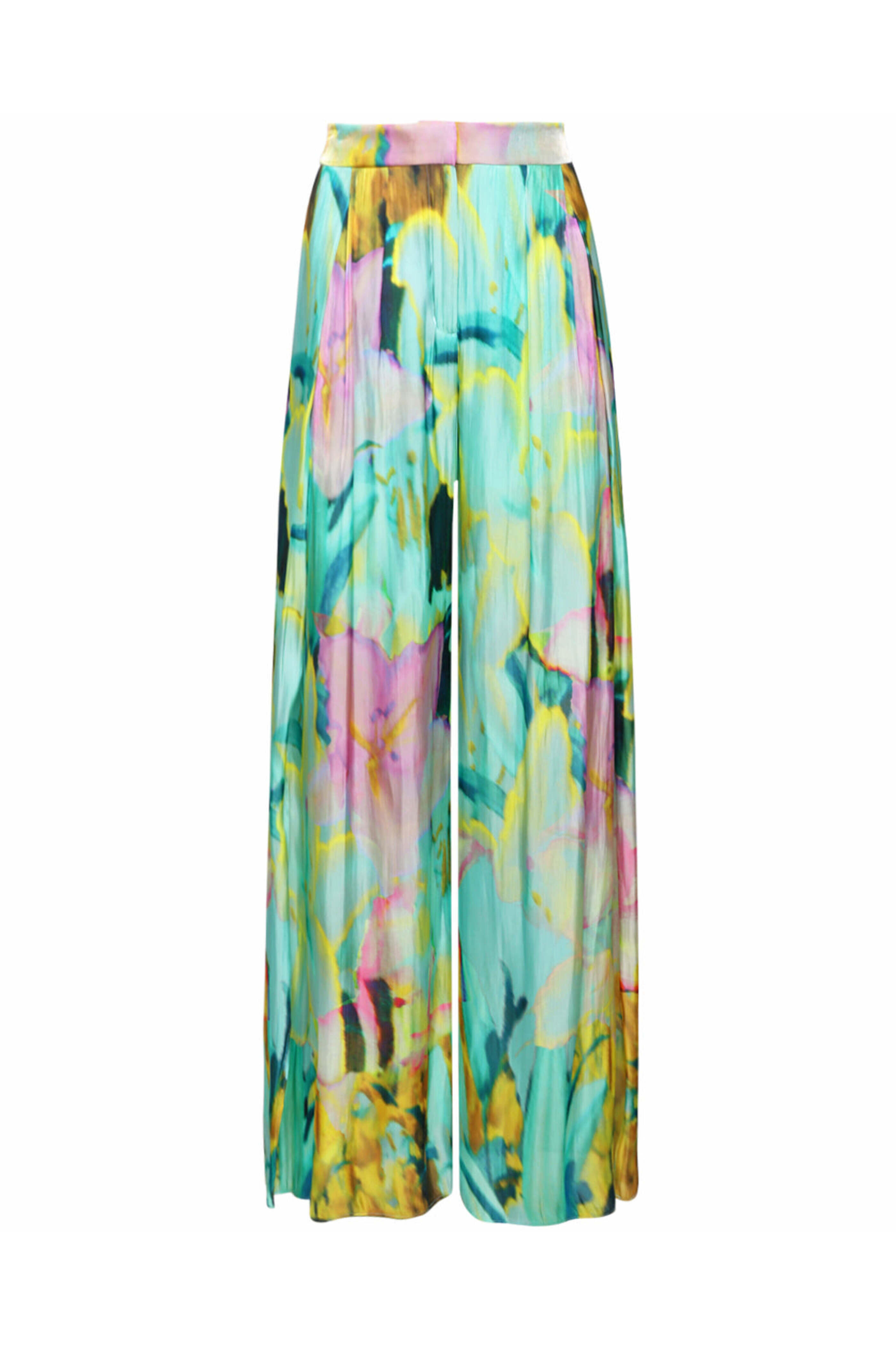 Kobi Halperin Capri Loretta Pant. High rise. Flat front waist. Back elastic waist. Hook and eye closure. Zip fly. Pleated throughout. Straight silhouette. Wide through leg. High side hem slits. Full length. Partially lined. 100% polyester outer, 97% polyester, 3% elastane lining.