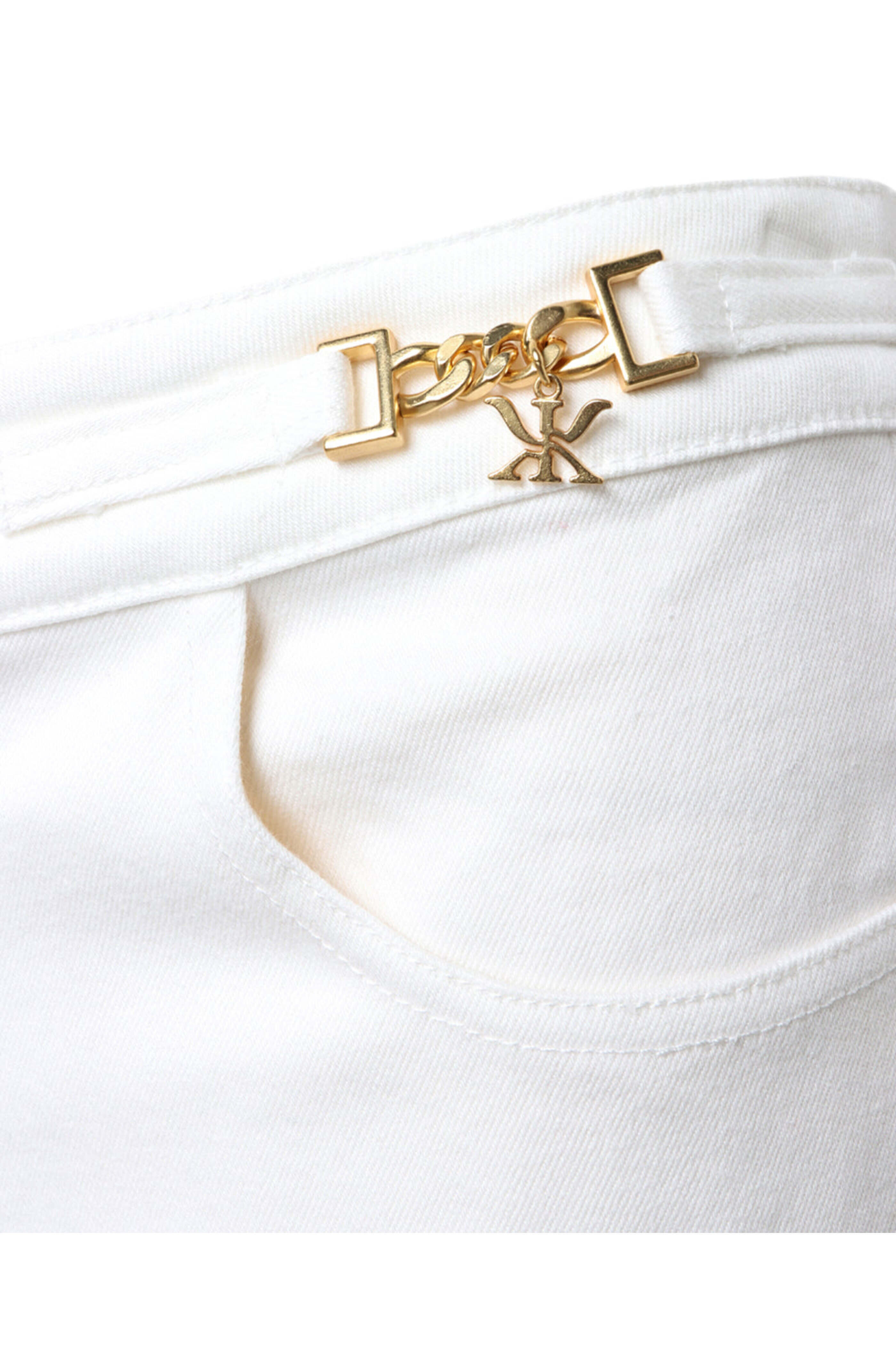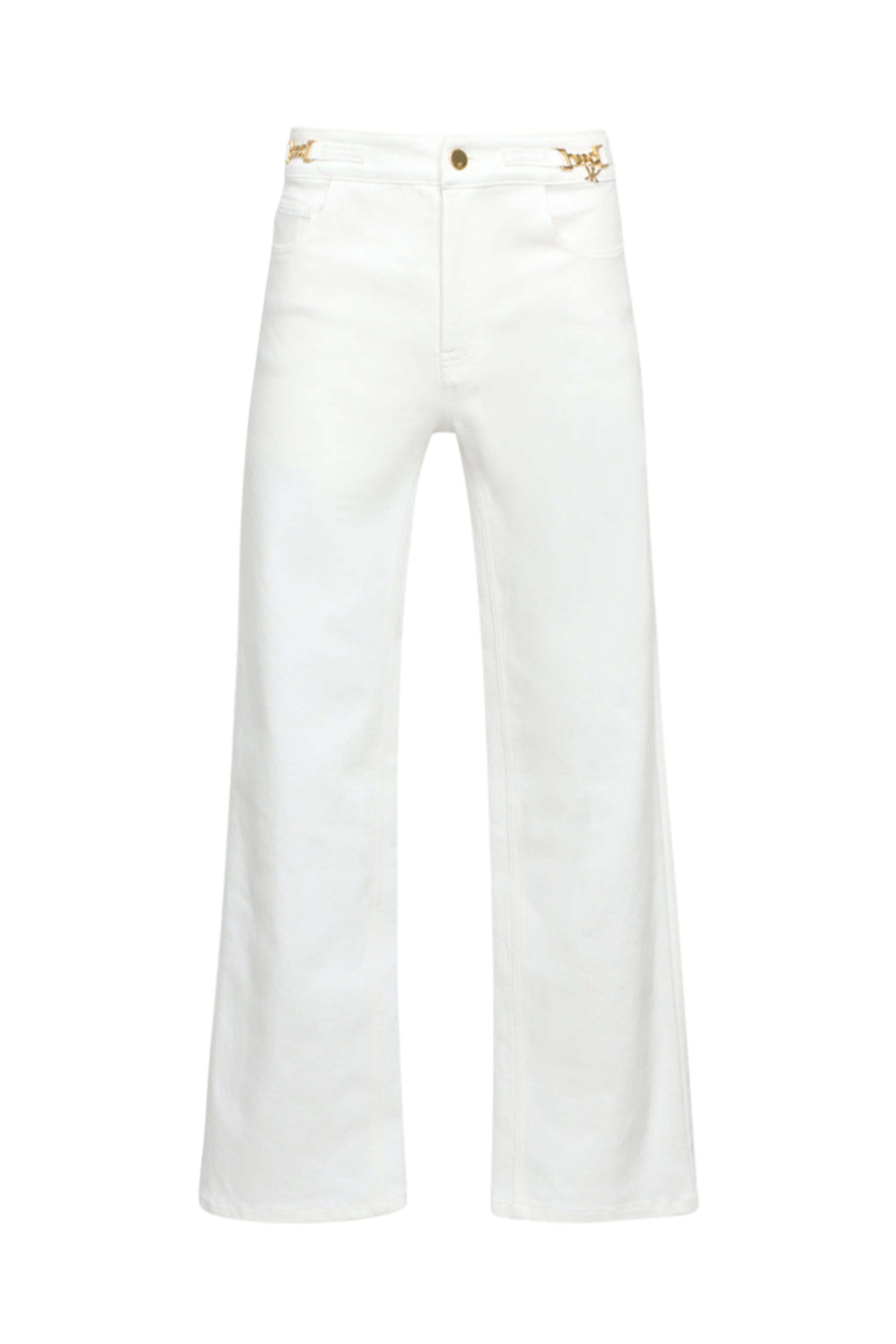 Kobi Halperin Straight June Jean in White. Mid rise. Button closure. Zip fly. Belt loops. Gold tone hardware detail at waist. Five pocket style. Straight silhouette. Ankle length. 100% polyester.