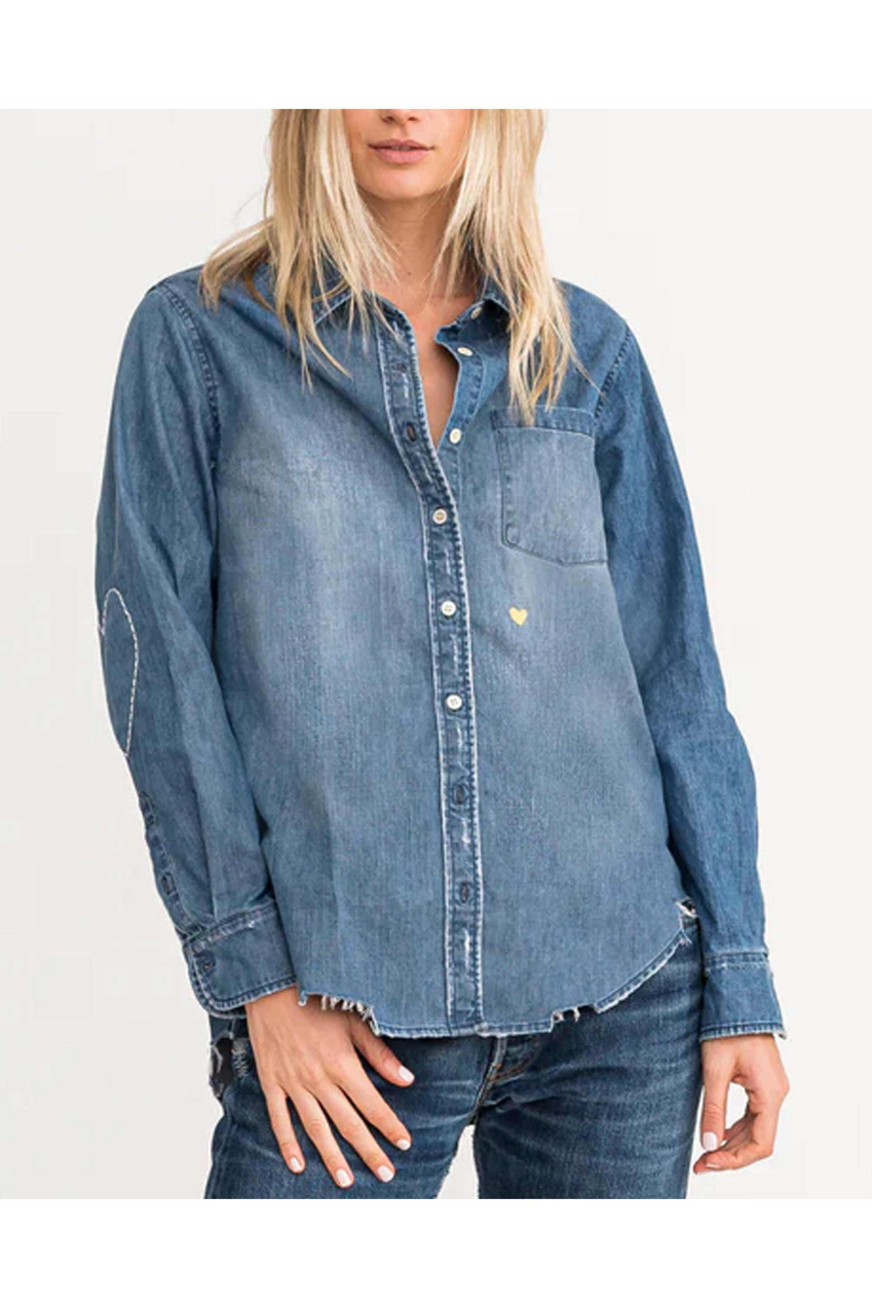 Kerri Rosenthal True Denim Classic Mia Shirt. Collar. Long sleeves; button cuffs. Heart shape elbow stitching. Front patch pockets. Rounded high low hem. Relaxed fit. 100% cotton.