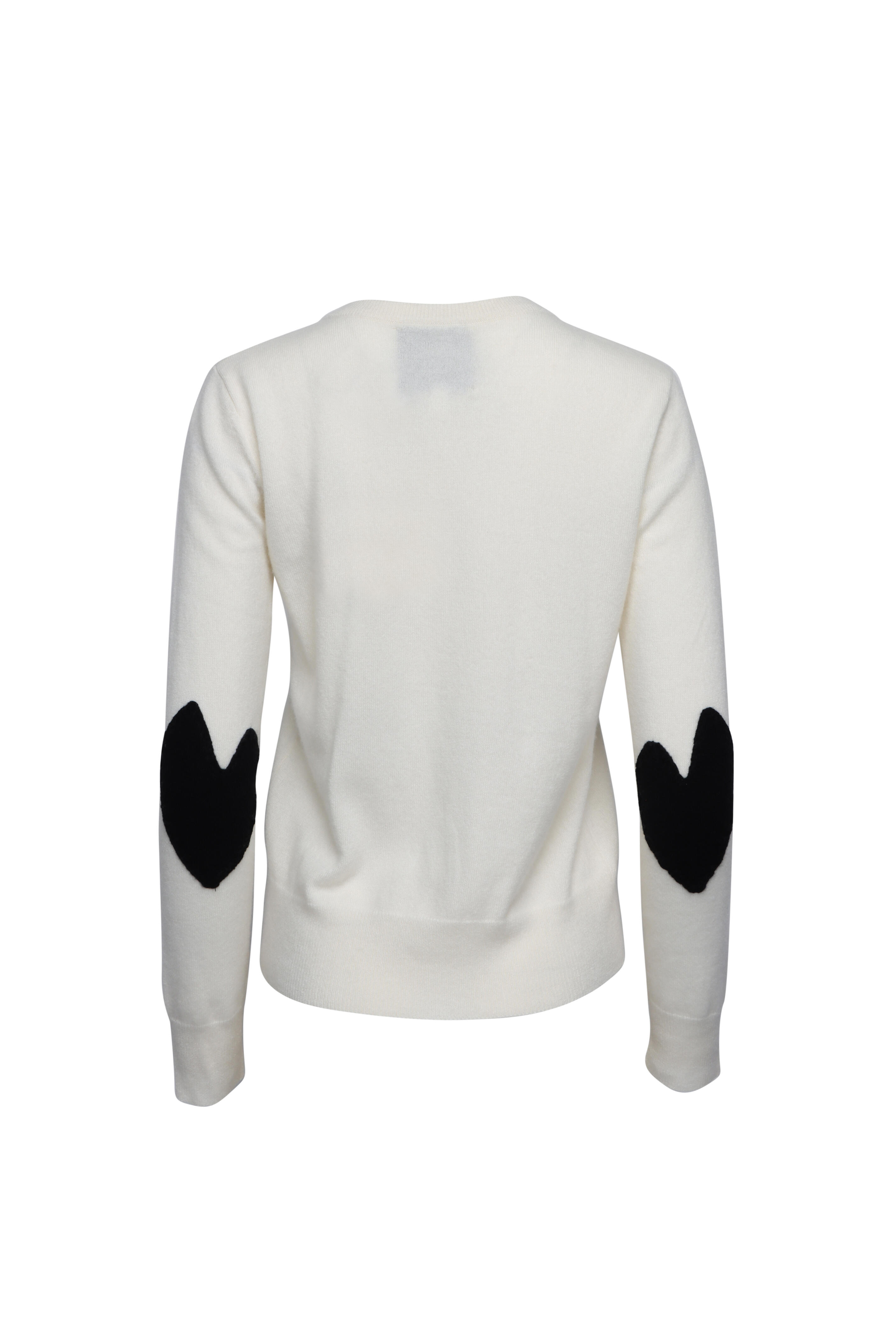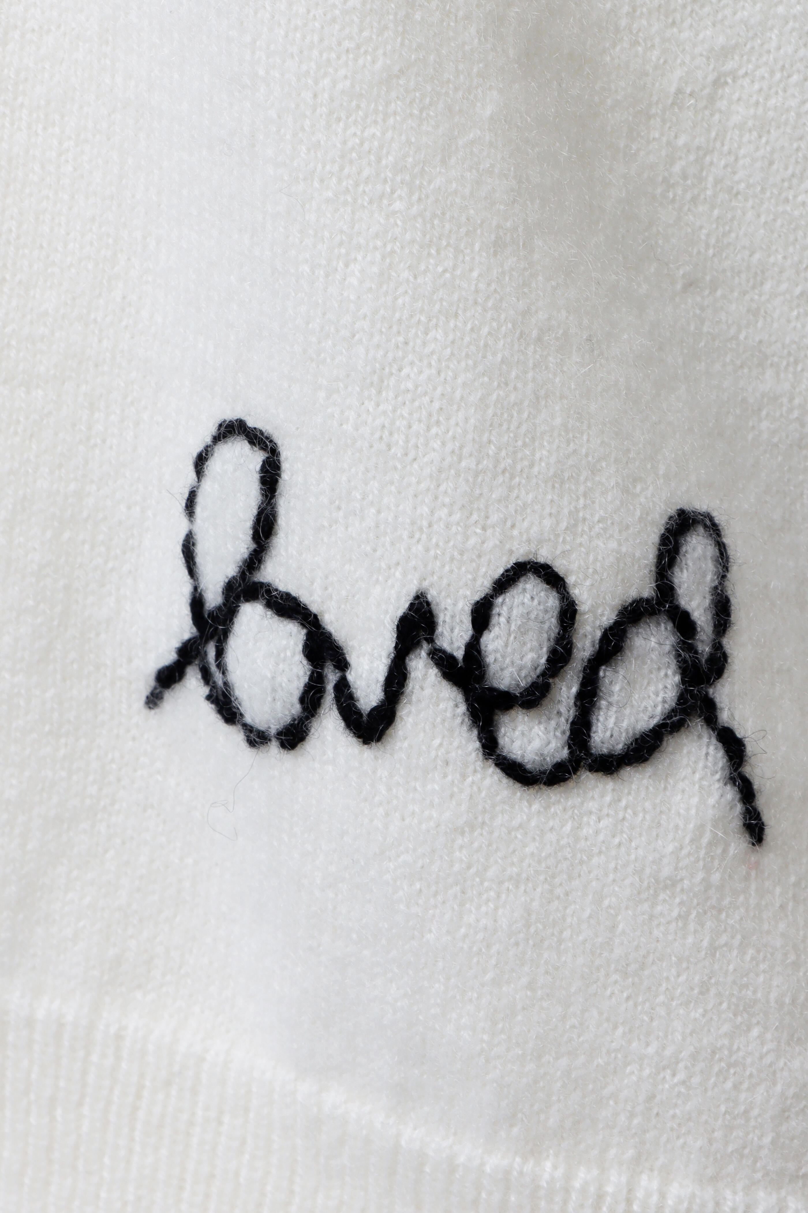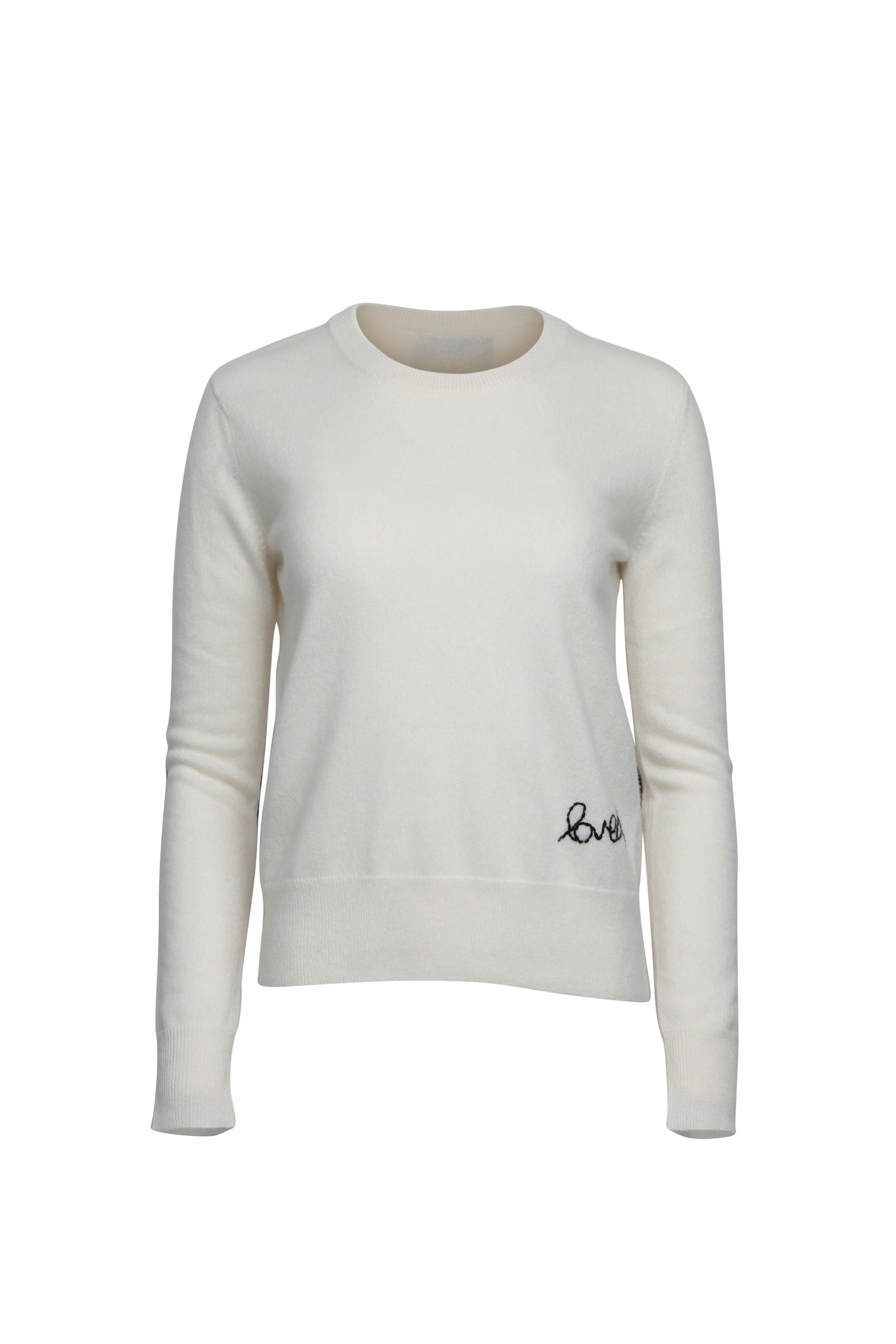 Round neck. Long sleeves. Relaxed fit. Embroidered loved detail. Straight hem. Ribbed cuffs and hem. Imported. Length 22” (Size S). 100% cashmere. Dry clean.