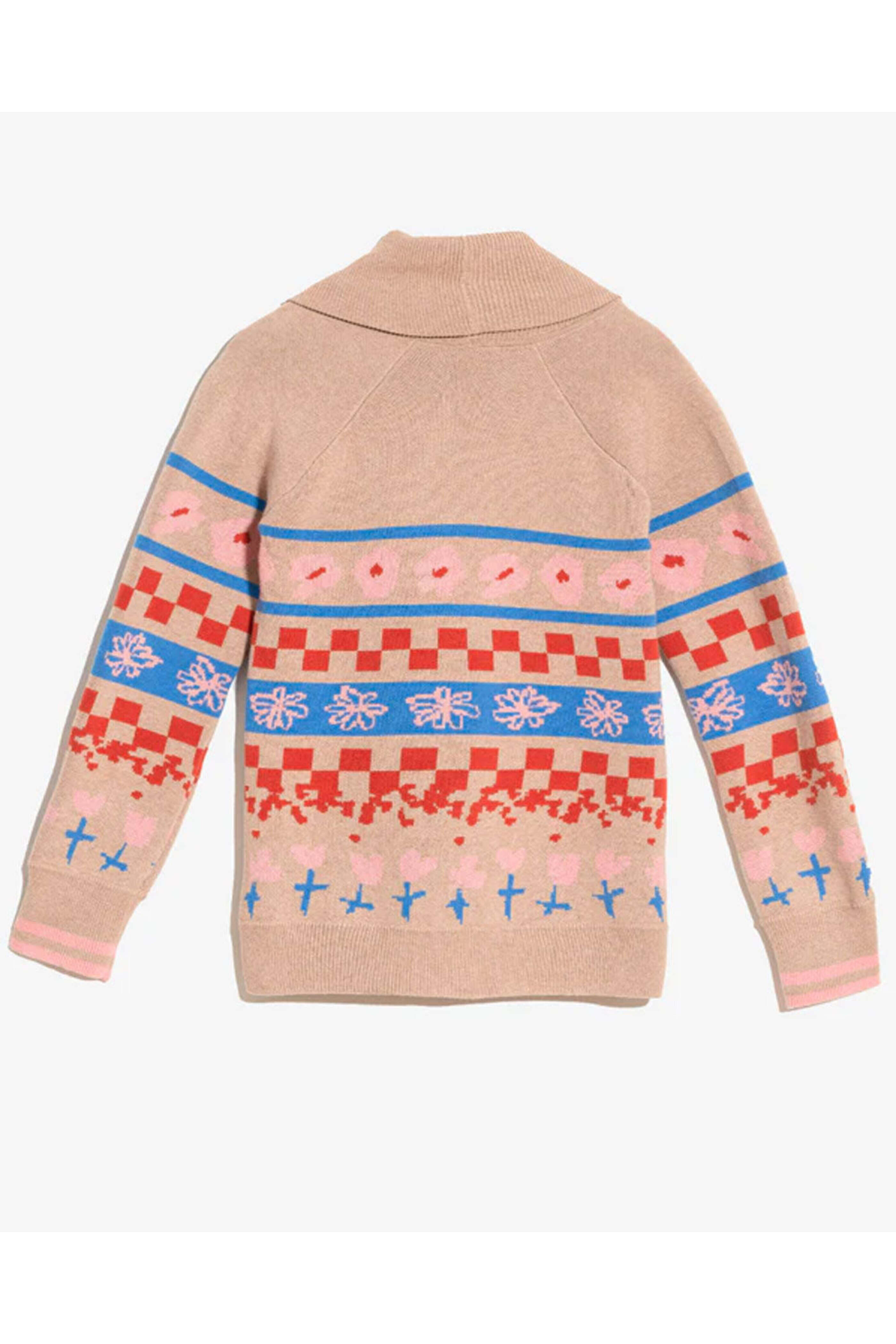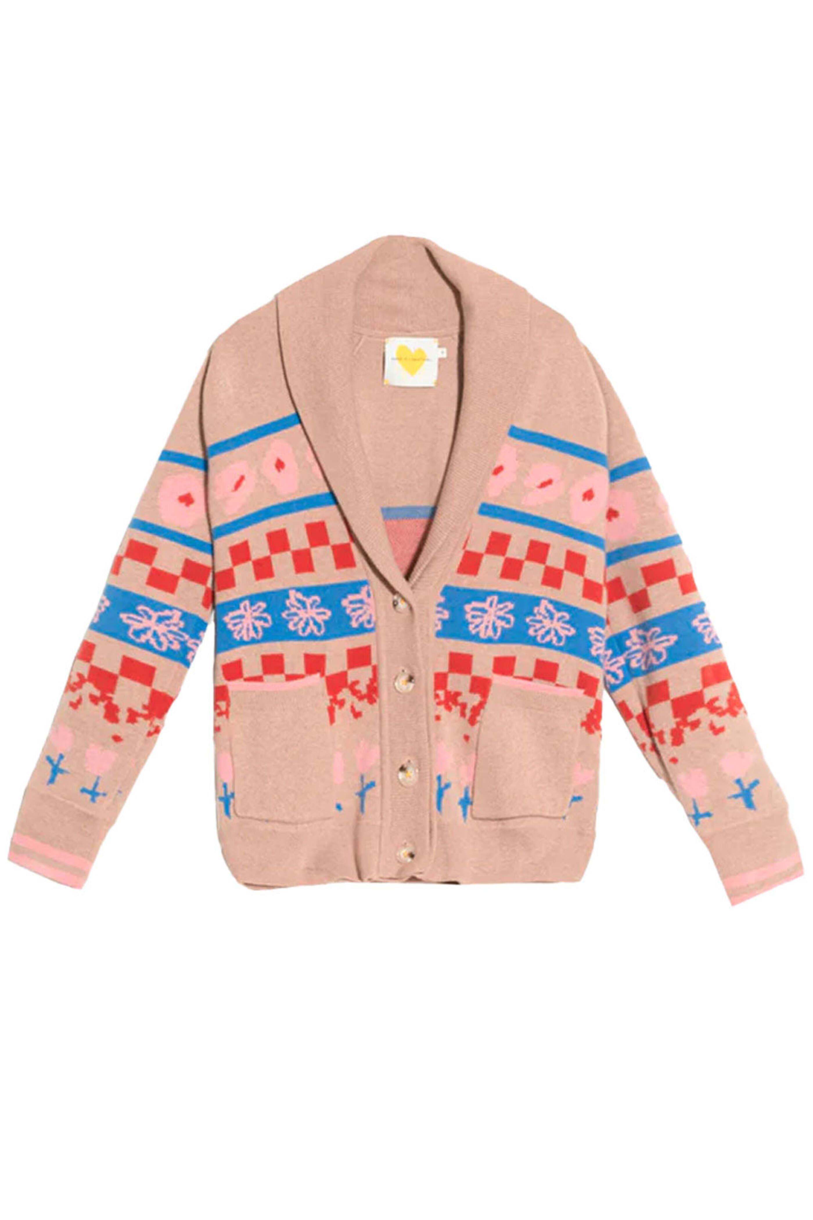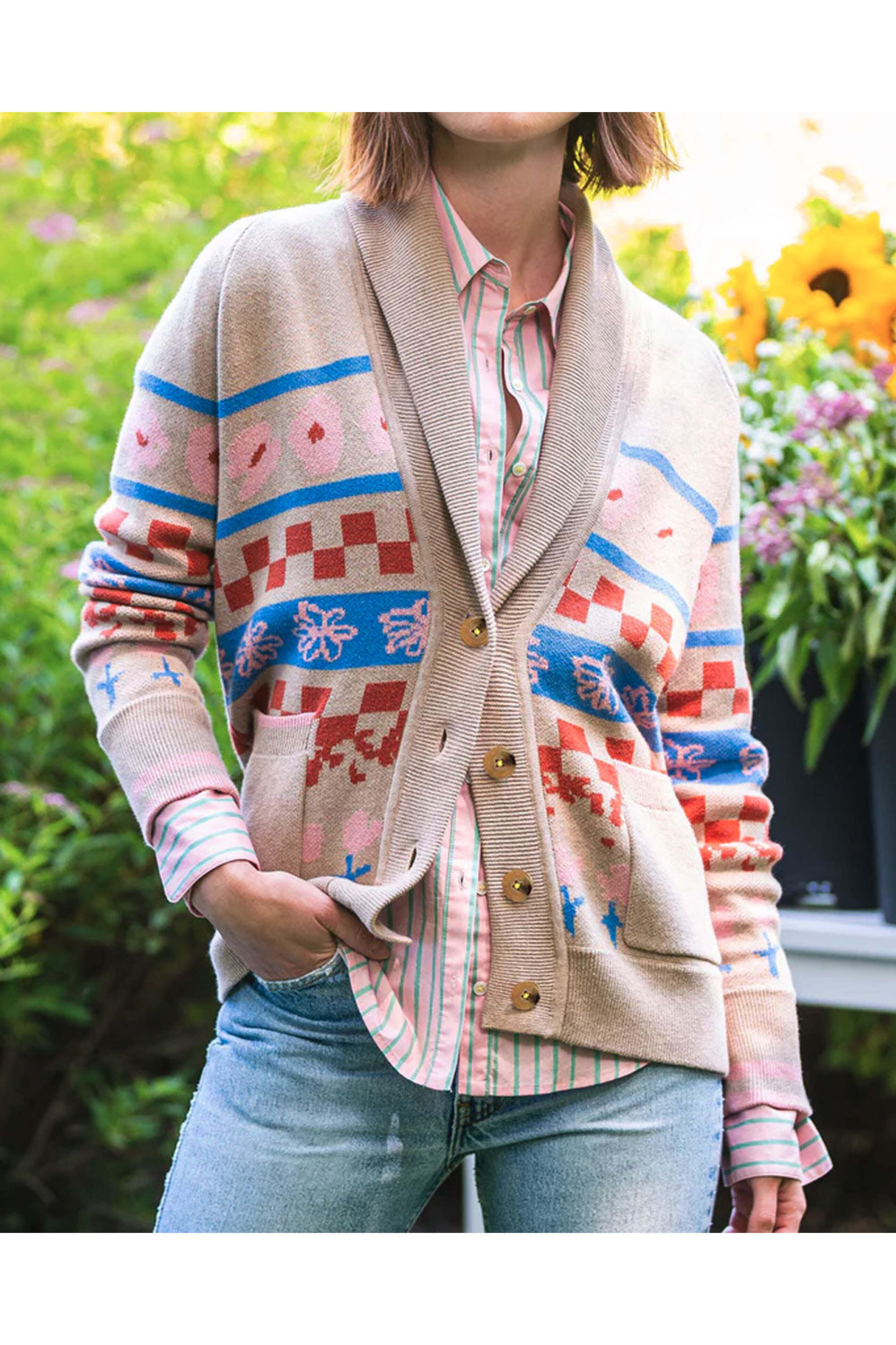 Kerri Rosenthal Fleur Isle Ferris Shawl Cardi. Shawl collar. Long sleeves. Placket; button up front closure. Patch pockets at front. Ribbed trim detailing. Relaxed fit. 95% Cotton, 5% Cashmere.