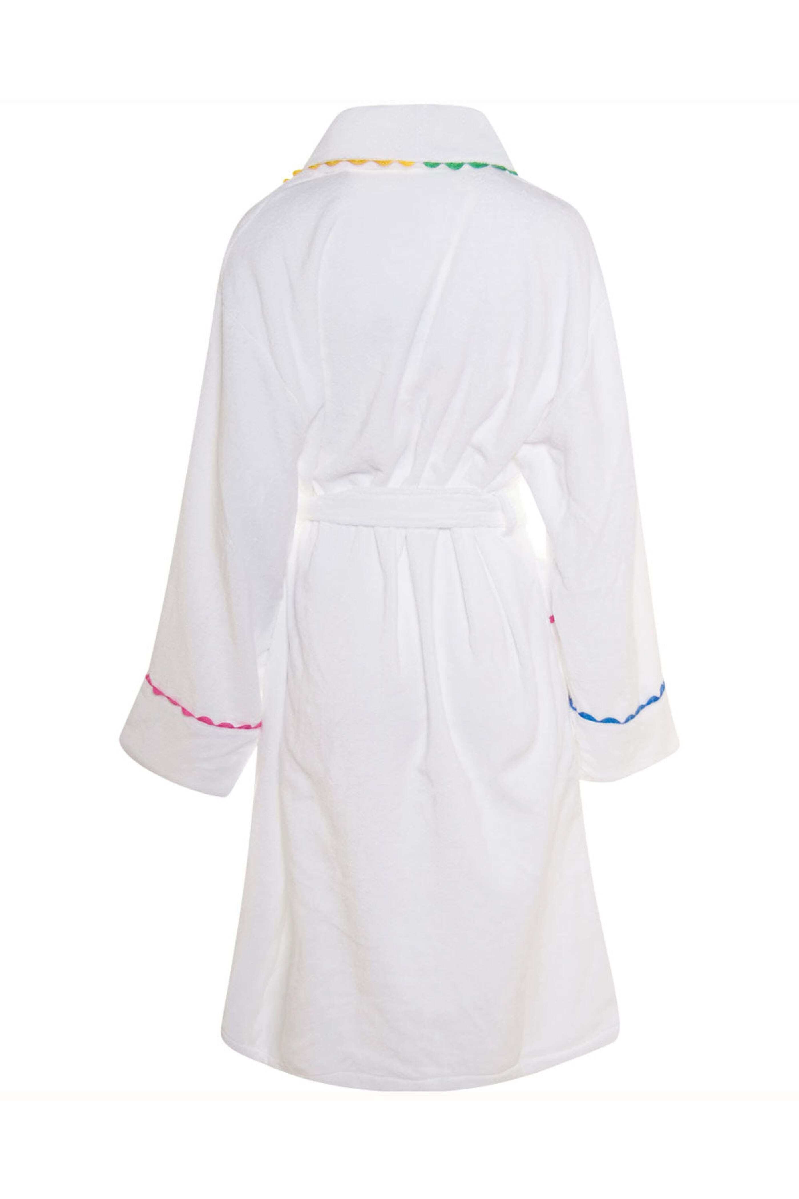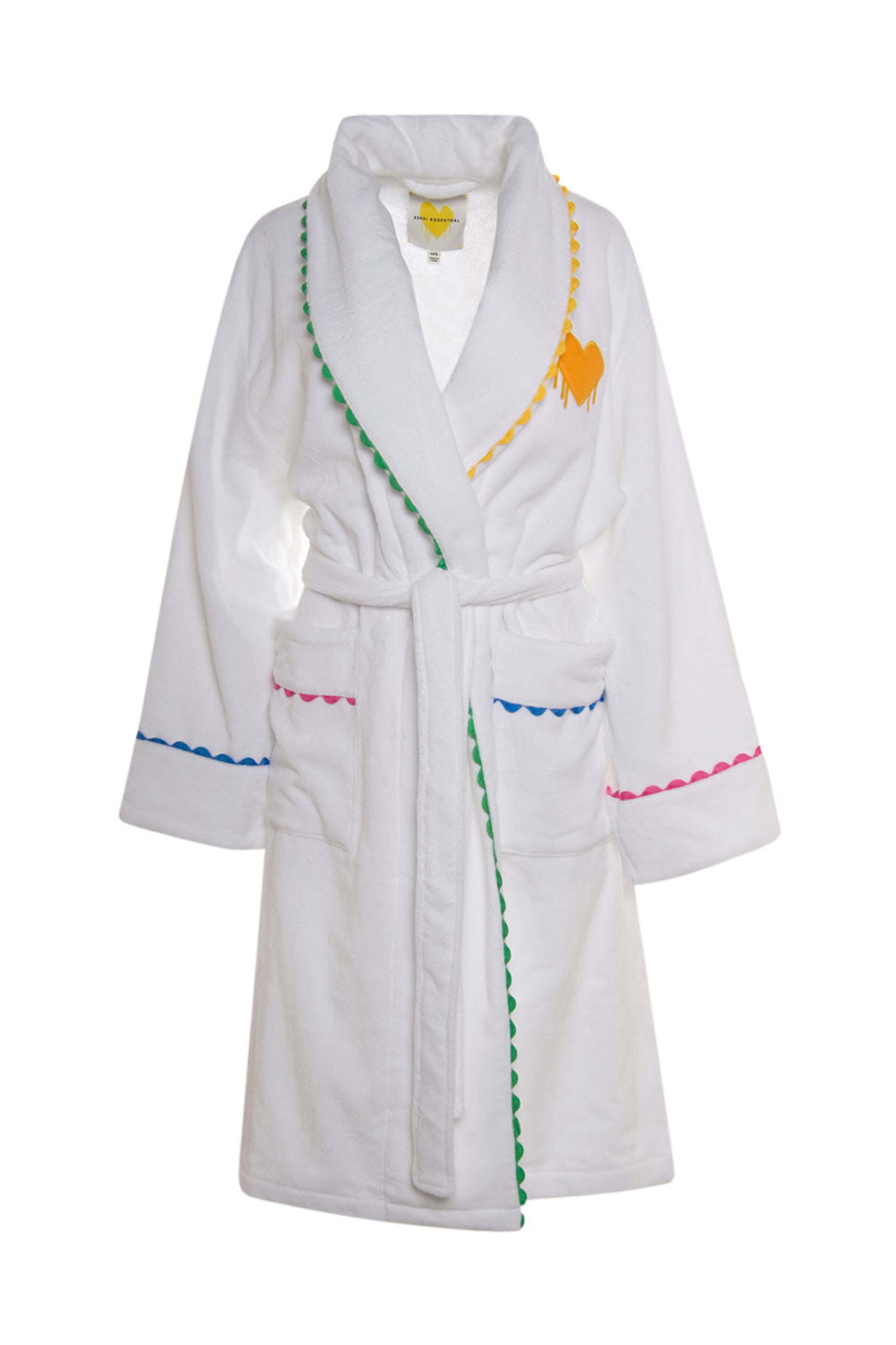 Kerri Rosenthal White Funday Robe. Shawl lapel. Drop sleeves. Cuff sleeves. Front pockets. Waist tie. Relaxed fit. 100% cotton terry.