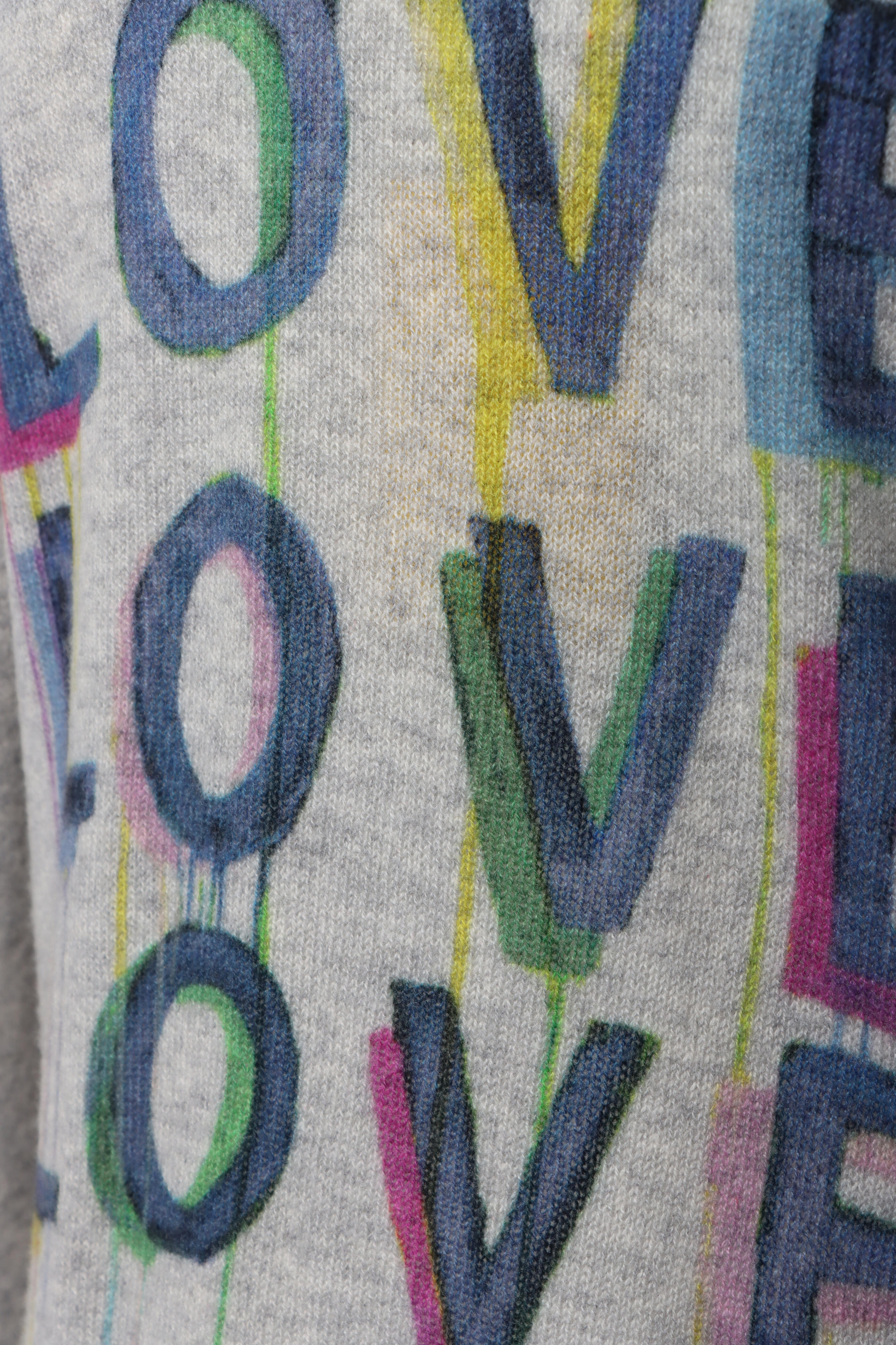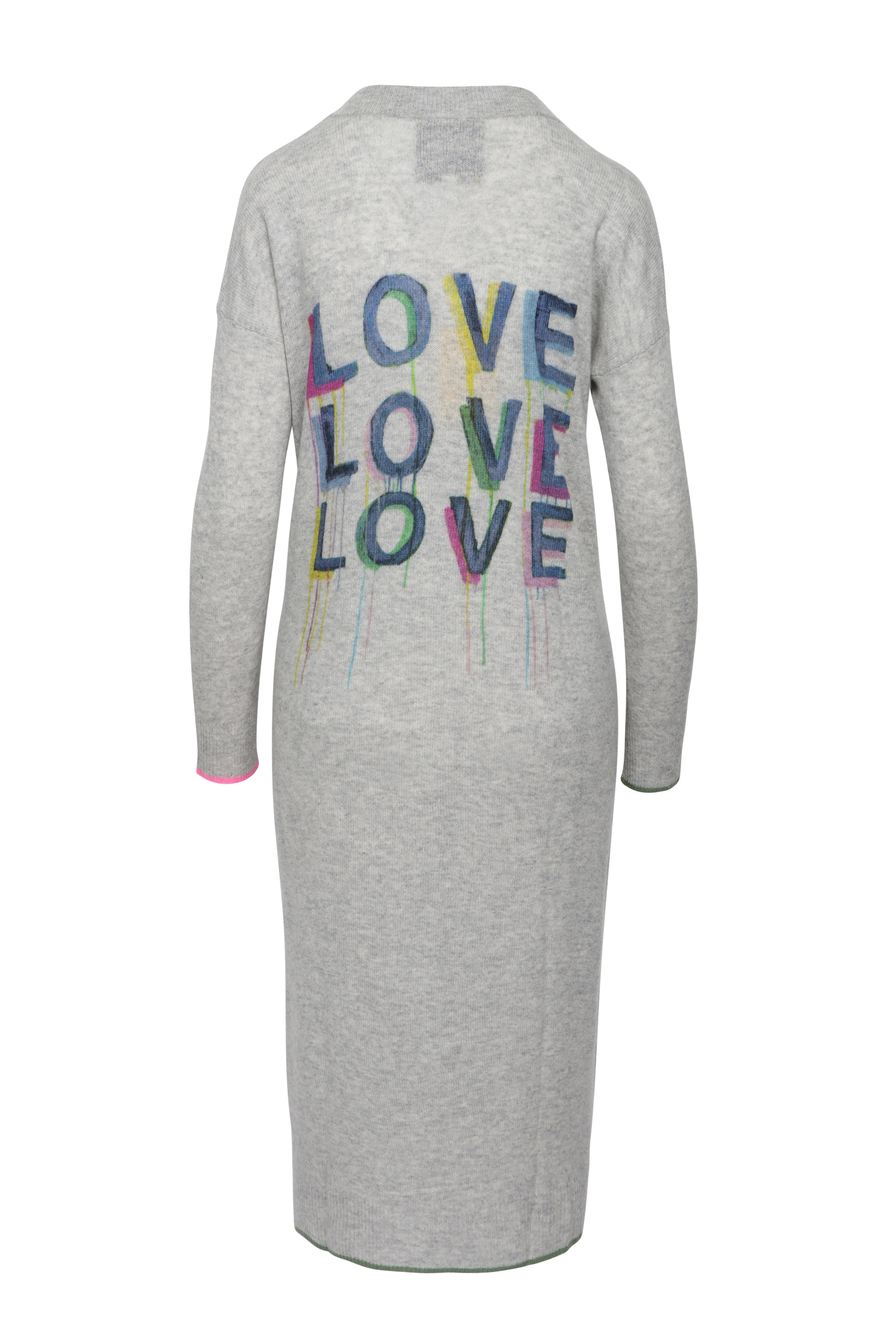 Open front. Long sleeves. “Love” graphic at back. Long length. Imported. Length 45” (Size S). 100% cashmere. Dry clean.