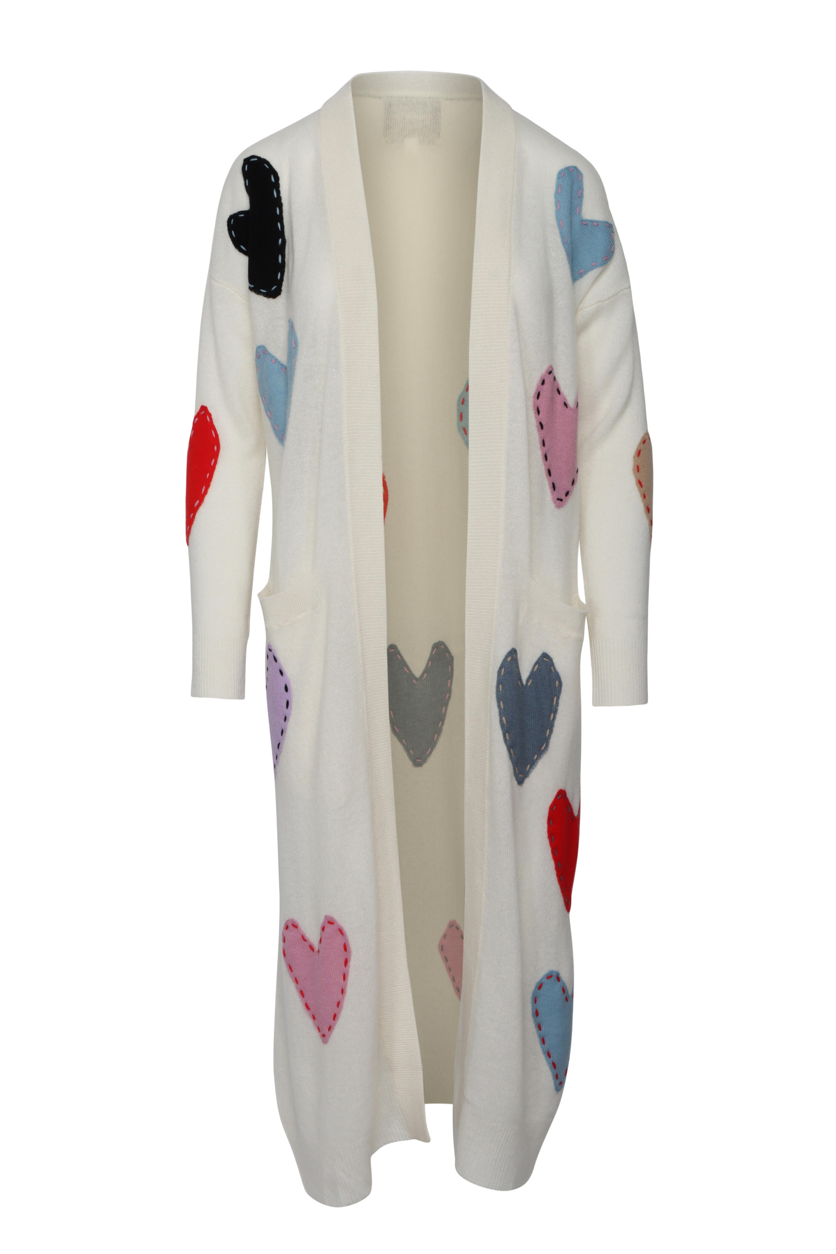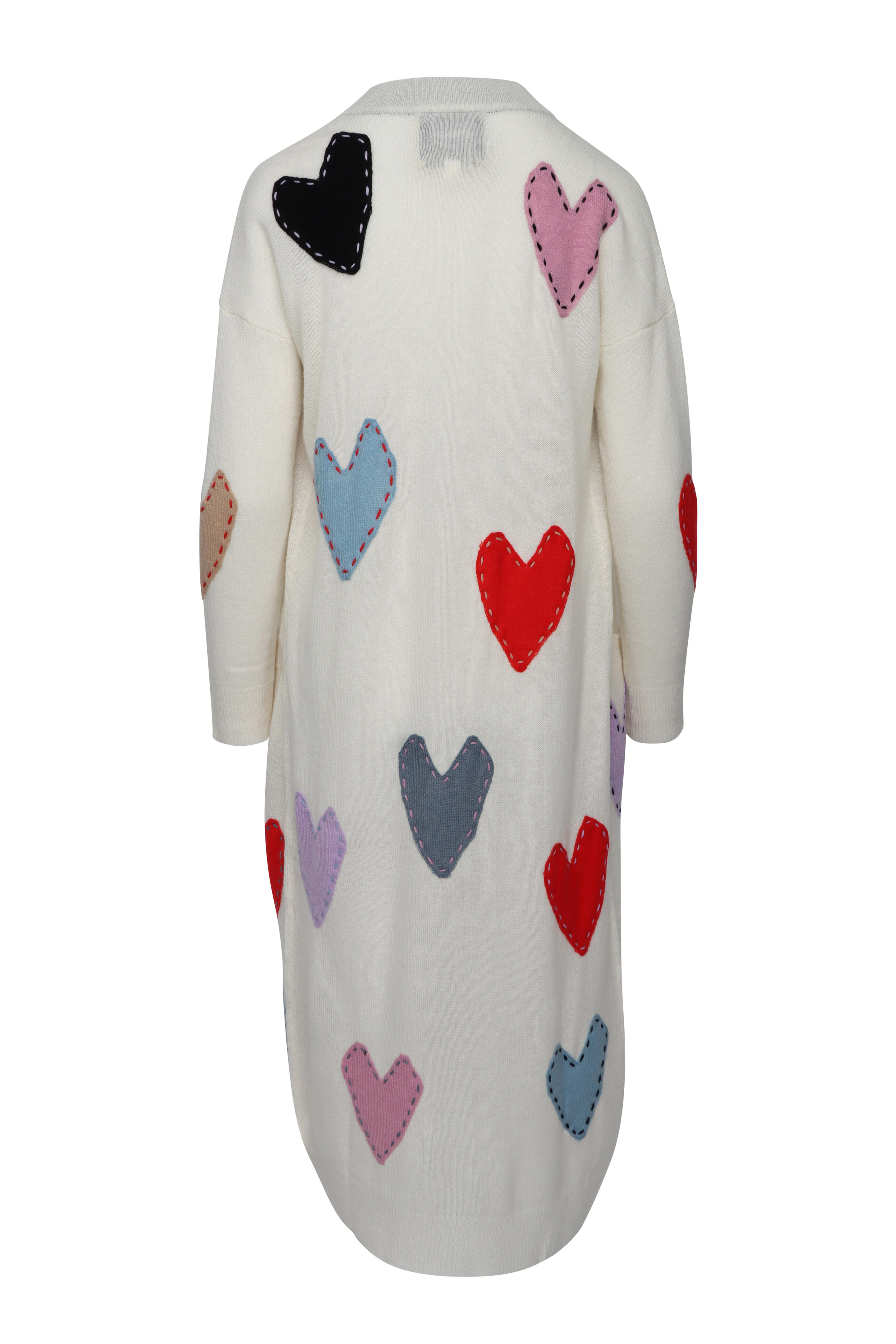 Open front. Long sleeves. Patchwork heart detail throughout. Long length. Imported. Length 45” (Size S). 100% cashmere. Dry clean.
