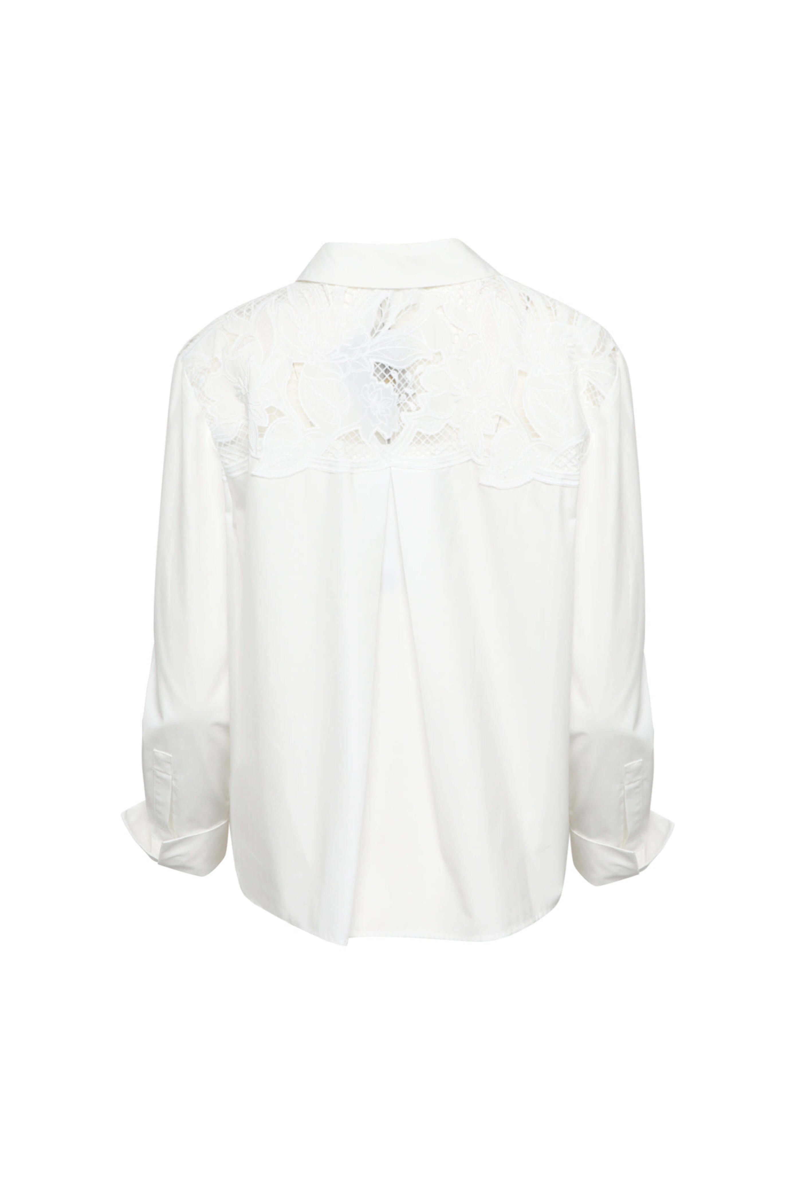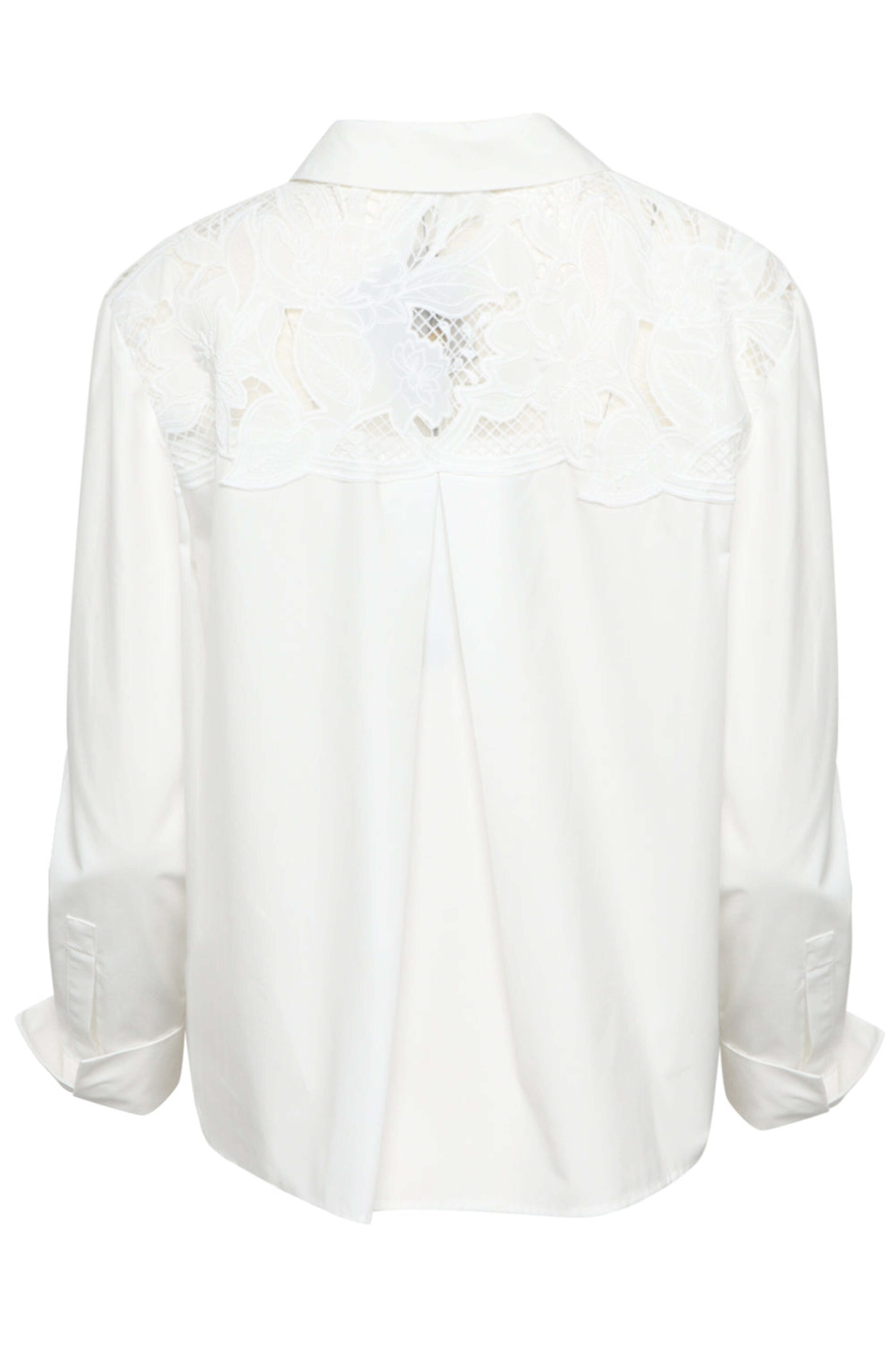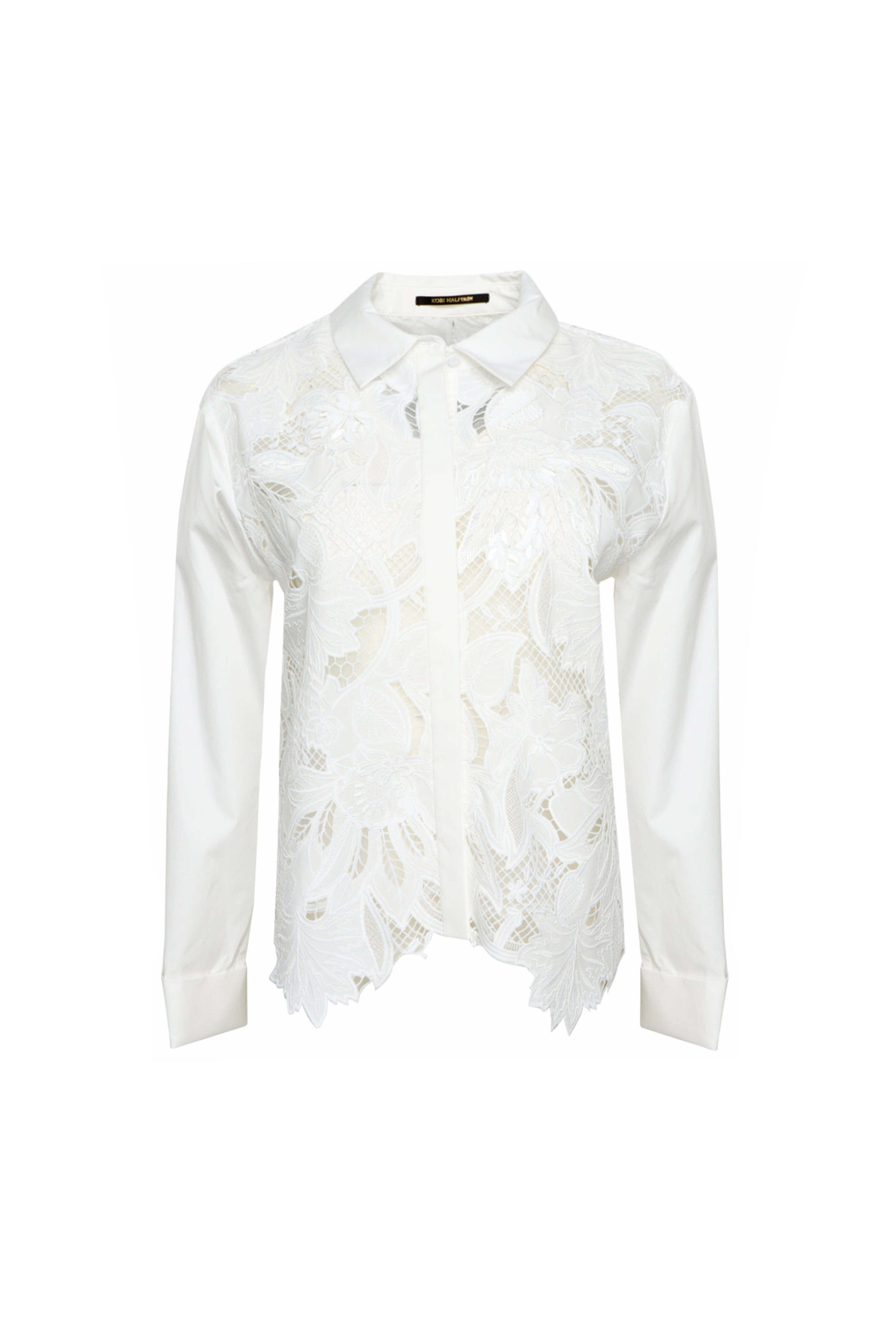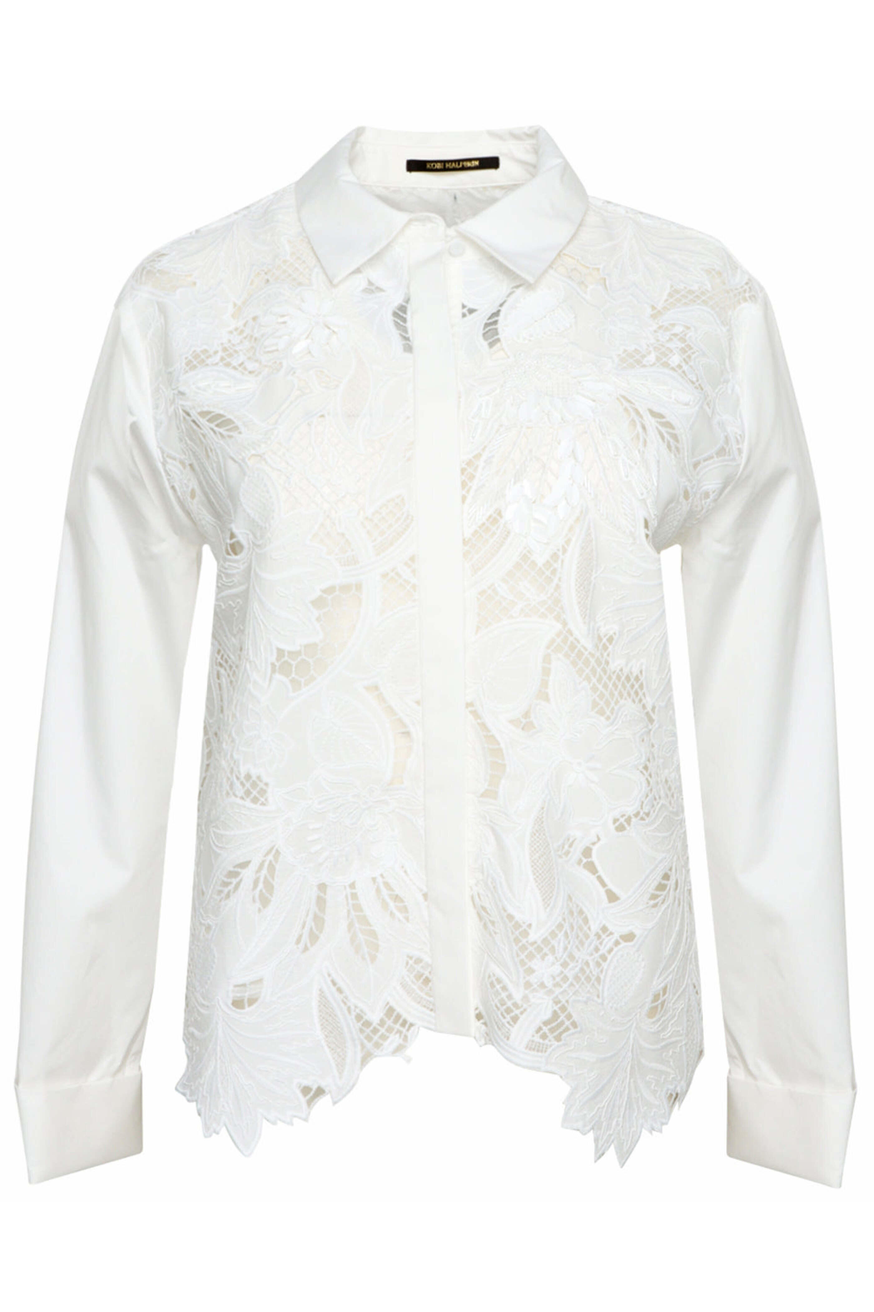 Kobi Halperin White Eyelet Brodie Blouse. Collar. Long sleeves; button cuffs. Concealed button down front closure. Boxy fit. Slightly cropped length. Front eyelet lace fabrication. 100% polyester outer.