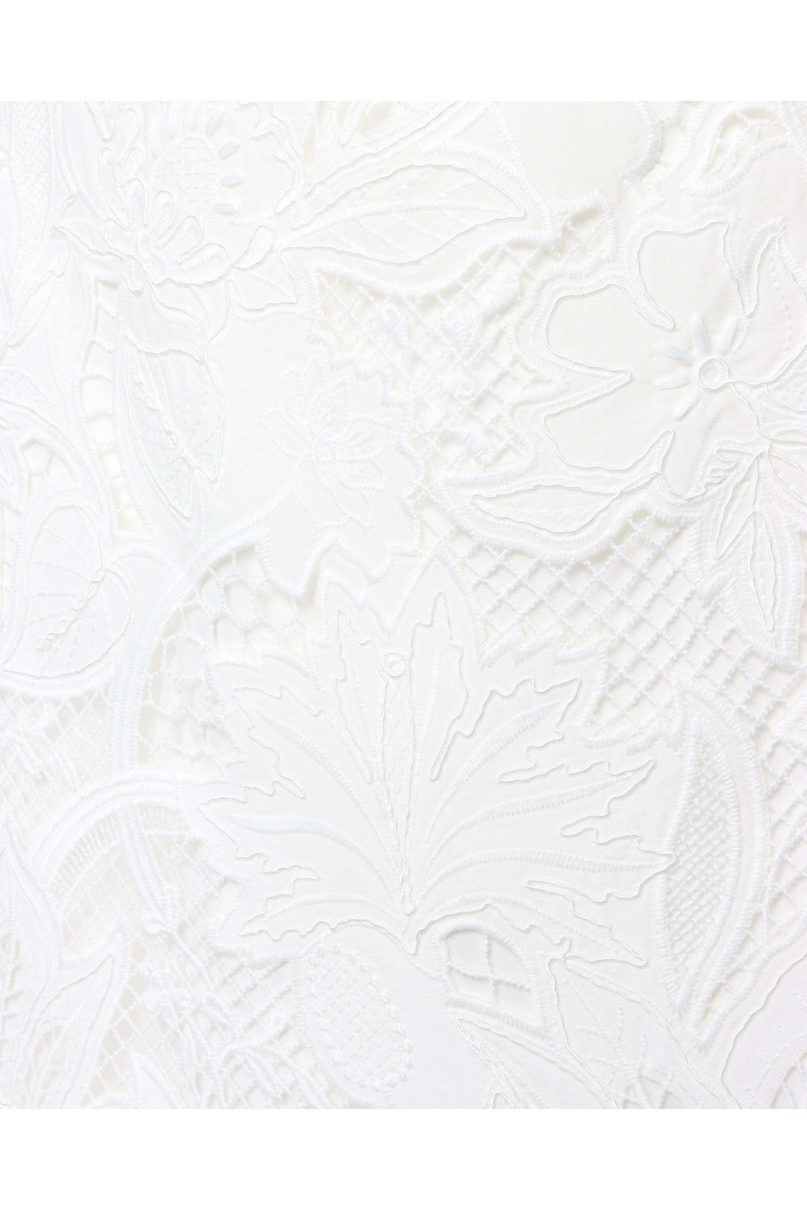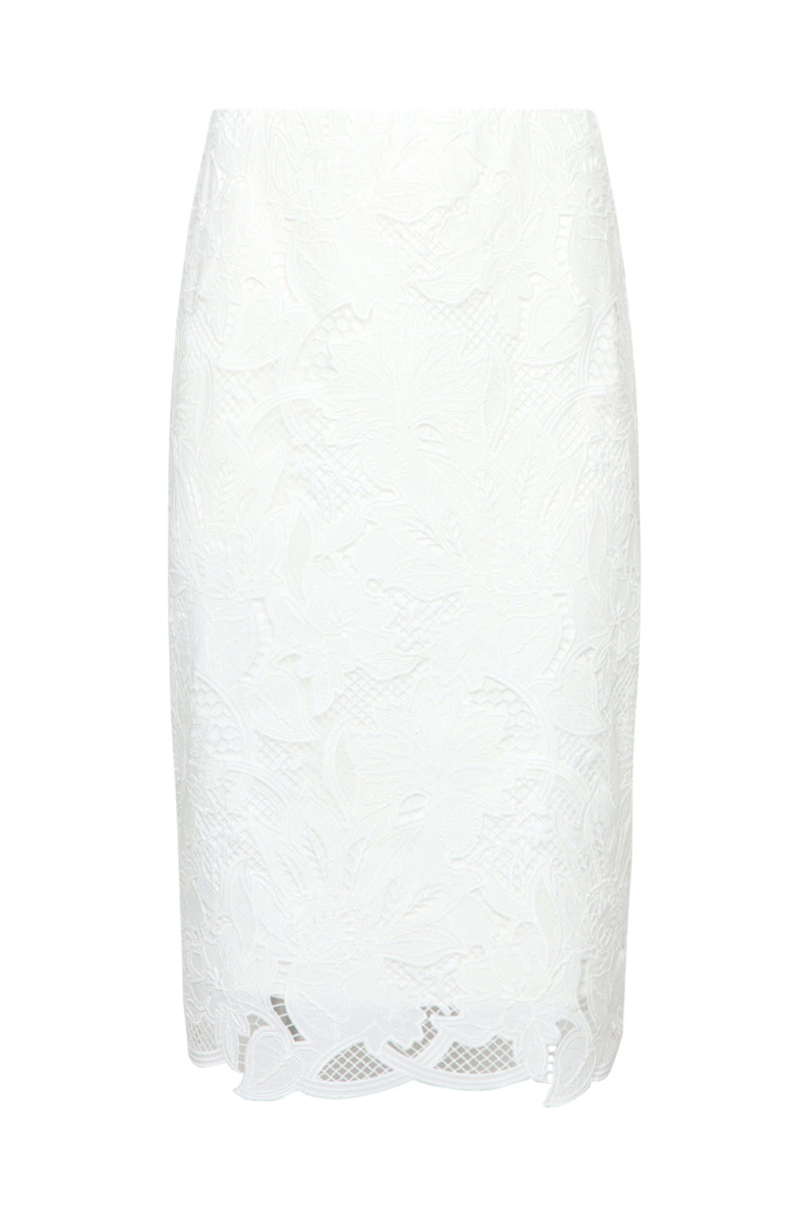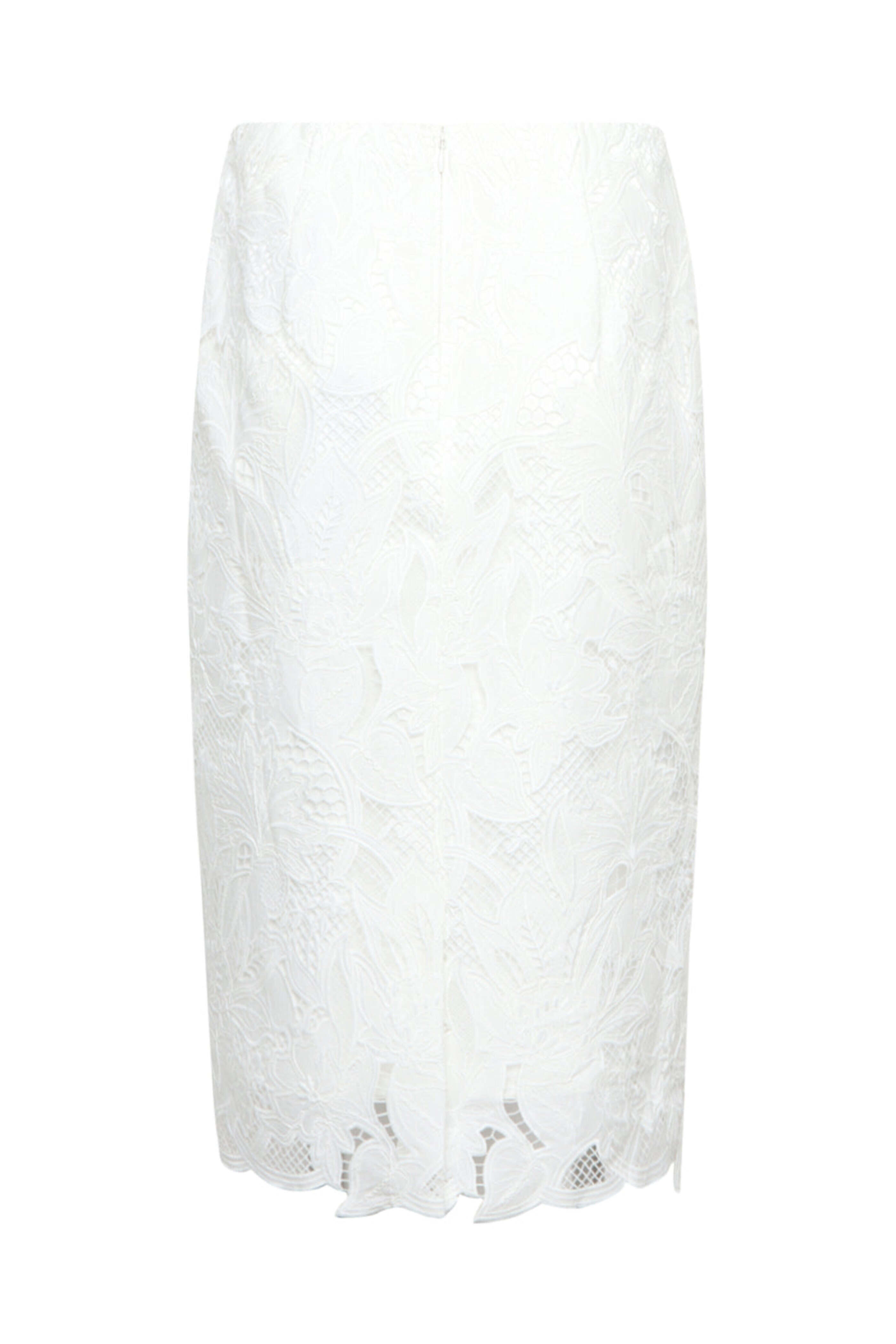 Kobi Halperin White Eyelet Nala Skirt. High rise. Elastic waist. Concealed back zip closure. Pencil silhouette. Knee to midi length. Back hem vent. Front eyelet lace fabrication. Lined. 100% polyester outer, 97% polyester, 3% spandex lining.