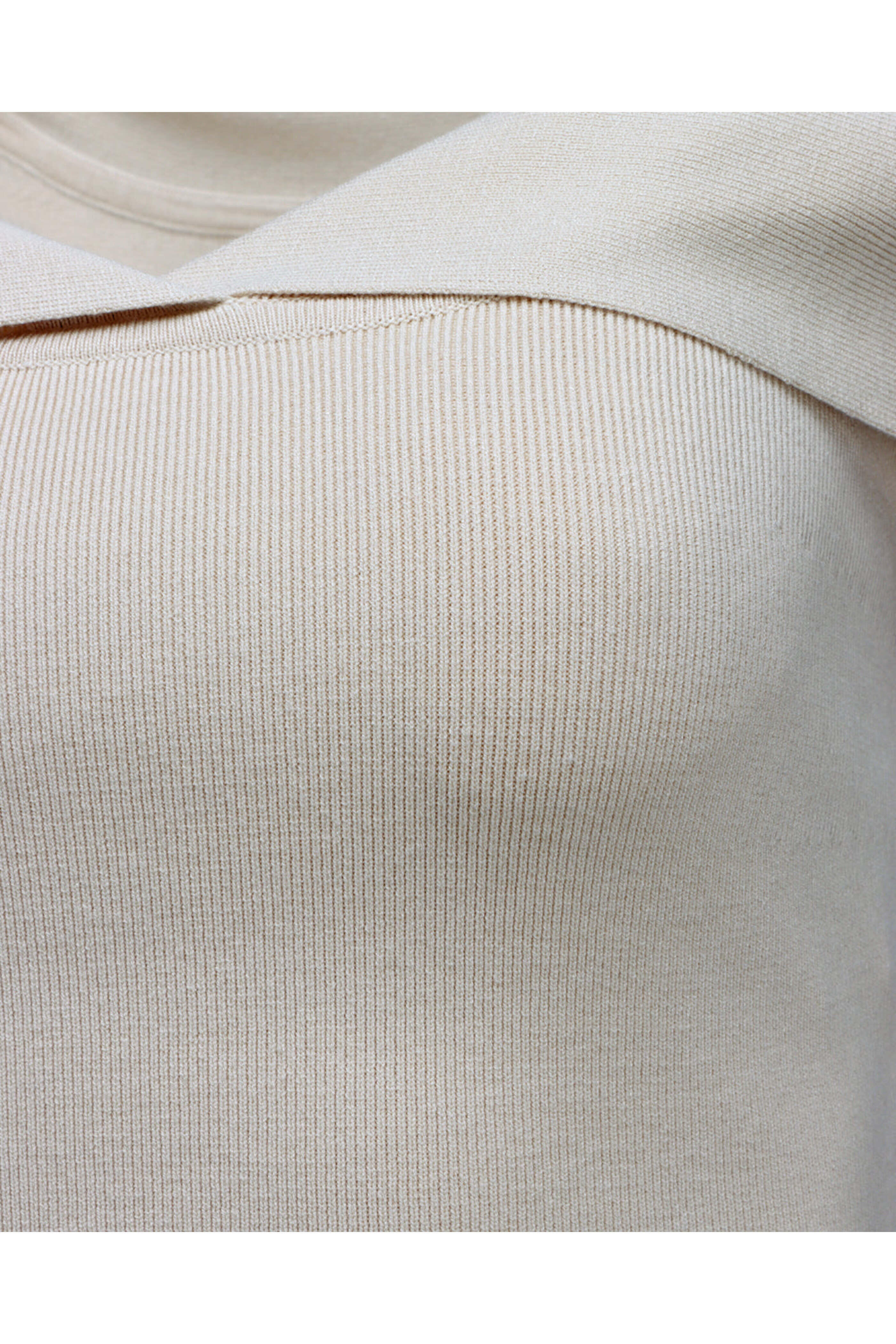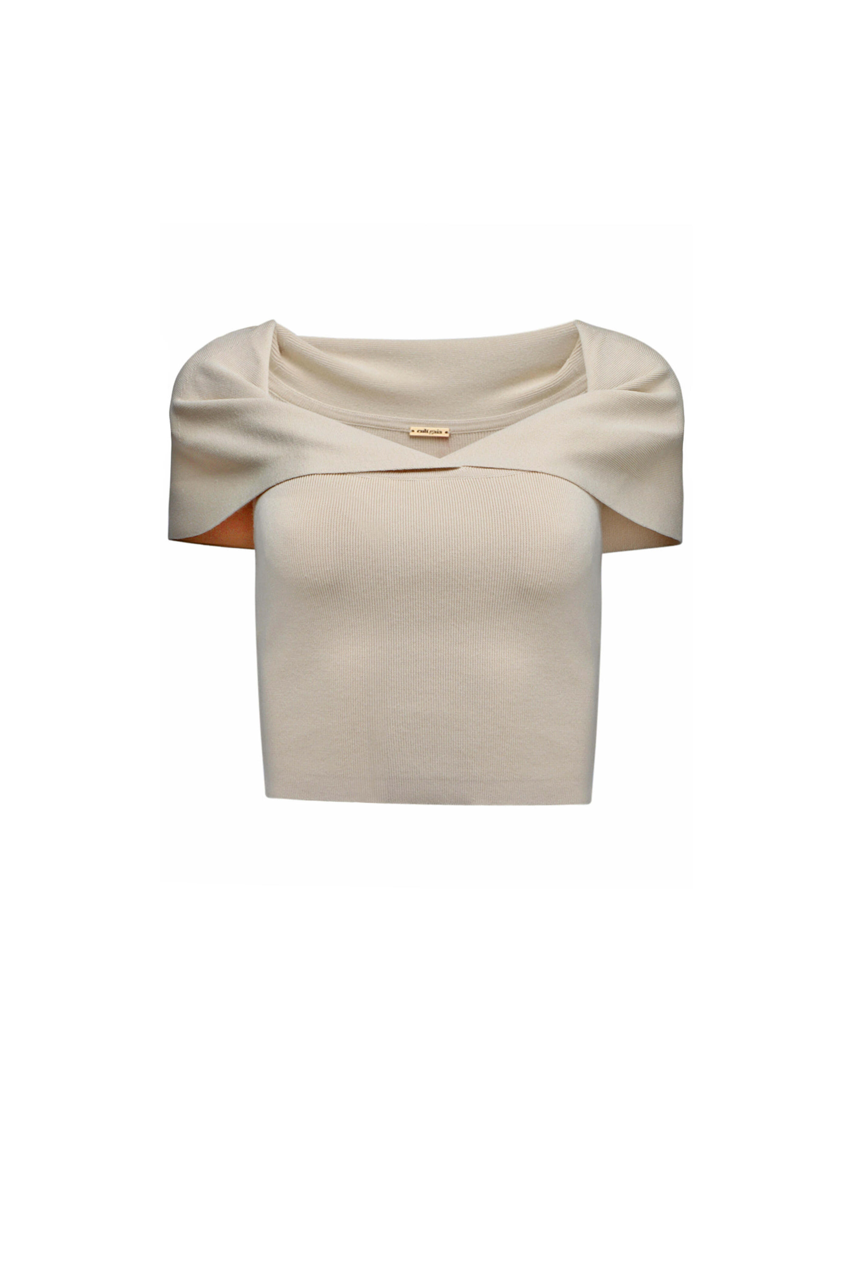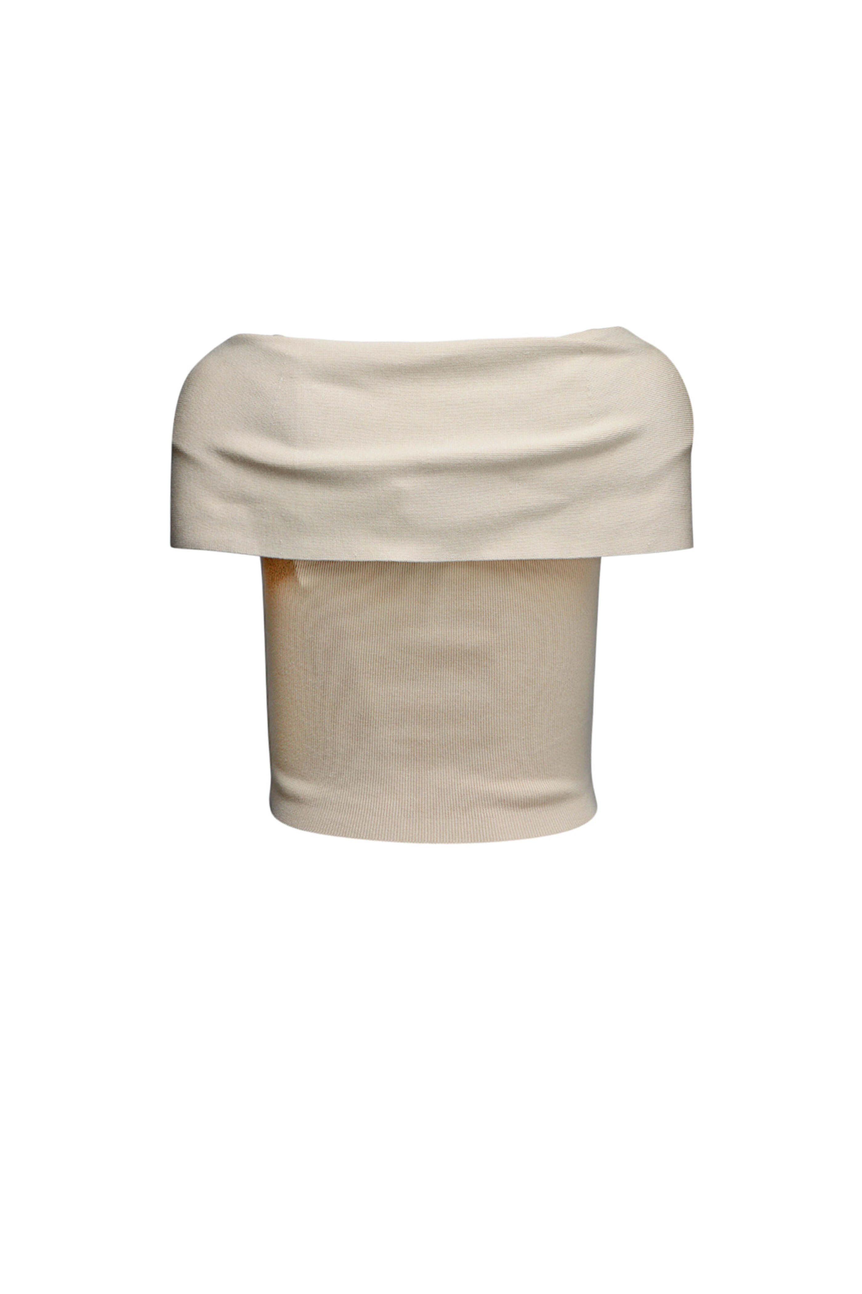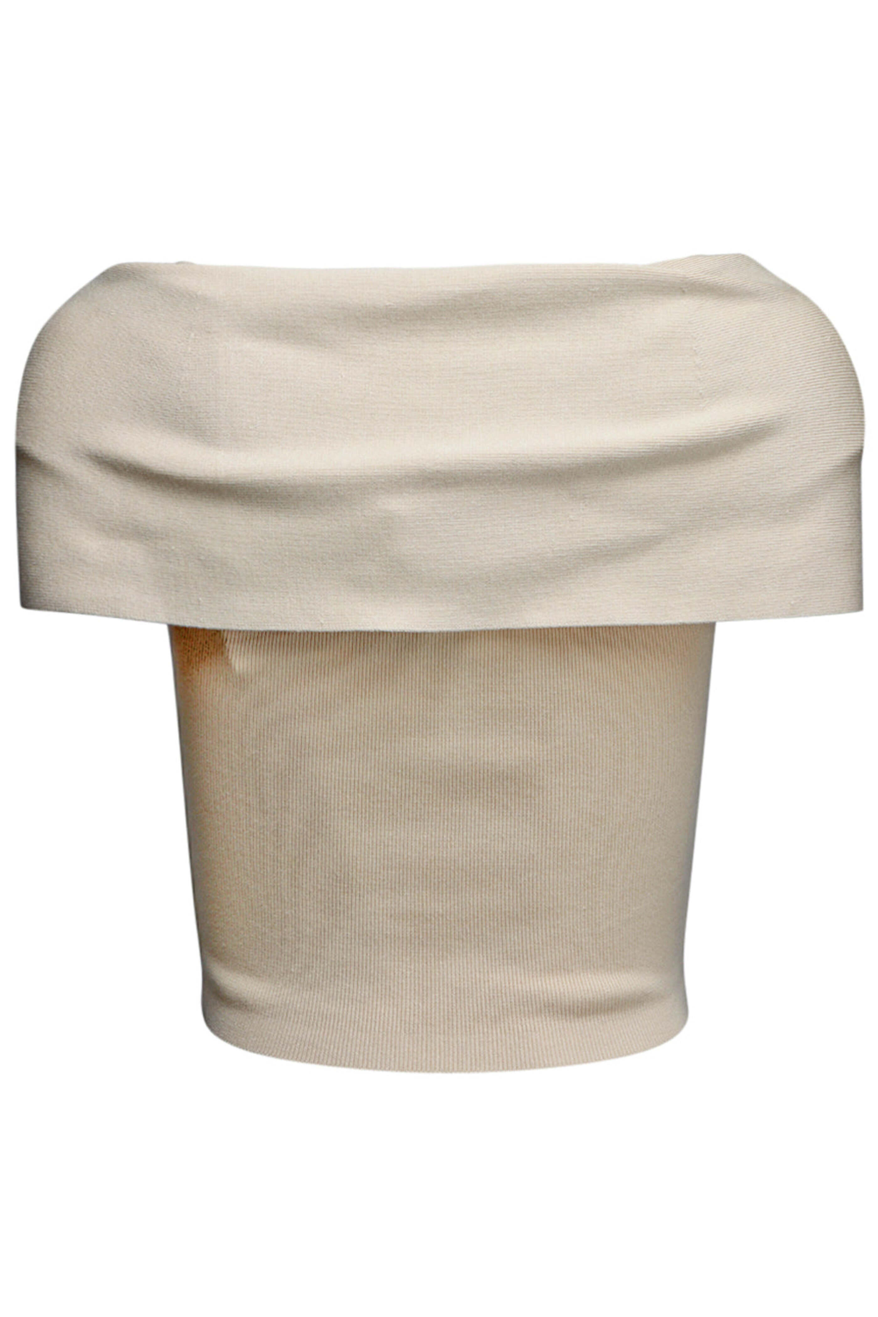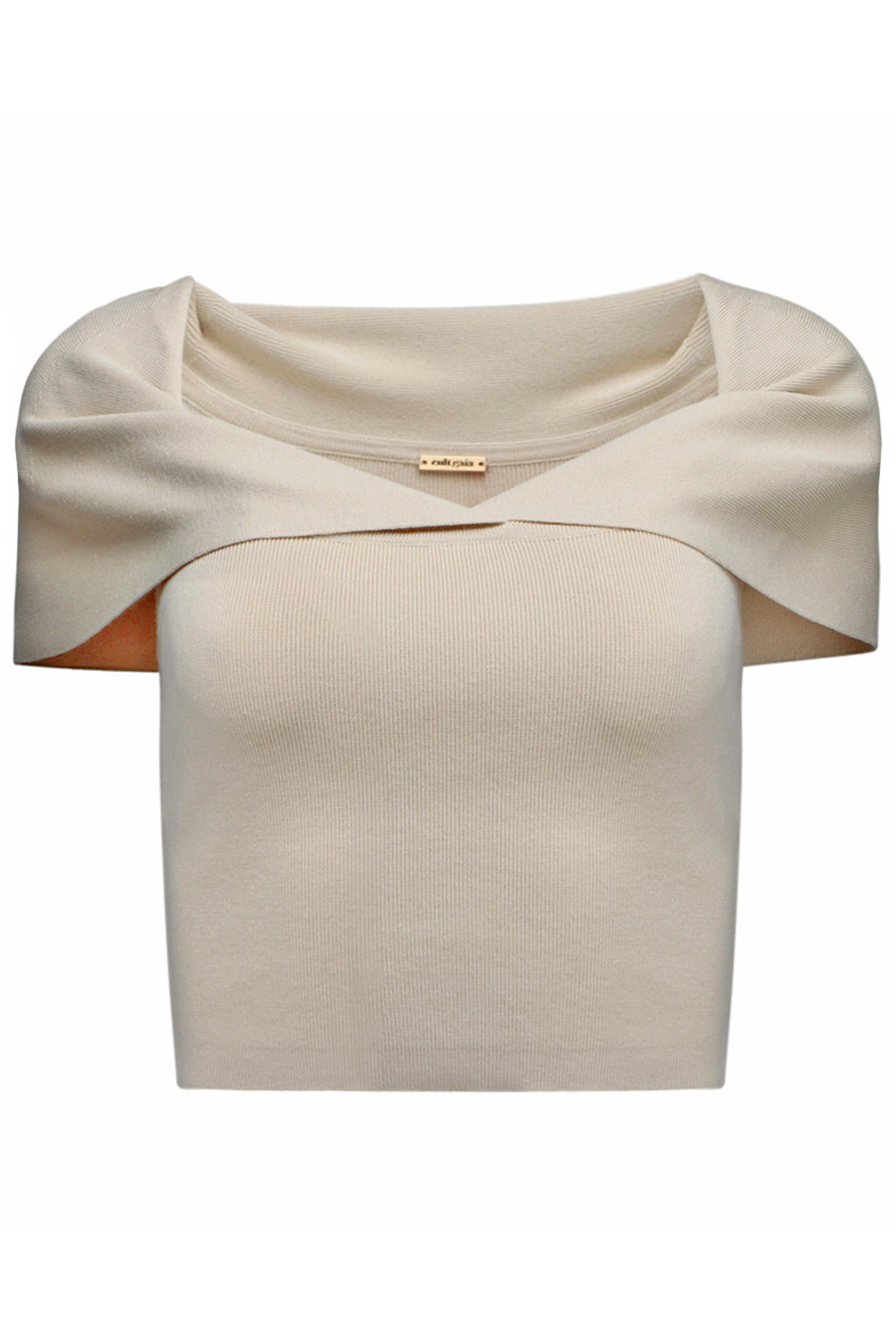 Cult Gaia Beach Prescott Knit Blouse. Off the shoulder neckline. Short sleeves. Slim silhouette. Knit fabrication. 79% viscose, 21% nylon.