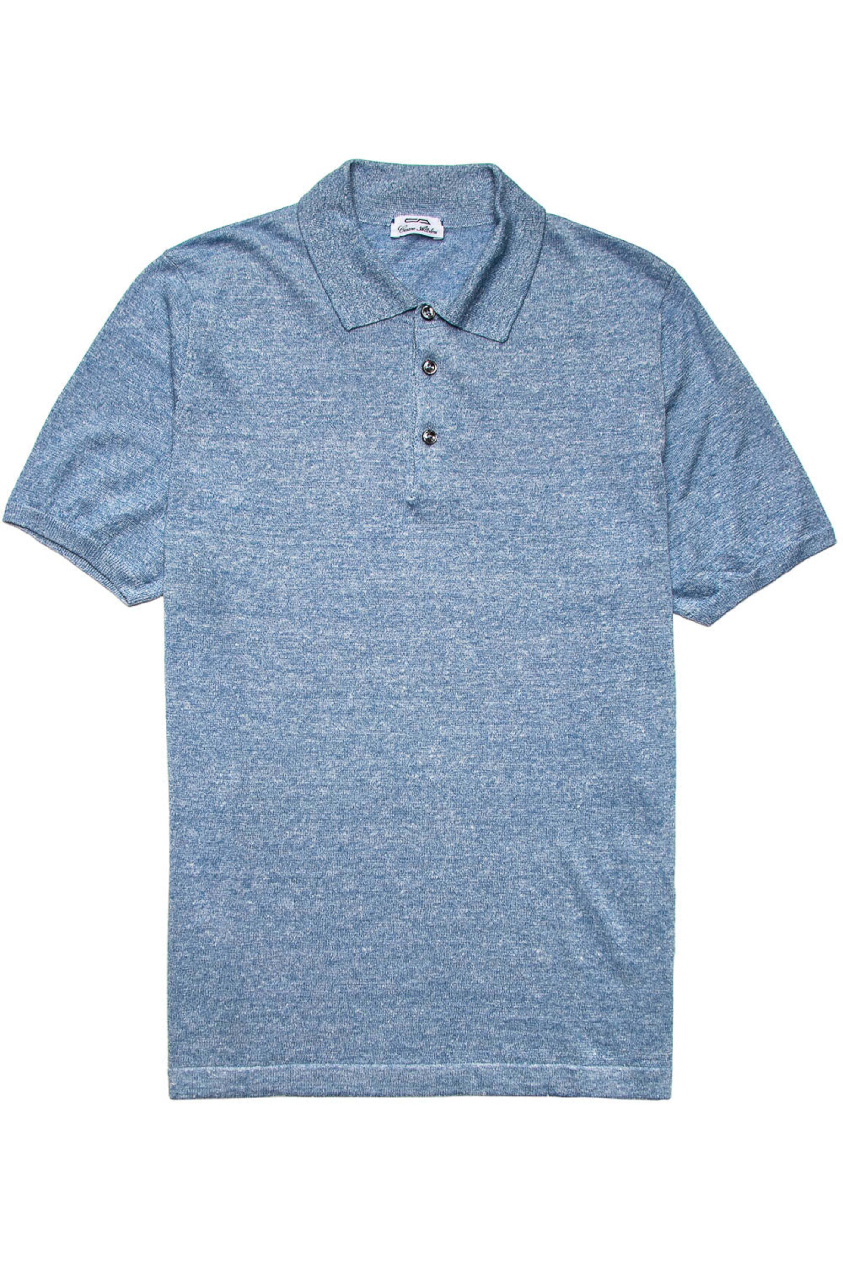 - Cesare Attolini Azzurro Knit Polo Three button placket Short sleeves Standard collar Ribbed trim Straight front and back hemline Side seam vents 68% linen~ 32% cotton Made in Italy