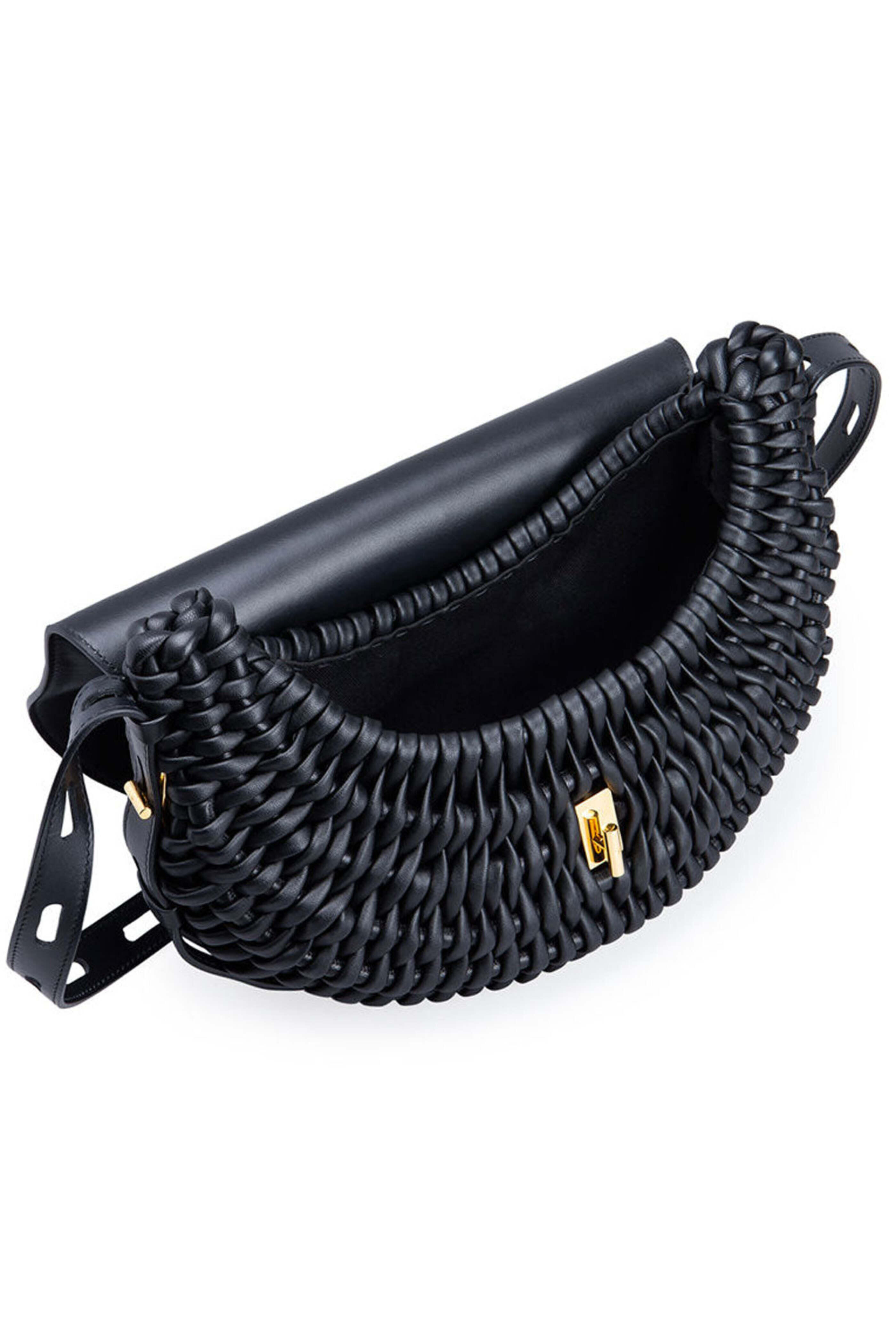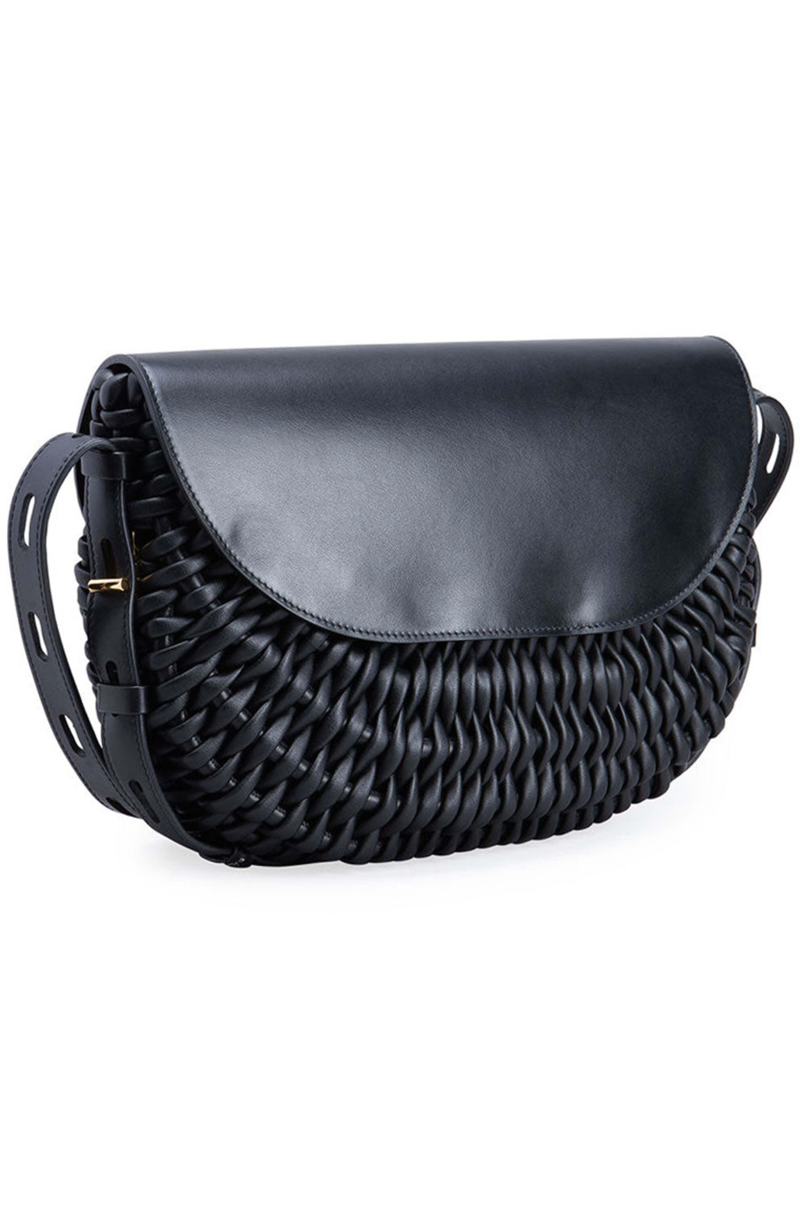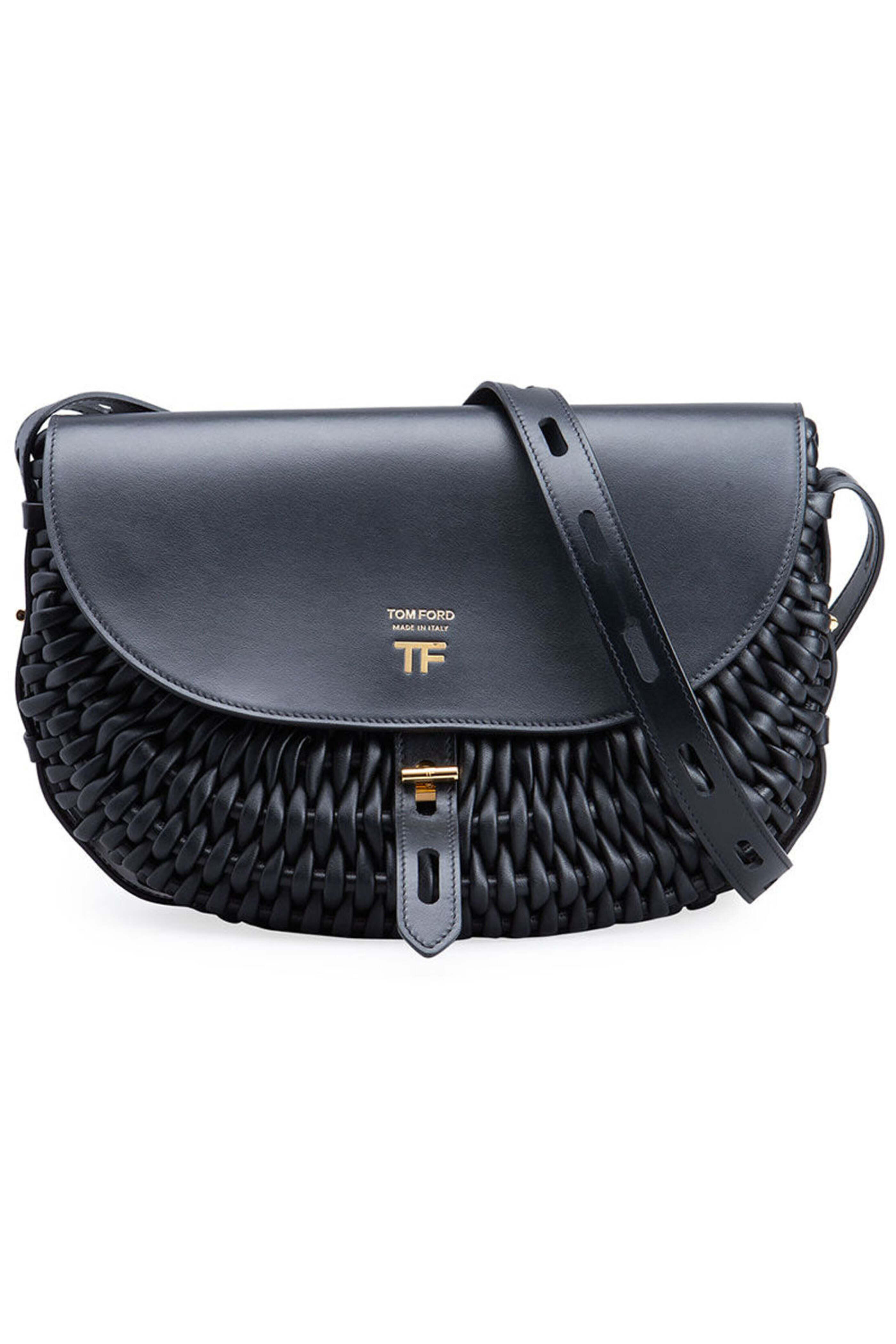 - Tom Ford Black T Twist Woven Leather Saddle Crossbody Flap top with toggle T closure Adjustable shoulder strap Fabric lined interior Tonal stitching 11.5 W X 9 T X 3 D Made in Italy