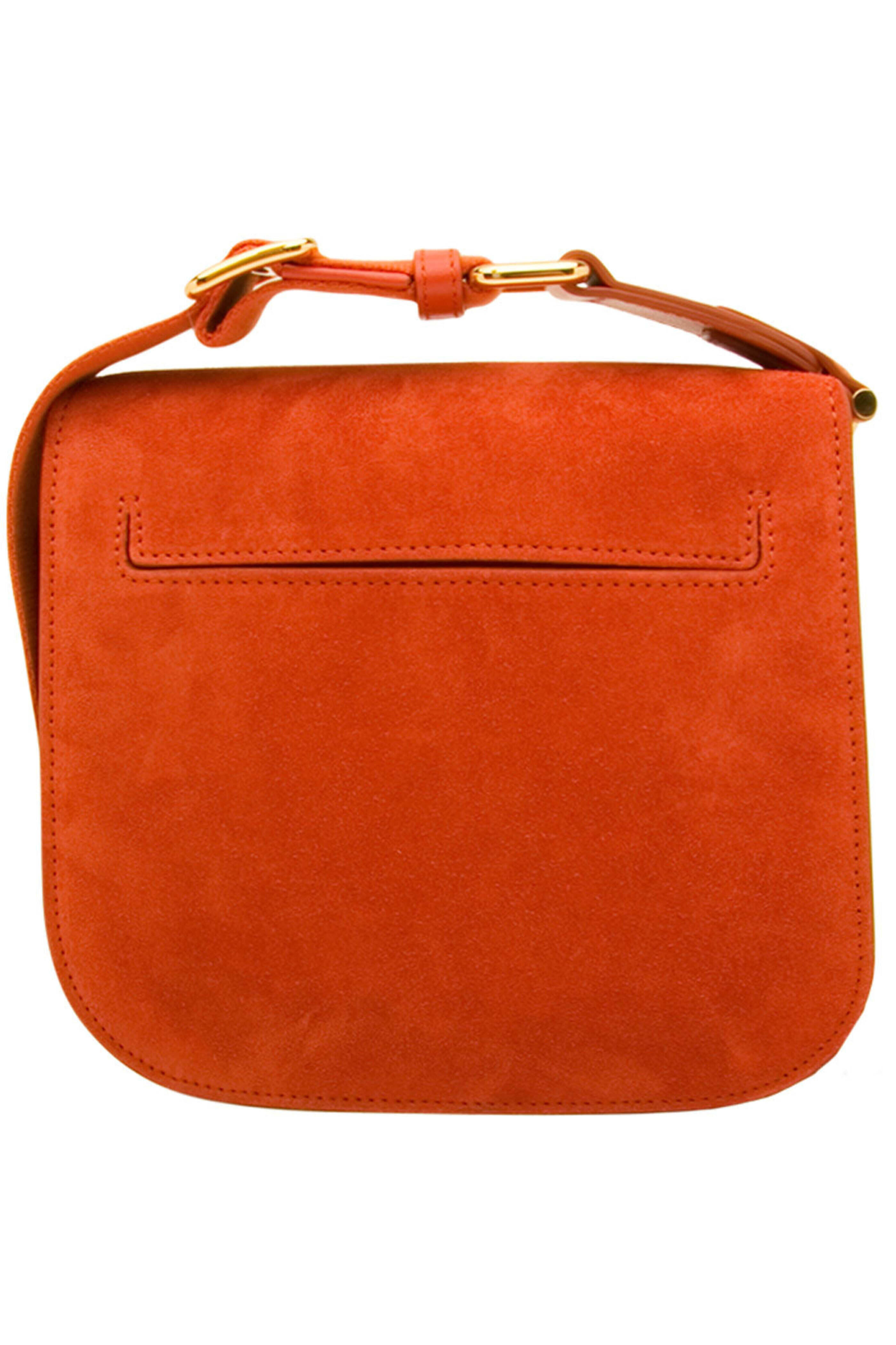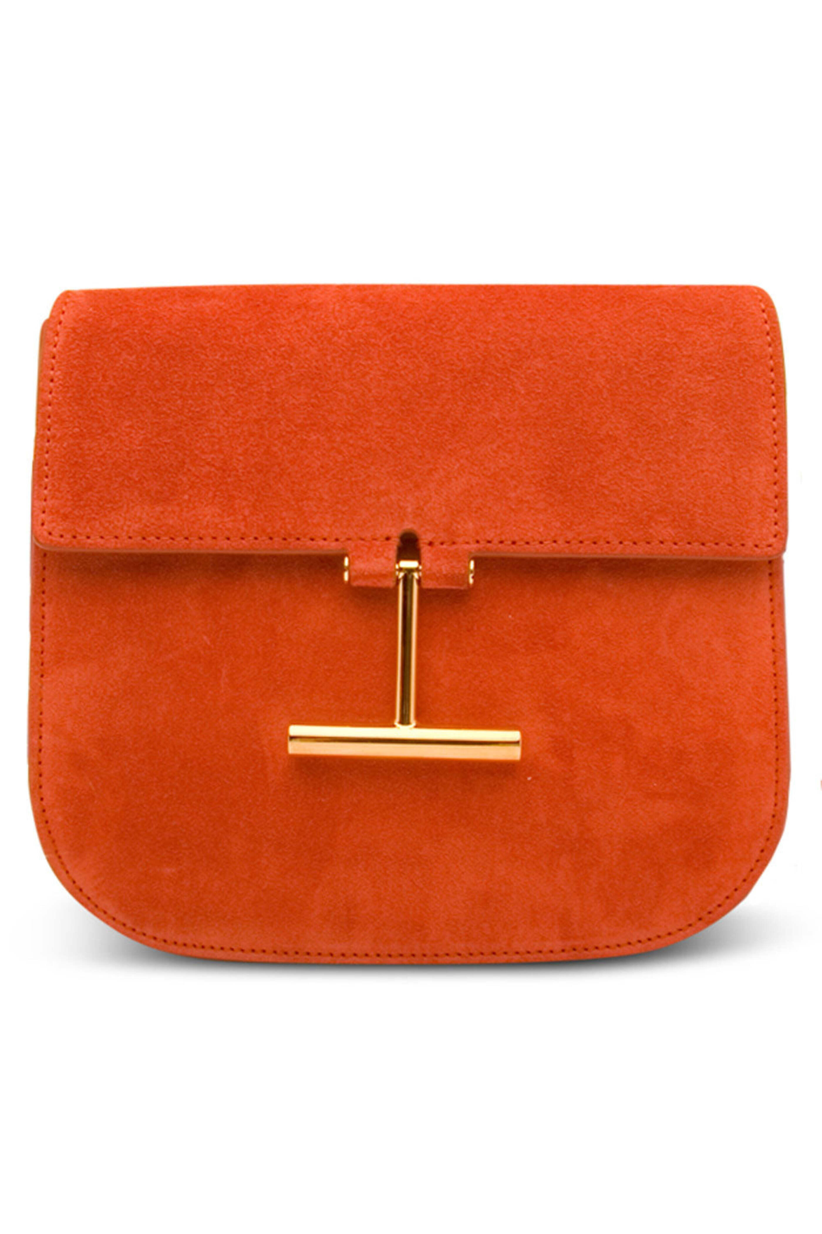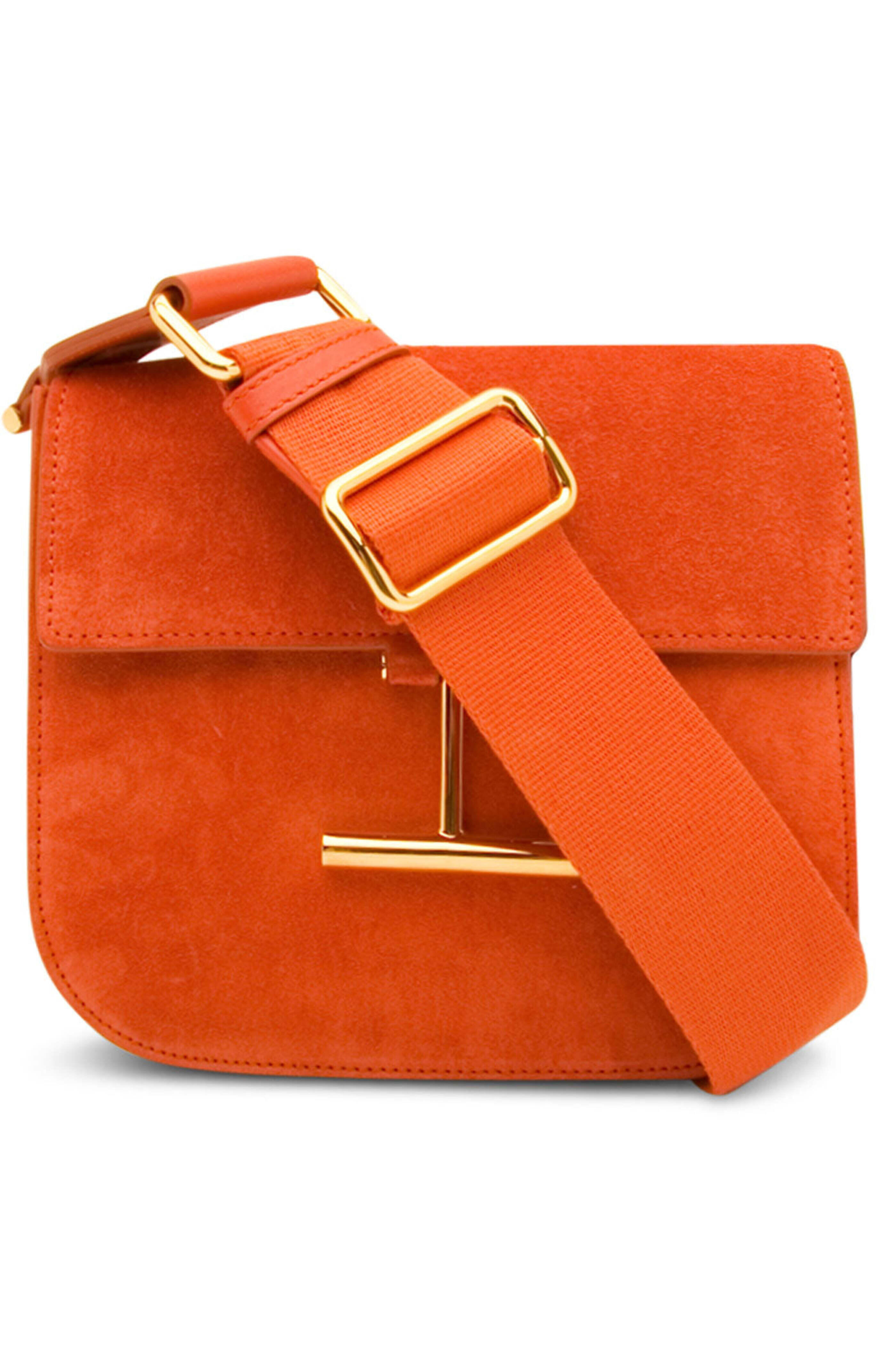 Tom Ford Mini Suede Crossbody in Mango. Flap top with magnetic closure. Adjustable crossbody strap. Interior zip pocket. Back exterior slip pocket. Signature T logo. Gold tone hardware. Suede outer. Leather and suede lining. 8 W X 6.5 H X 3 W. 24 strap drop. 2 webbed strap width. Made in Italy.