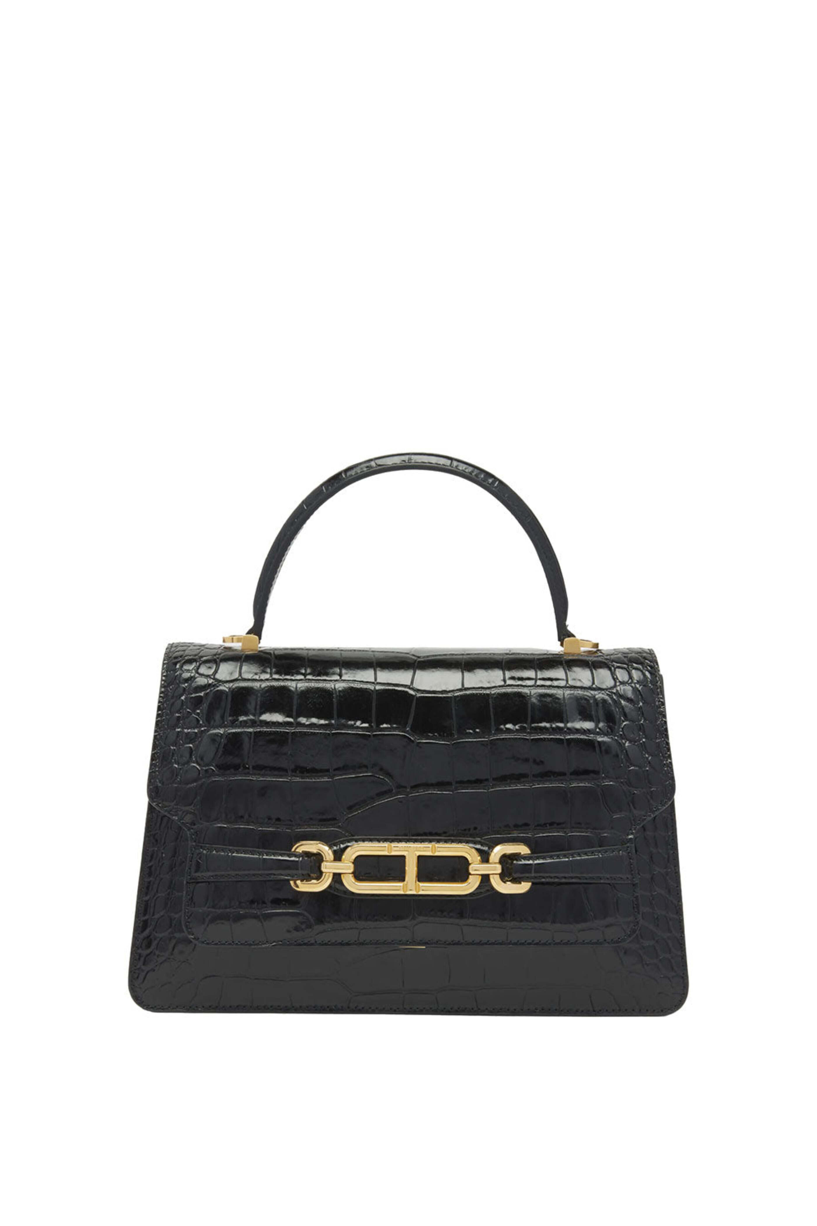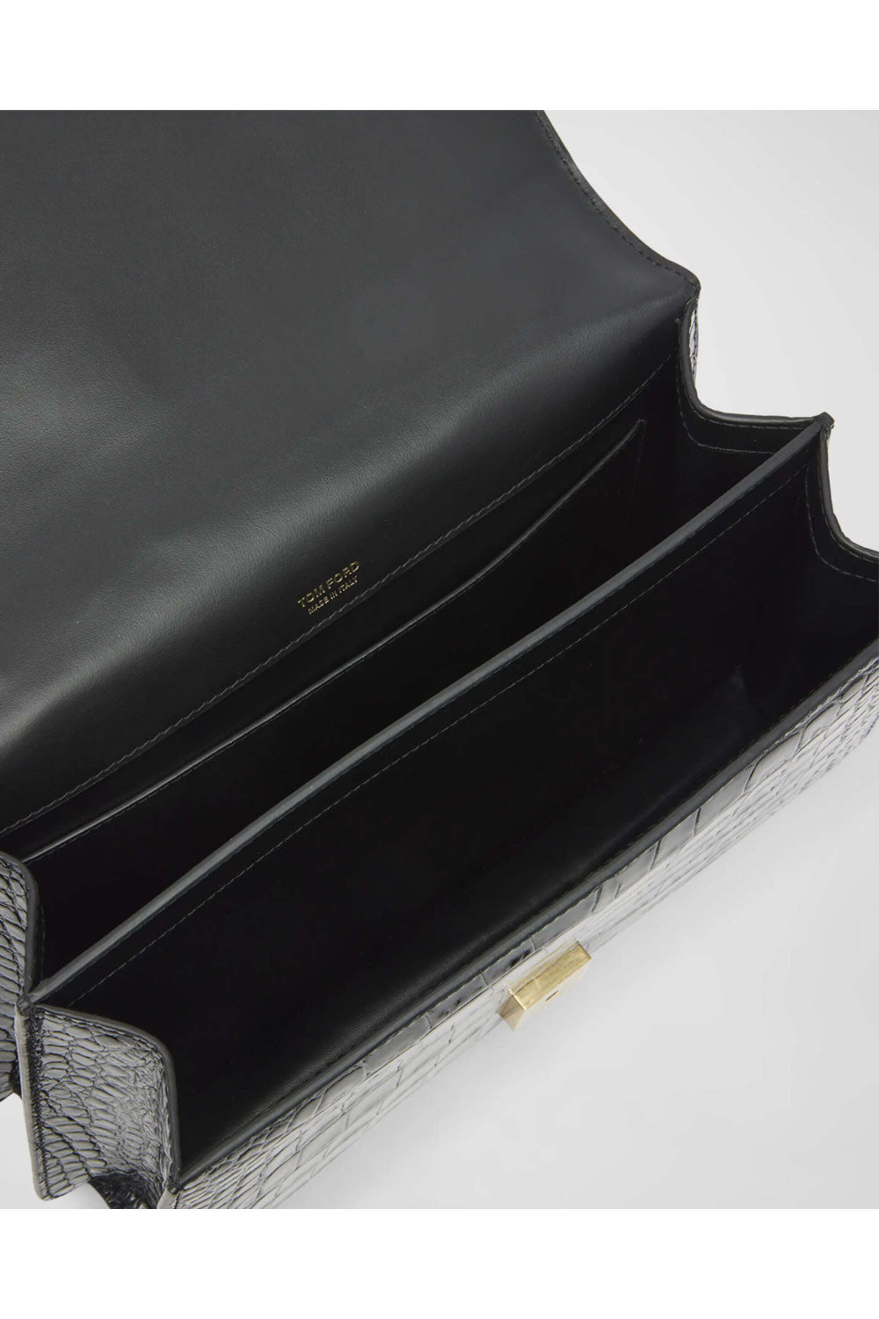 Tom Ford Medium Top Handle in Black. Flap top with magnetic closure. Flat top handle. Detachable, adjustable chain shoulder strap. Divided interior. One interior slip pocket. Shiny croc-embossed leather. Leather lining. 11.4W x 7.9H x 3.9D. 40.9 strap drop. Made in Italy.