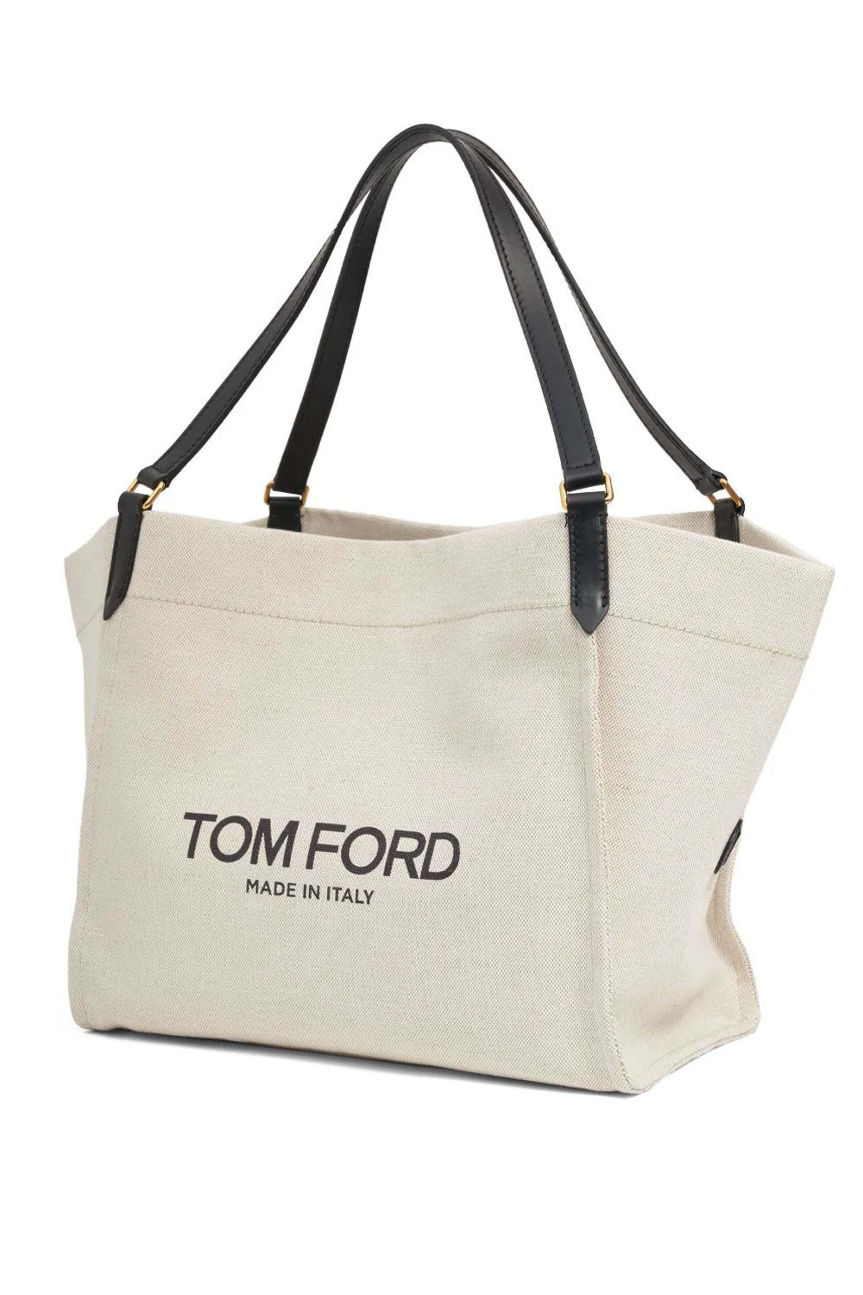 Tom Ford Large Amalfi Canvas Tote in Black and Rope. Magnetic closure. Dual top handles. Front logo detail. Internal zip pocket. Canvas outer and lining. 14W x 12H x 5.5D. 9.5 handle drop. Made in Italy.