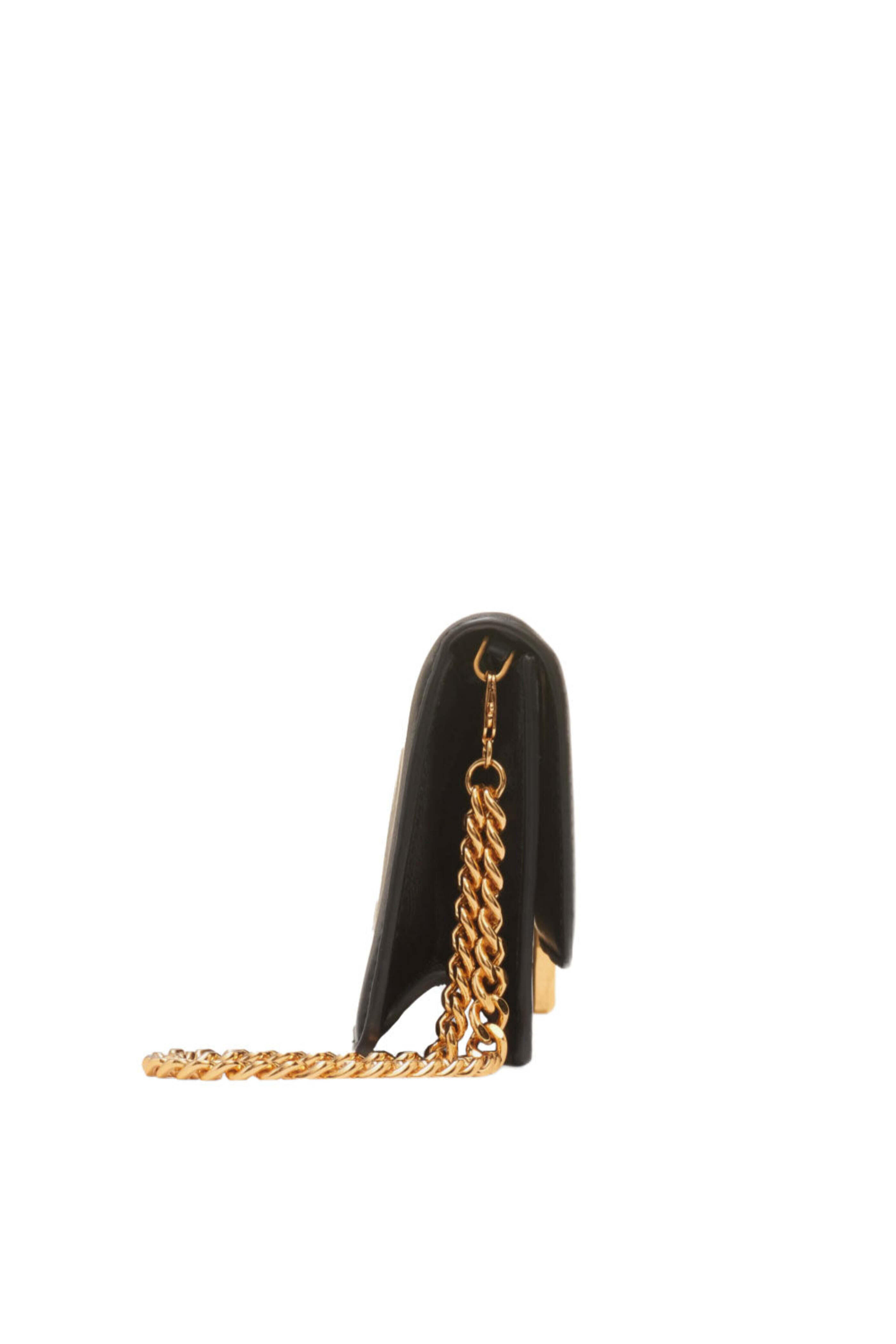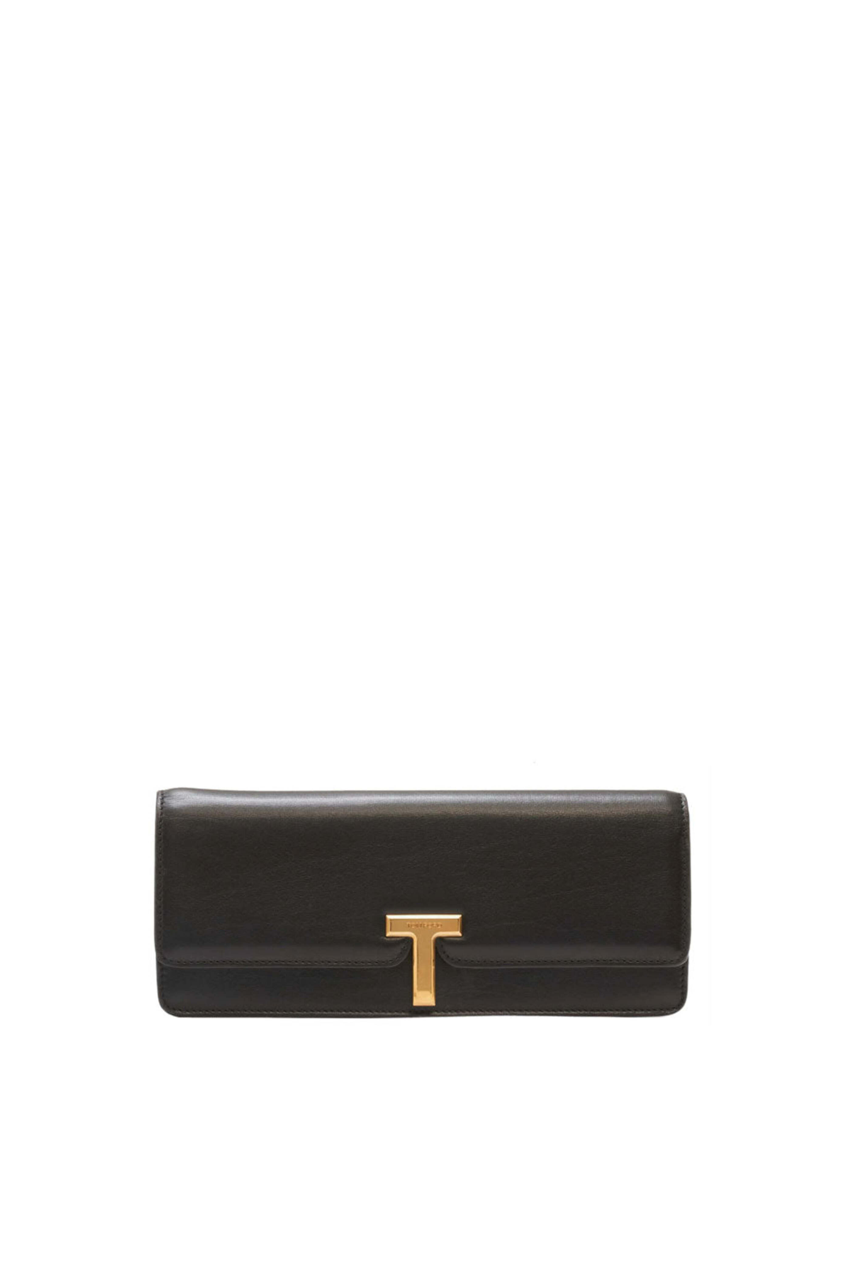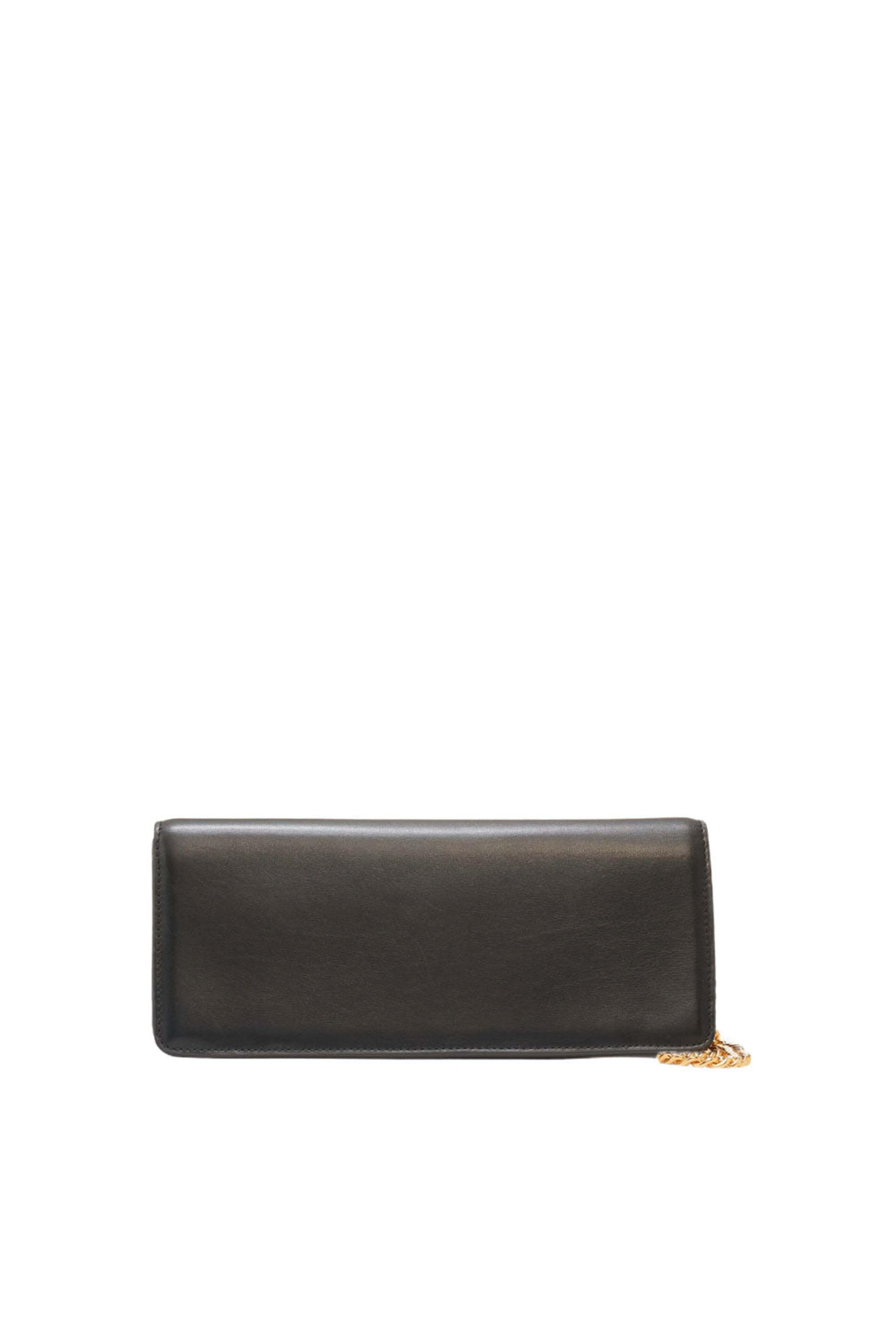 Smooth calfskin leather outer. leather lining. Magnetic-snap flap closure. Removable chain wrist strap. Gold-tone hardware. Interior zip pocket. Made in Italy. 11" W x 4.75" H x 1.5" D.