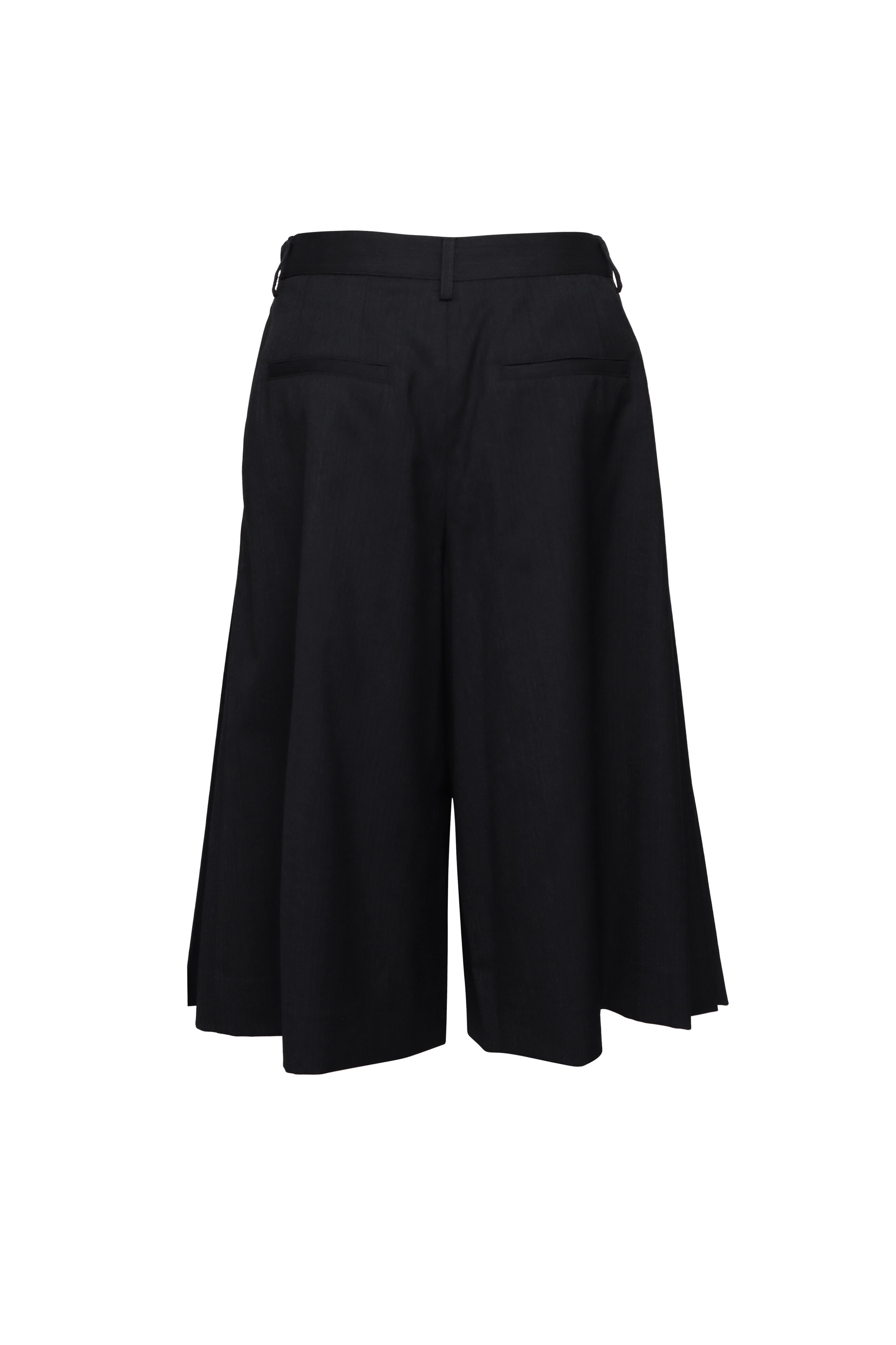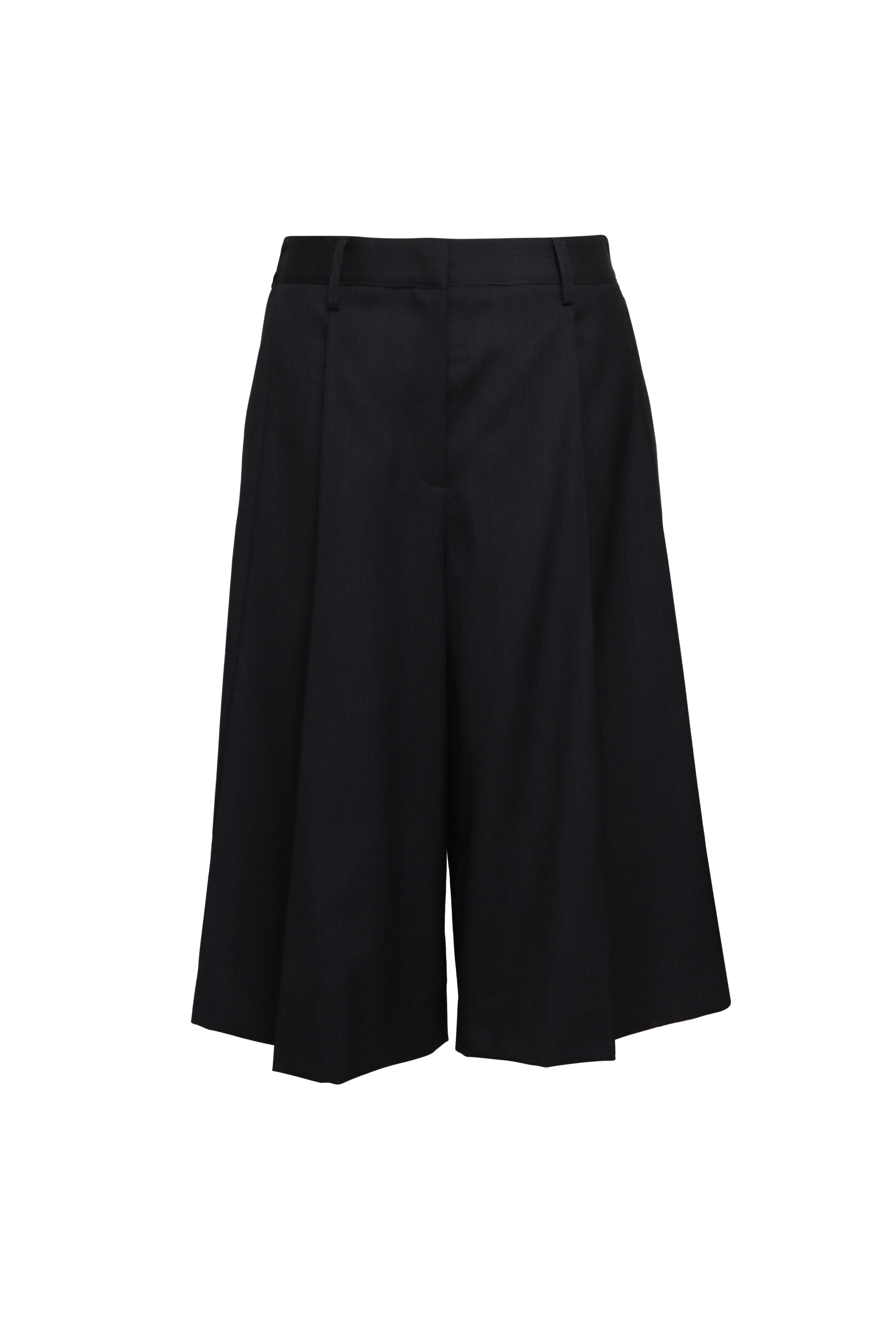 High rise. Hook and eye closure. Zip fly. Belt loops. Side slip pockets. Back welt pockets. Pleated throughout. Imported. Knee length. 98% wool, 2% elastane. Dry clean.