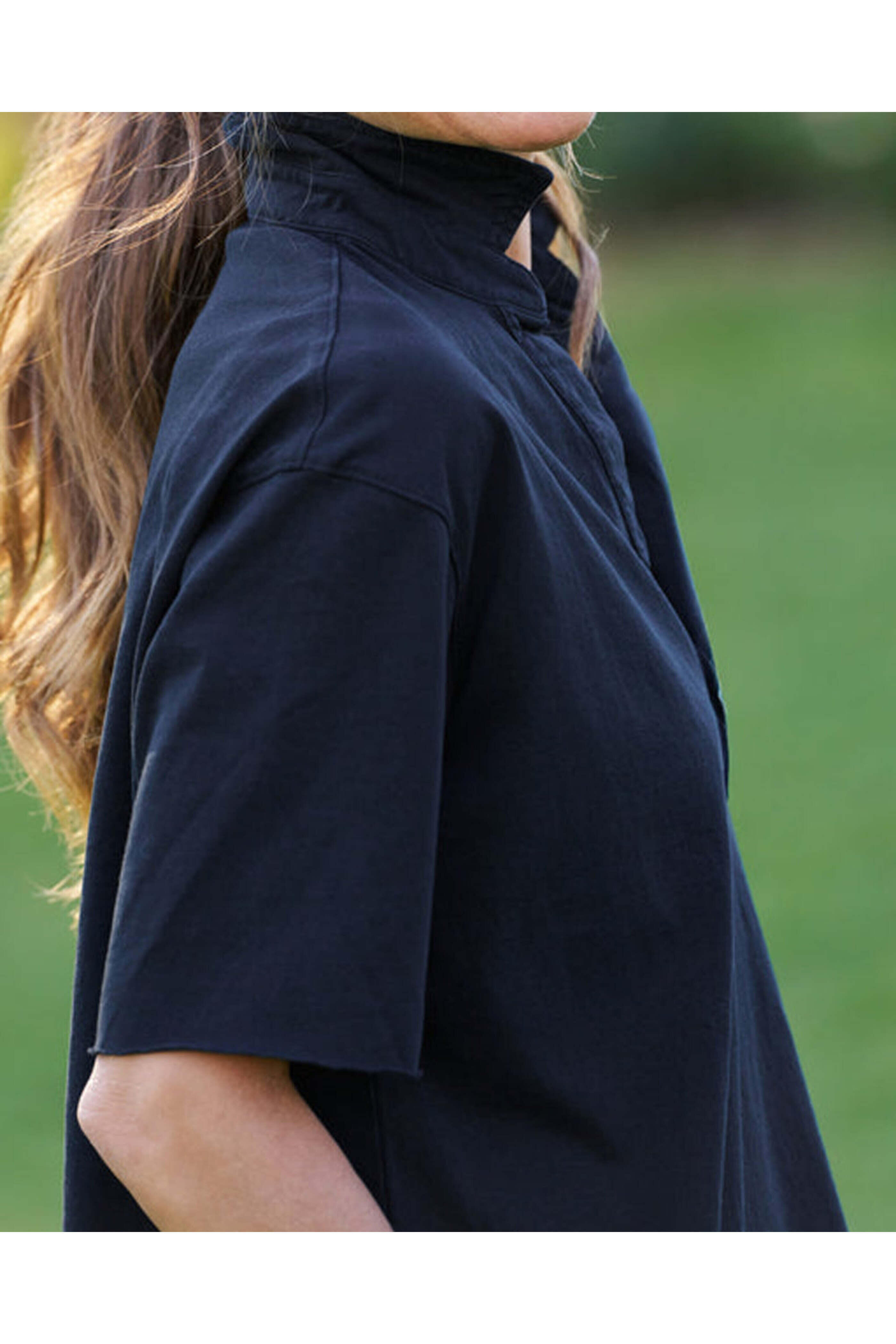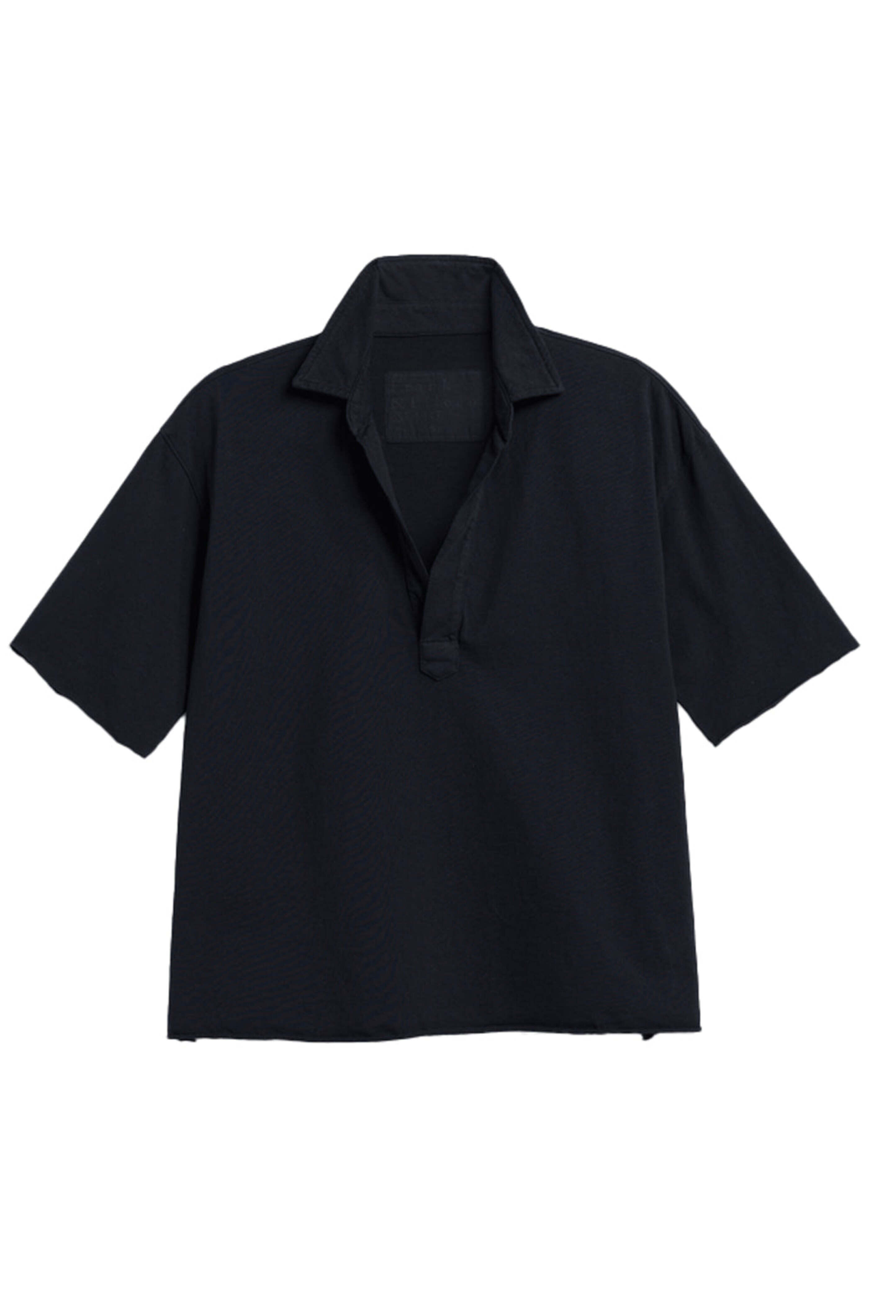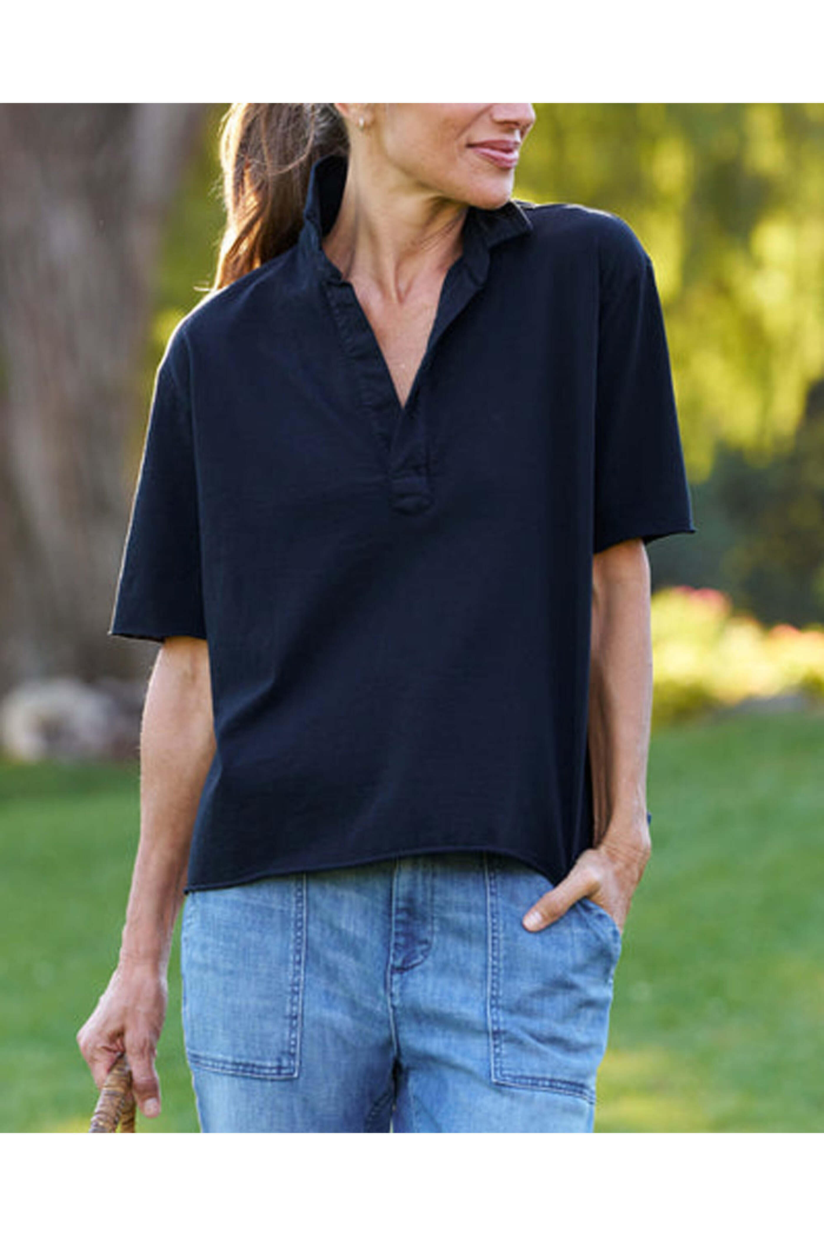 Frank & Eileen British Royal Navy Patty Popover. Collar. V neck. Drop shoulders. Elbow length sleeves. Raw cuffs and hem. Boxy fit. Slightly cropped length. Jersey fabrication. 100% cotton.