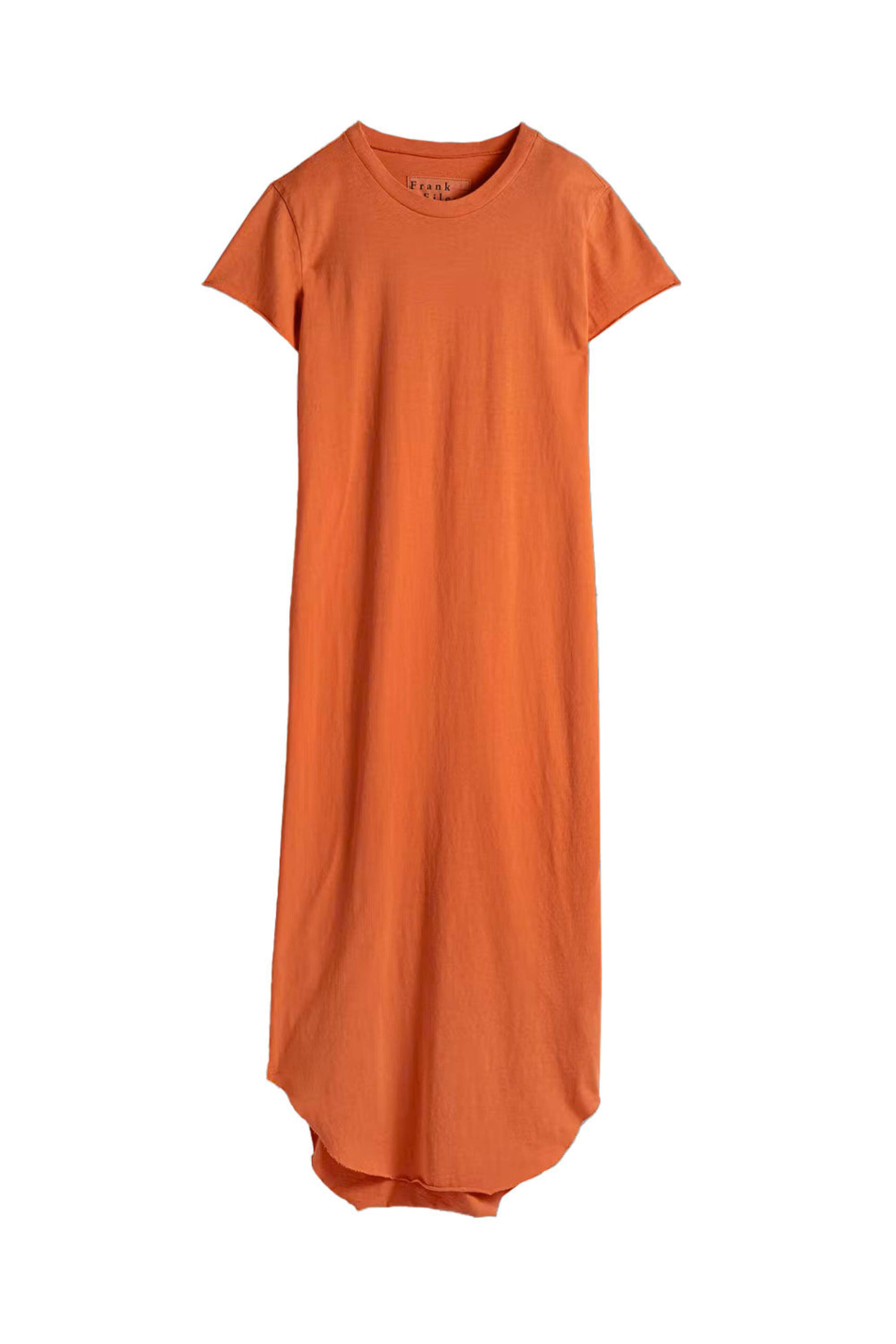 Frank & Eileen Tangerine T-Shirt Dress. Crew neck. Short sleeves. Relaxed fit. Rounded hem. Midi length. Jersey fabrication. 100% cotton.