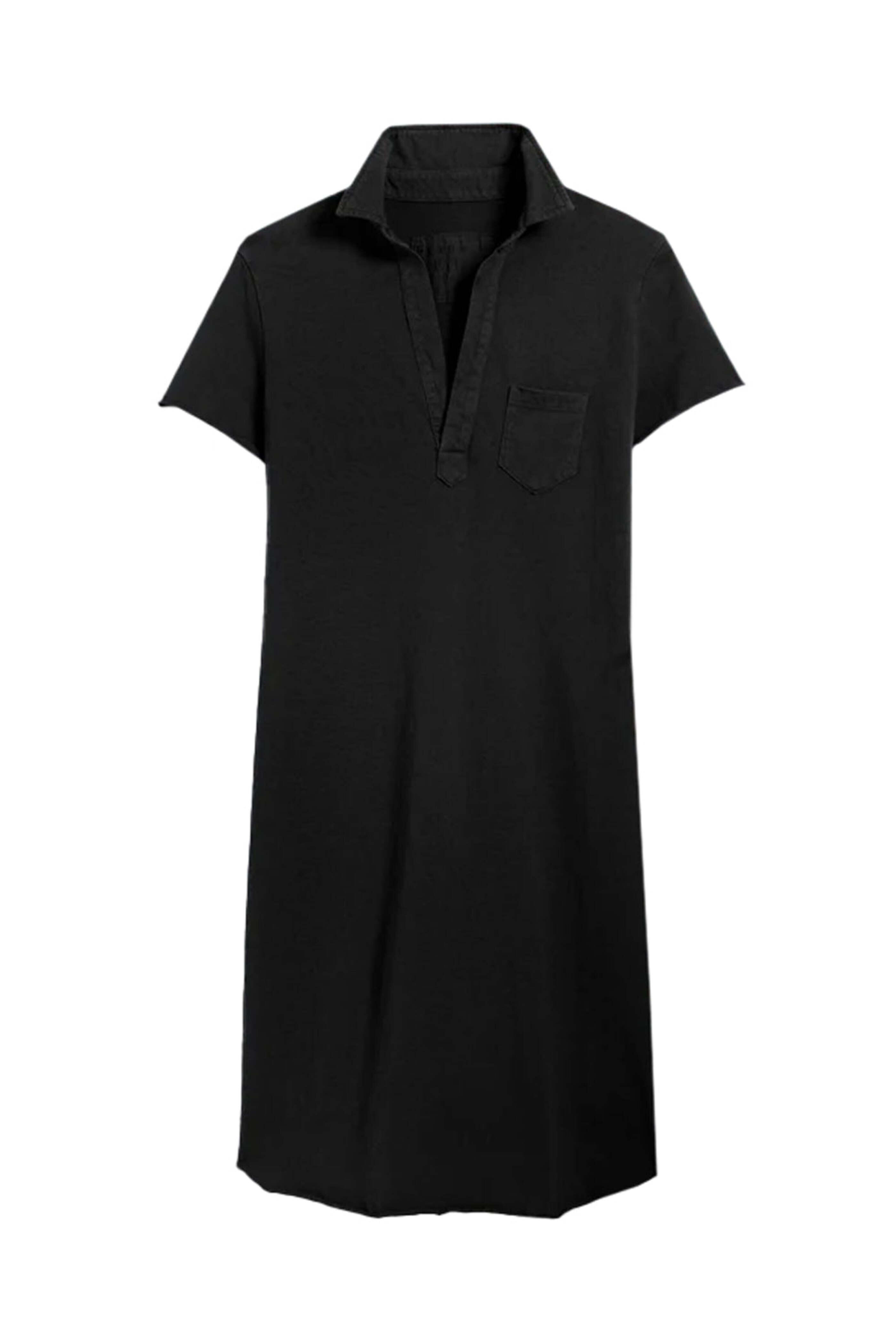 Frank & Eileen Black Lauren Polo Dress. Polo collar. V neck. Short sleeves. Single chest pocket. Relaxed fit. Rounded raw hem. Jersey fabrication. 100% cotton.