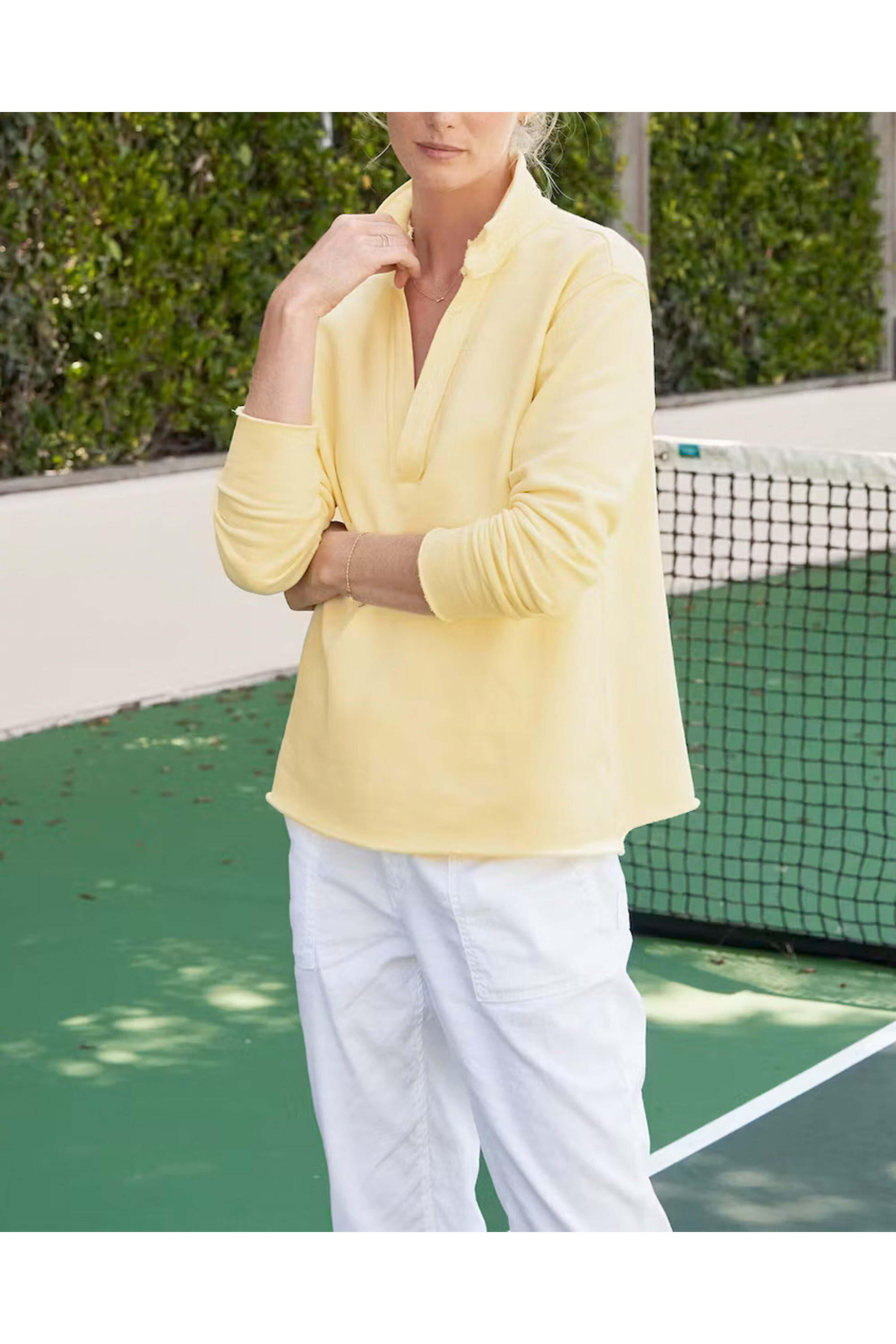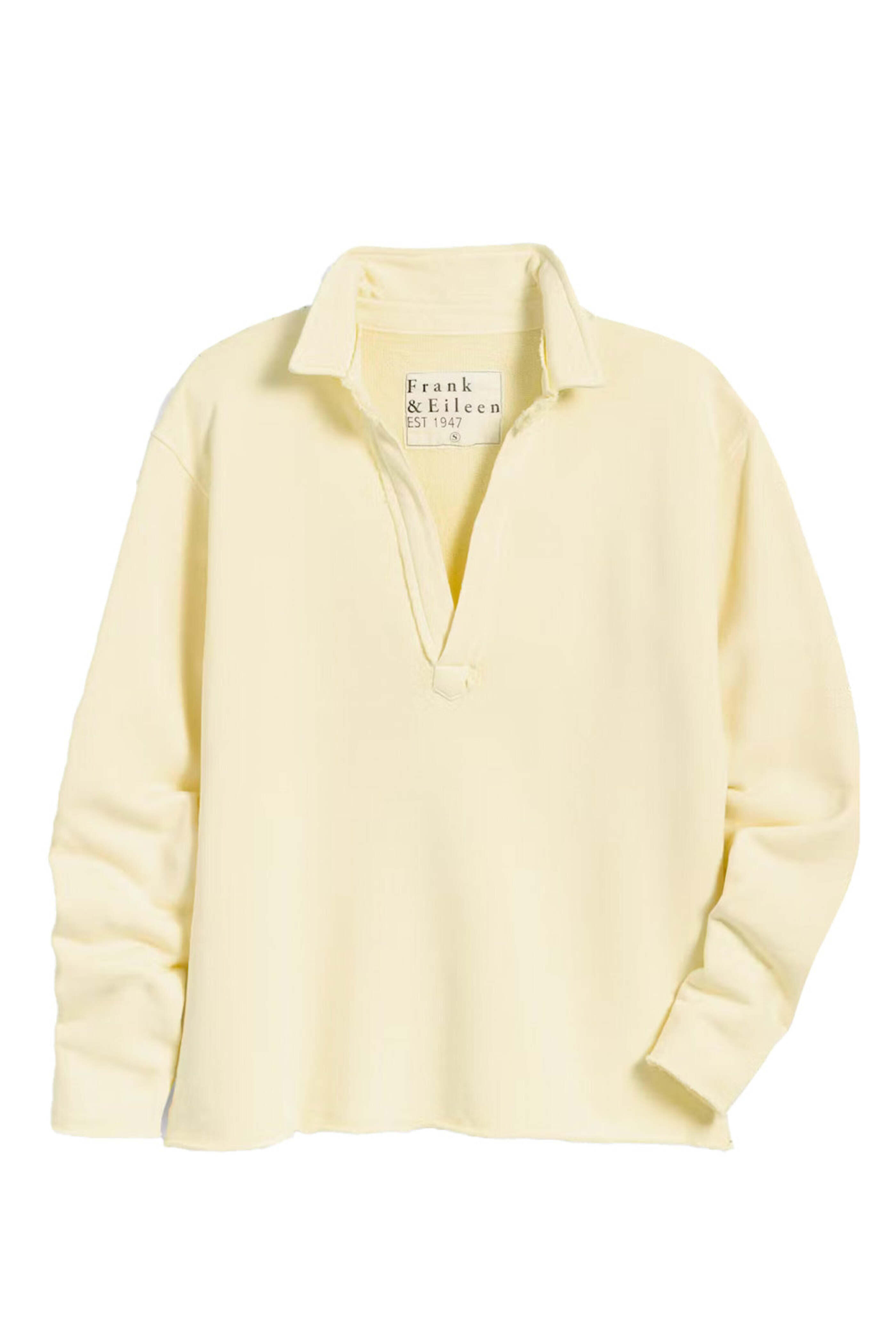 Frank & Eileen White Popover Henley . Shirt collar . V neck . Long sleeve . Cut-off hem . Relaxed fit . 100% cotton .