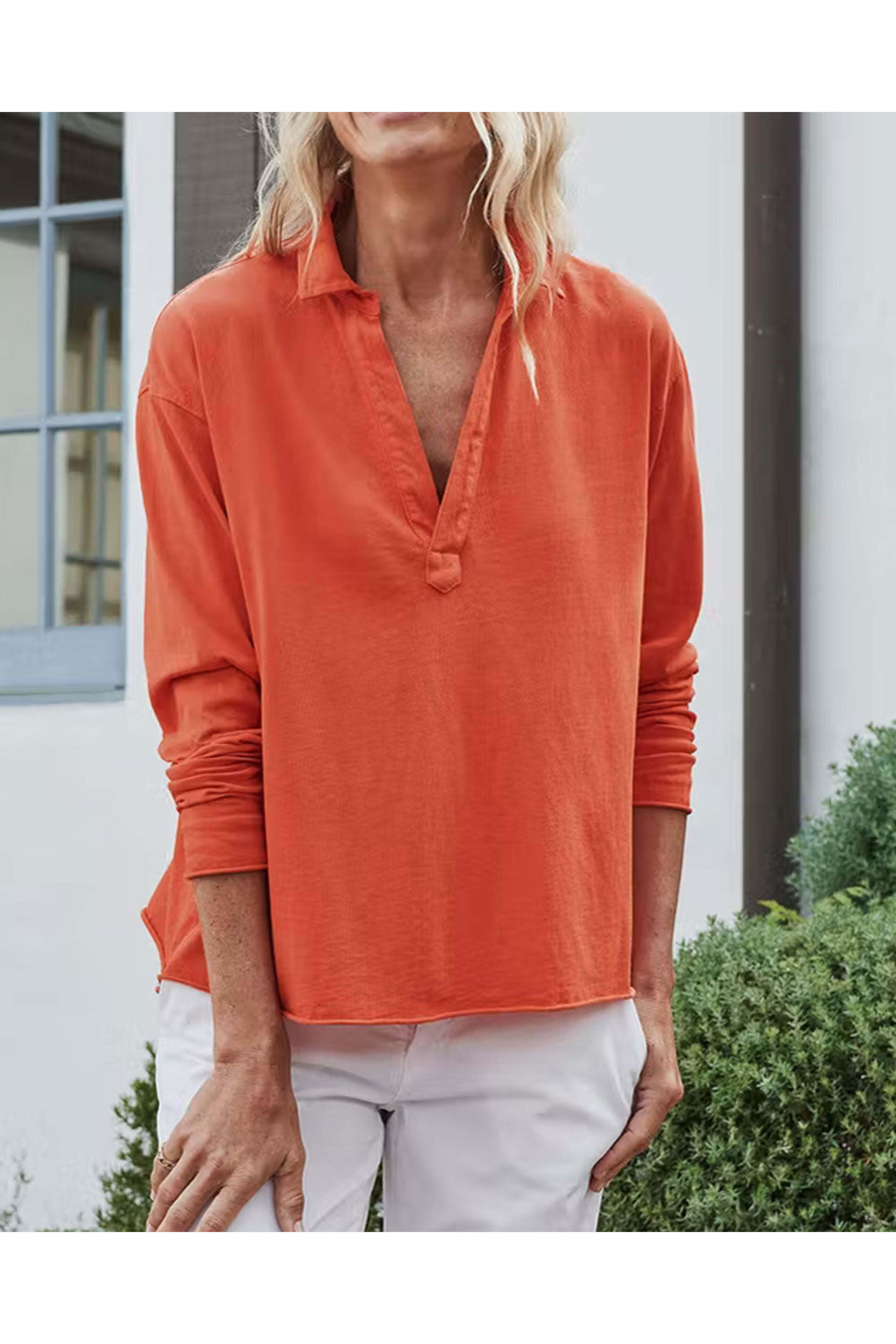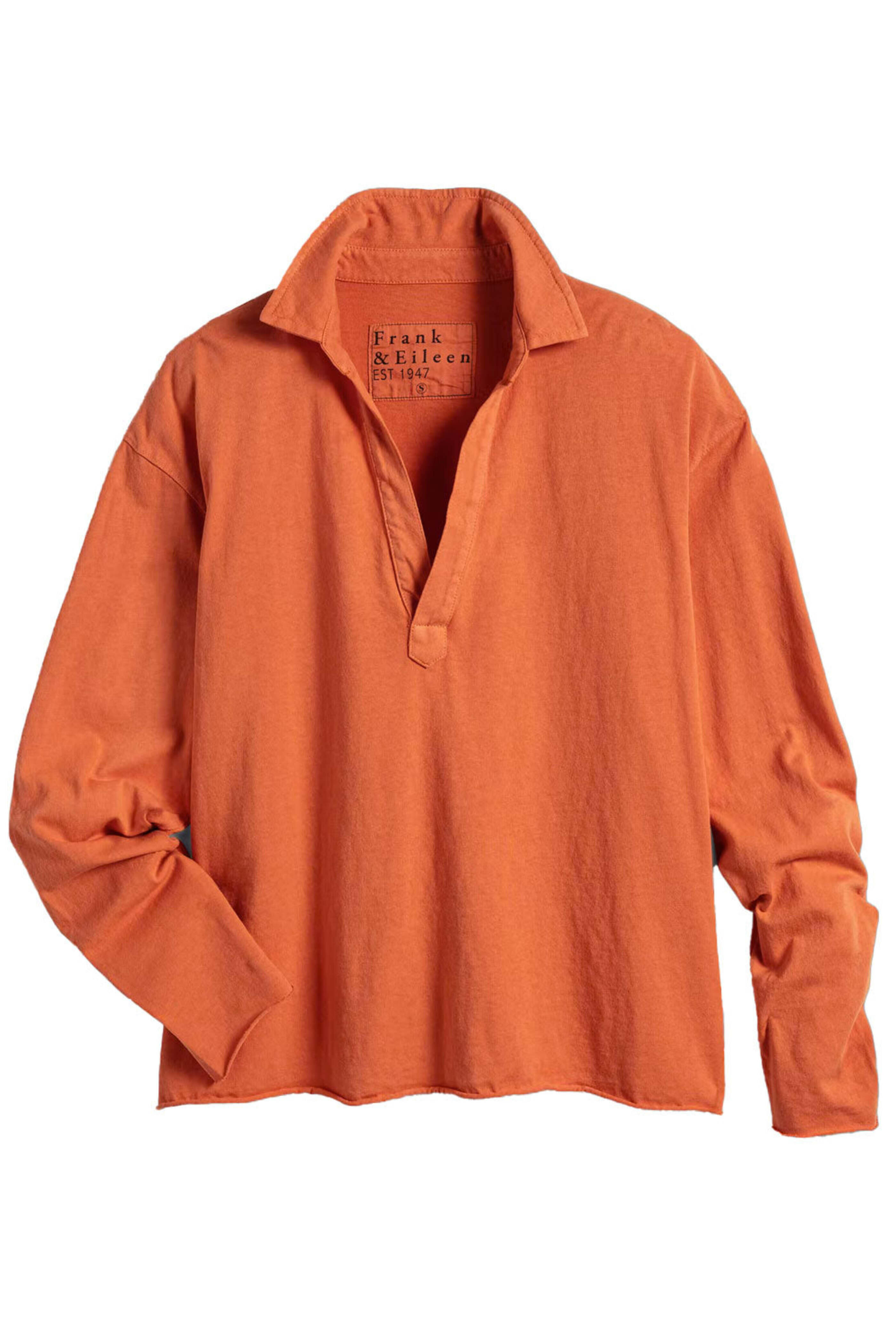 Frank & Eileen Tangerine Popover Henley. Collar. V neck. Drop shoulders. Long sleeves. Relaxed fit. Raw hem. Jersey fabrication. 100% cotton.