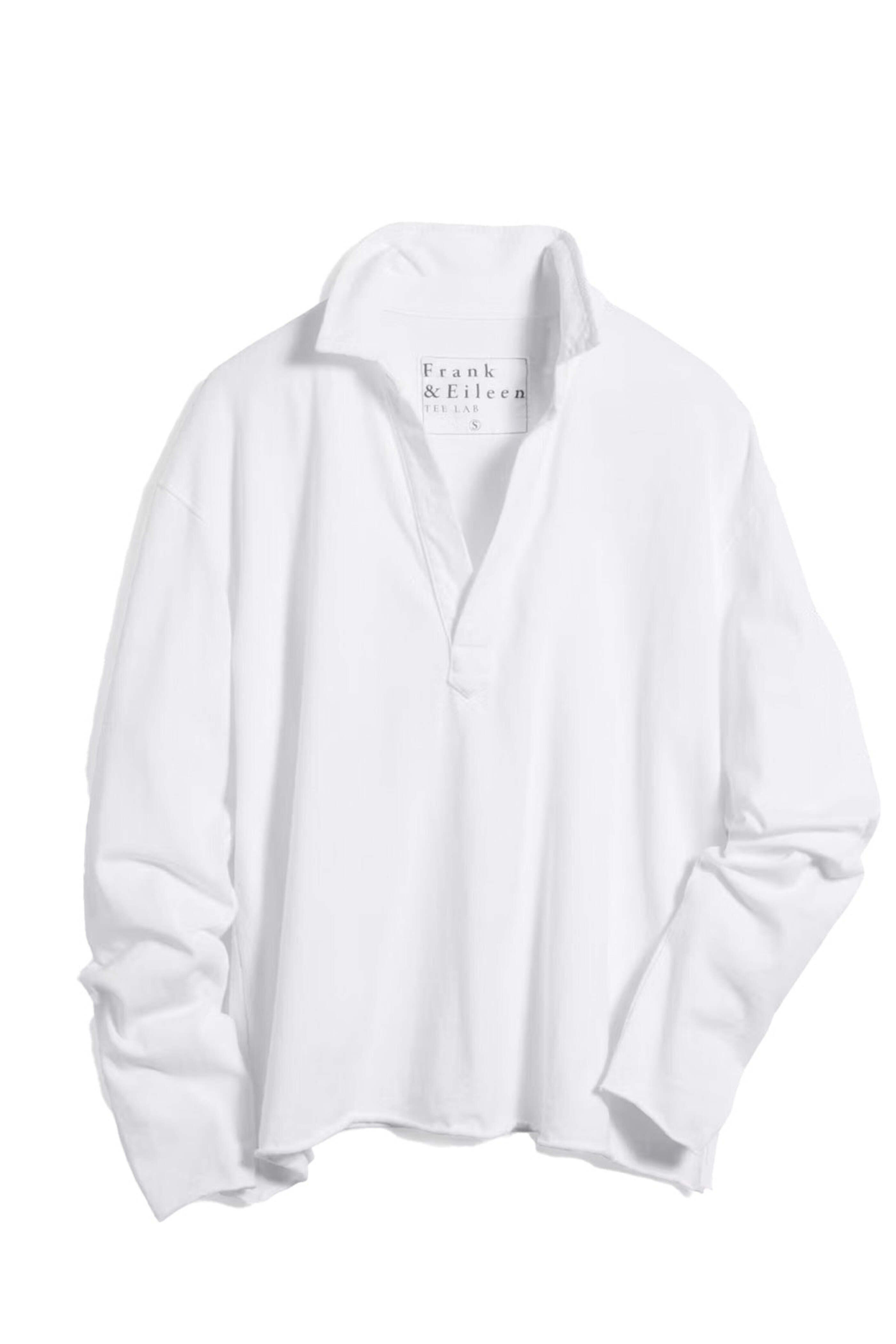 Frank & Eileen White Popover Henley . Shirt collar . V neck . Long sleeve . Cut-off hem . Relaxed fit . 100% cotton .