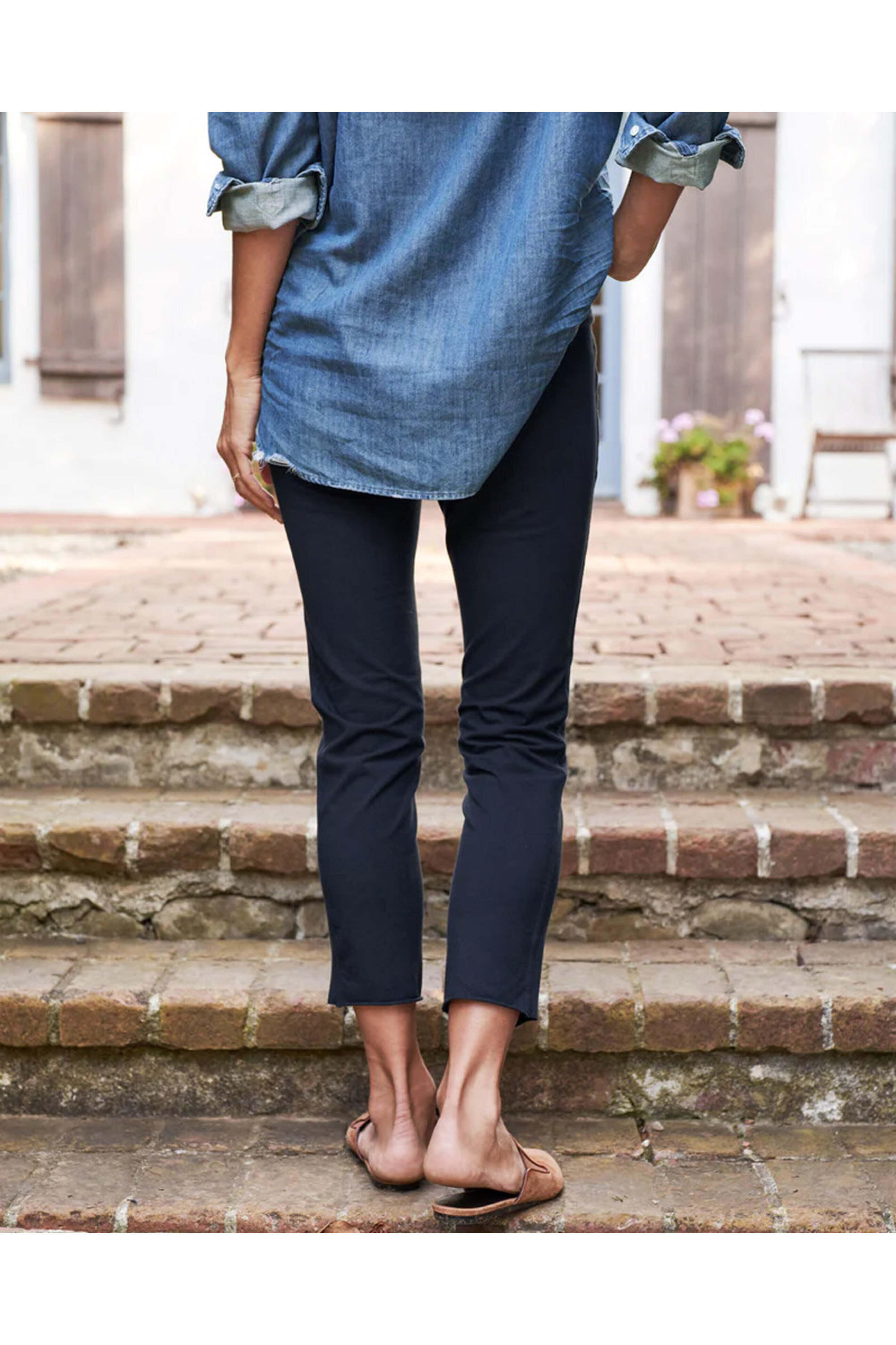 Frank & Eileen British Royal Navy Murphy Pant. Mid rise. Closureless. Belt loops. Side slip pockets. Faux back pockets. Straight silhouette. Cropped length. Stretch fabrication. 88% cotton, 12% spandex.