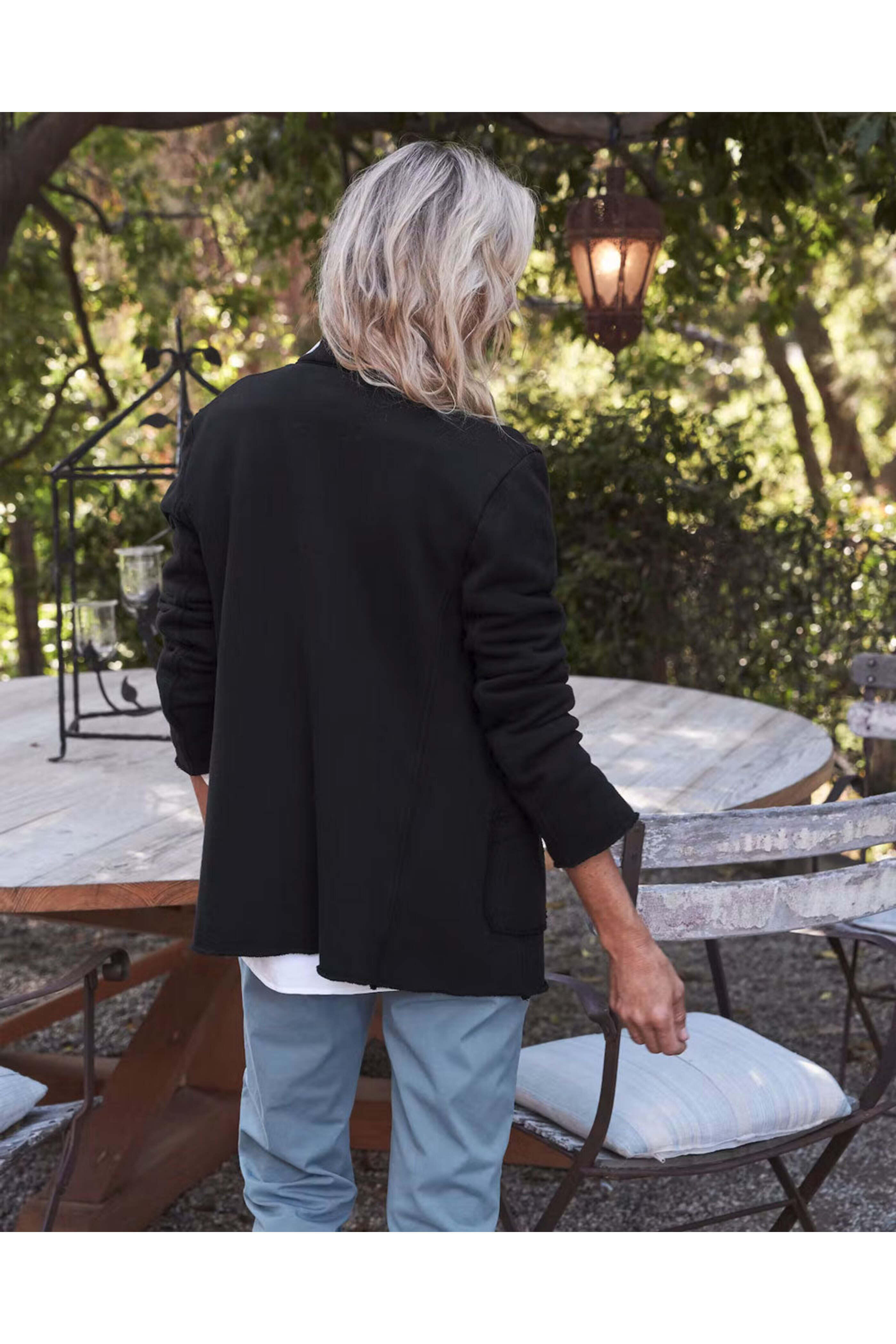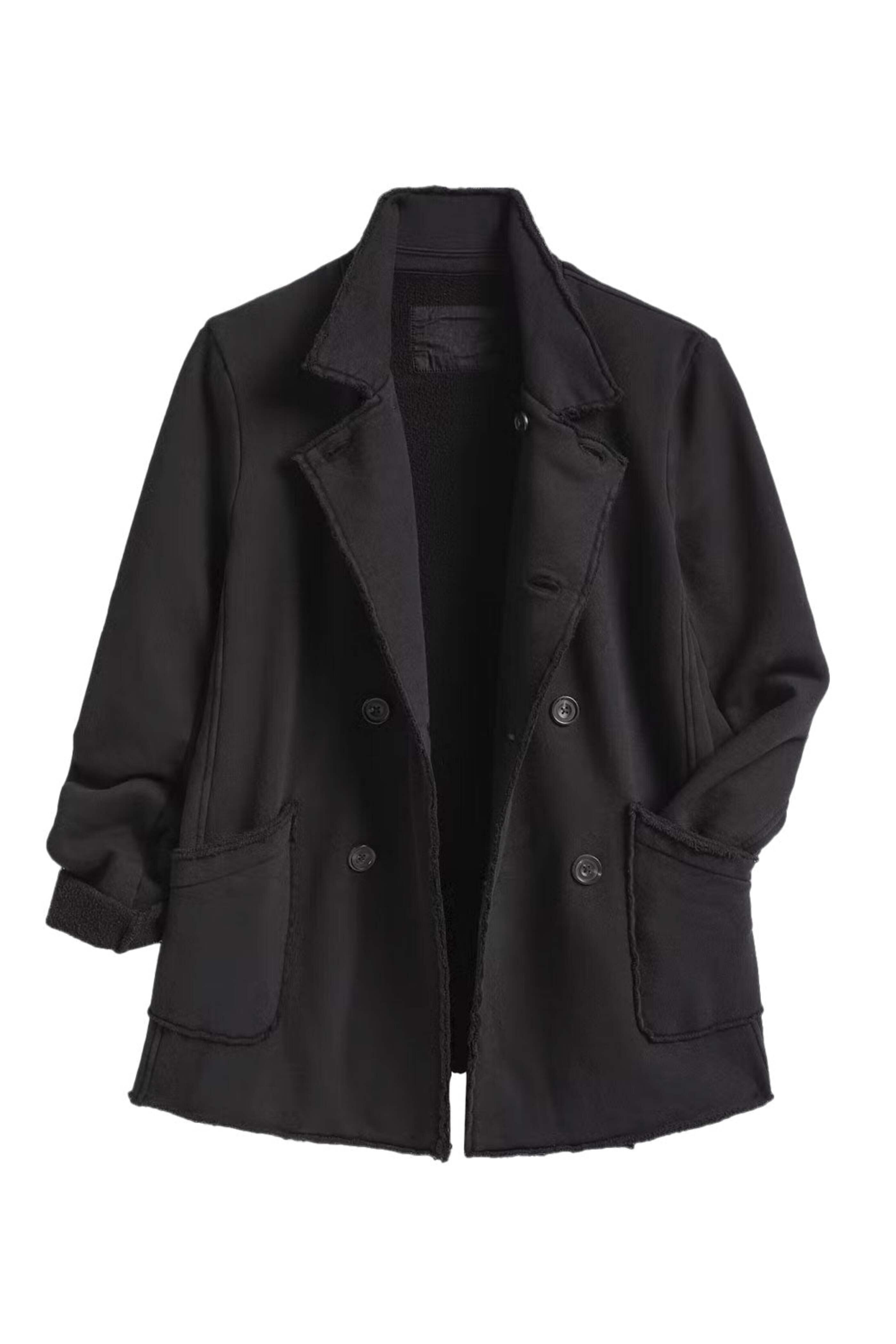 Frank & Eileen Black Belfast English Peacoat. Notch collar. Long sleeves. Button down front closure. Front patch pockets. Raw hem. Relaxed fit. 100% Cotton.