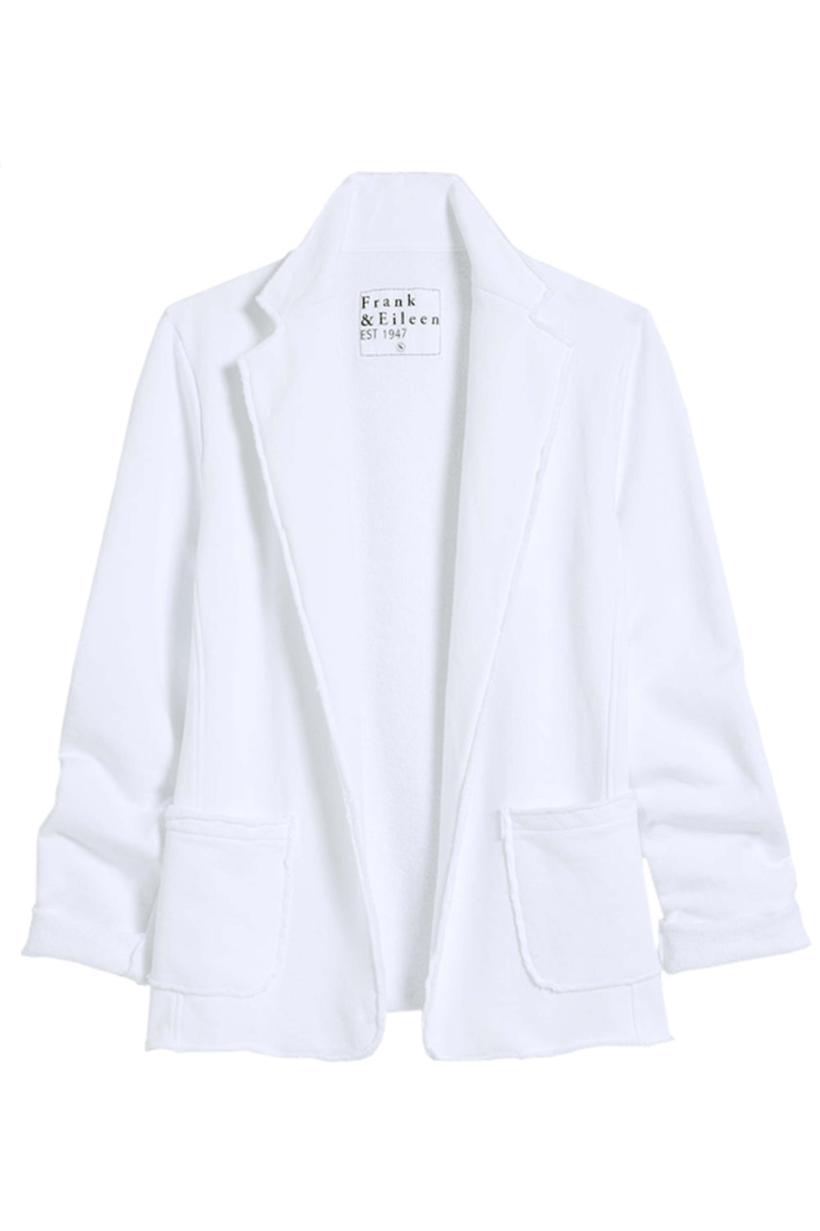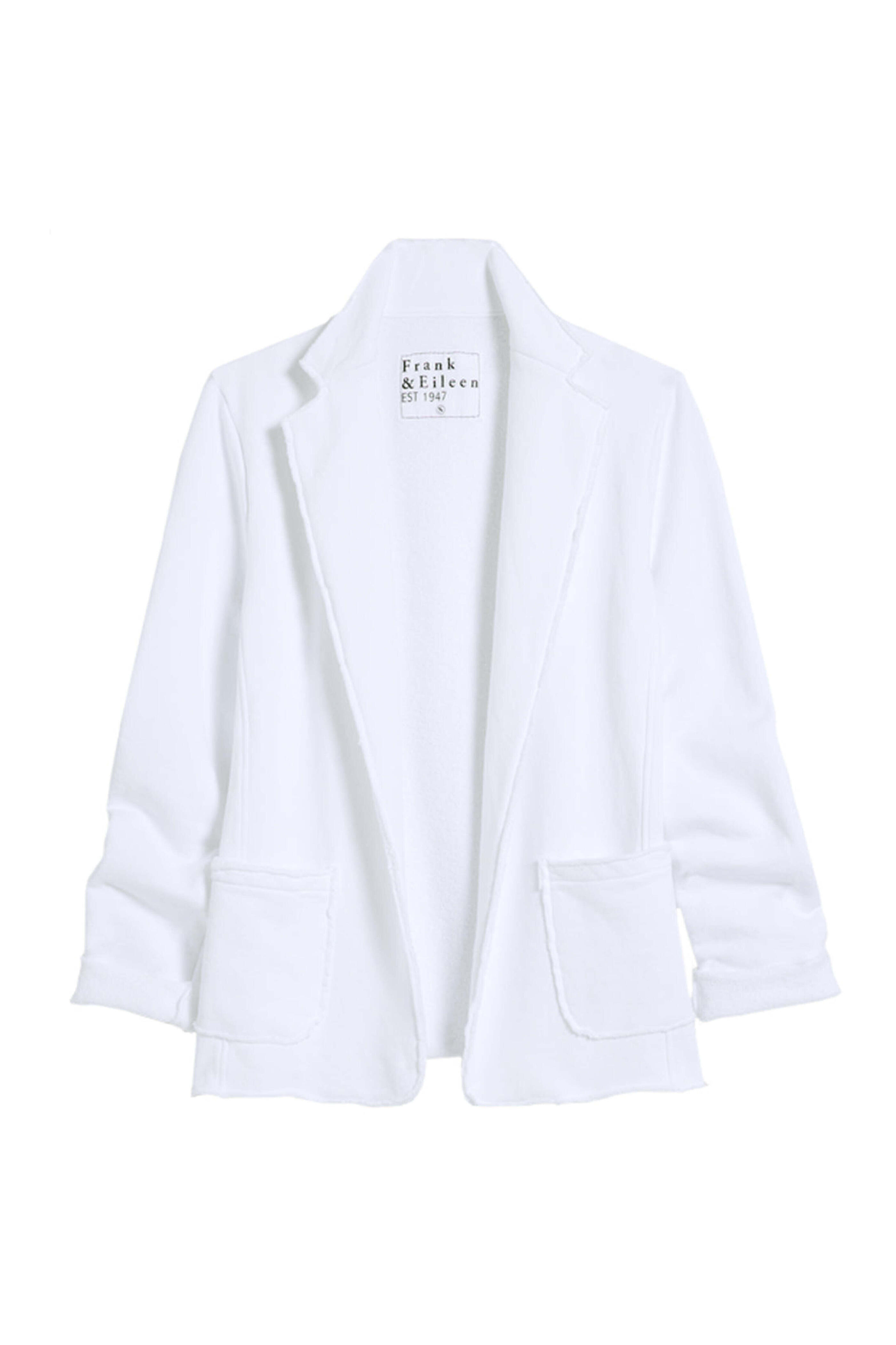 Frank & Eileen White Dublin Knit Blazer. Notch lapel. Long sleeves. Open front. Hip patch pockets. Fleece fabrication. 100% cotton.