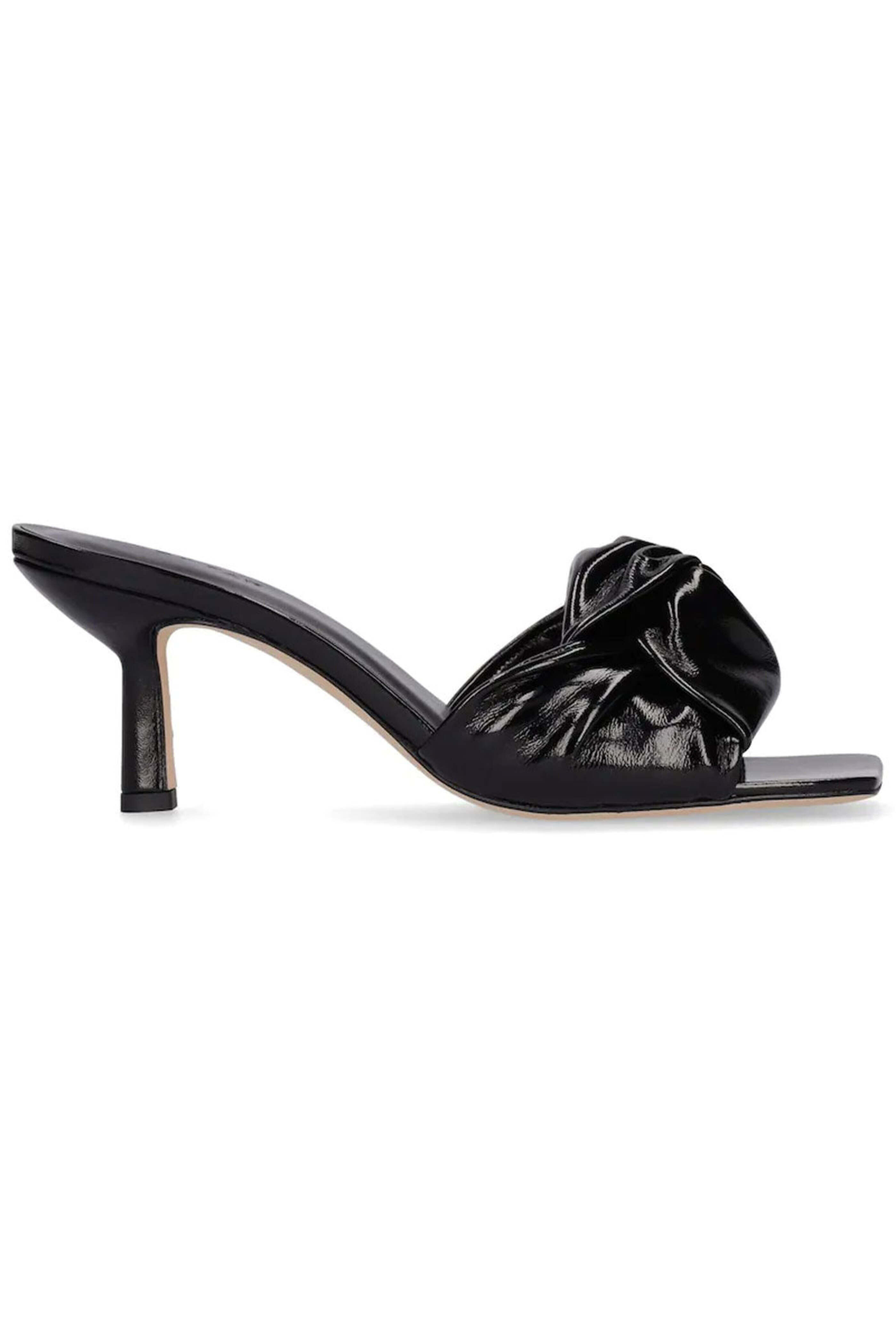 By Far Lana Gloss Leather Mule in Black. Square open toe. Knotted strap. Slip on. 2.55 heel. Leather upper, lining and sole.