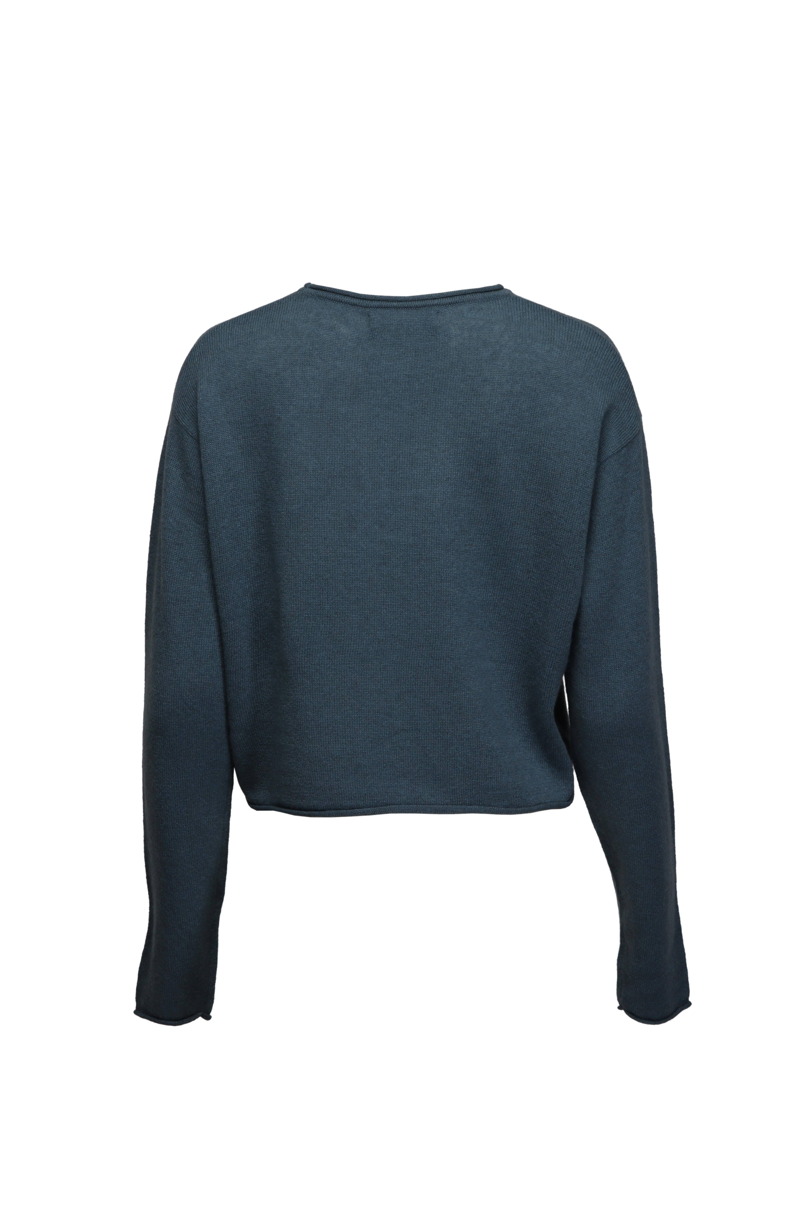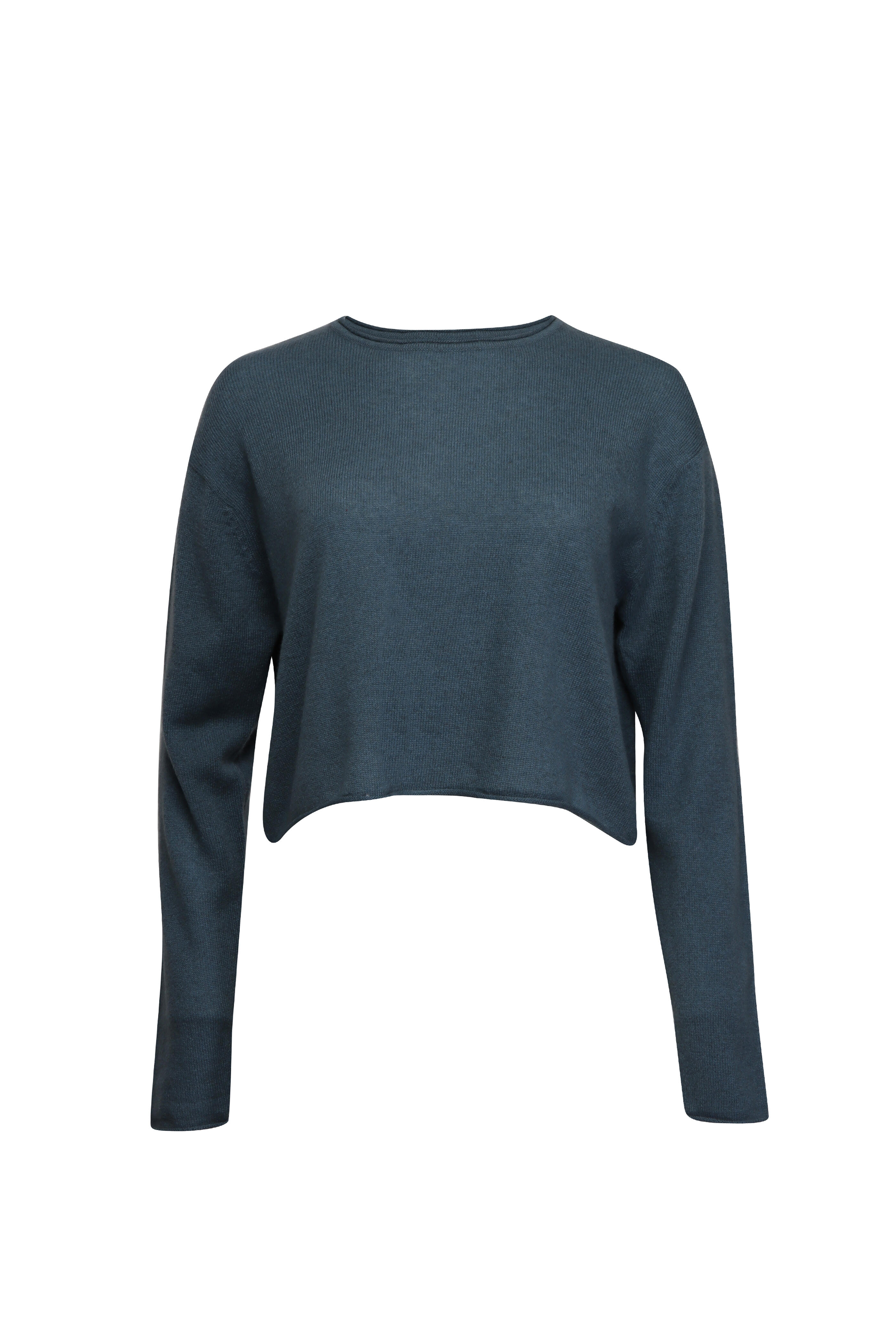 Round neck. Drop shoulders. Long sleeves. Boxy fit. Cropped length. Imported. Bust 33” (Size S). 100% cashmere. Dry clean.