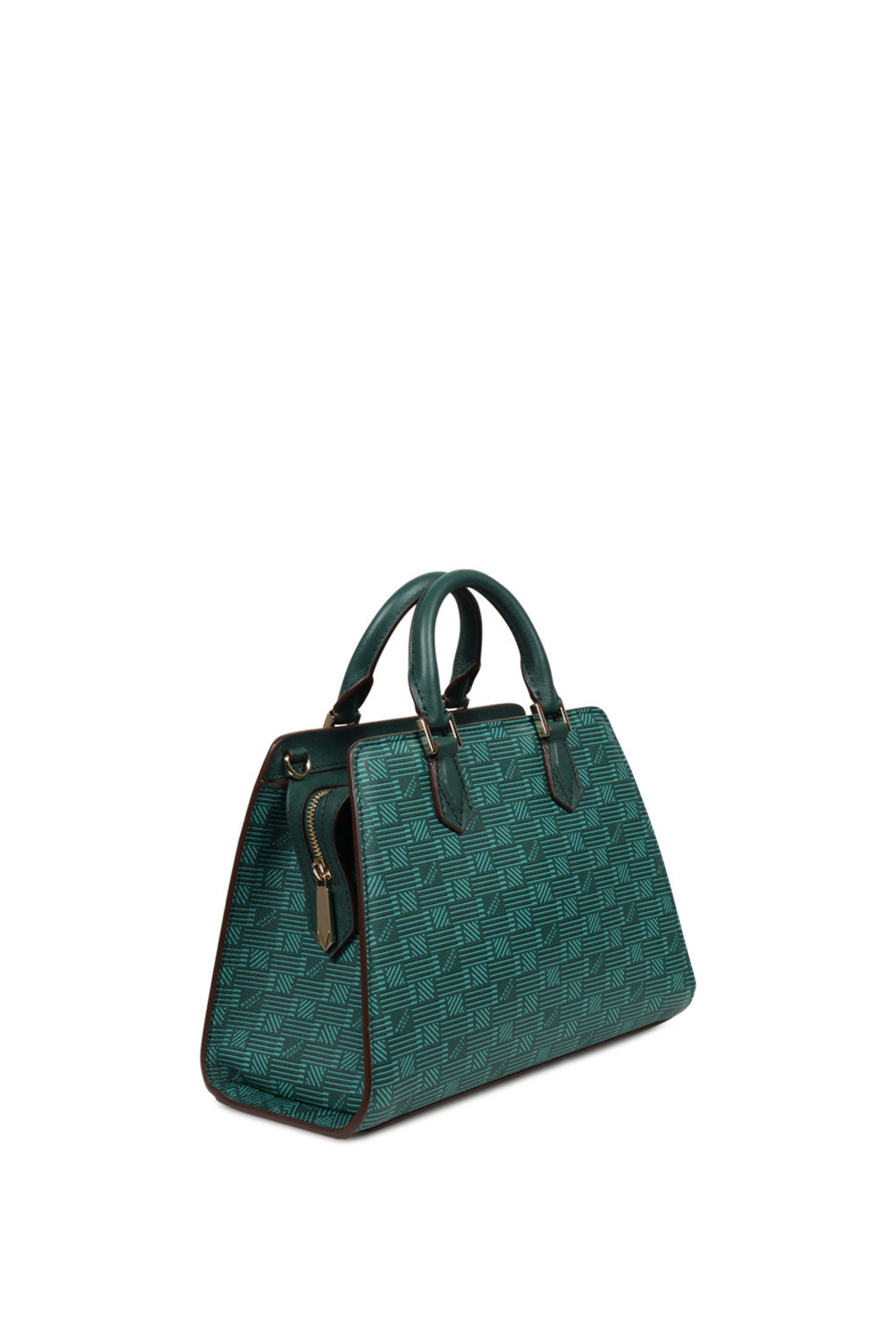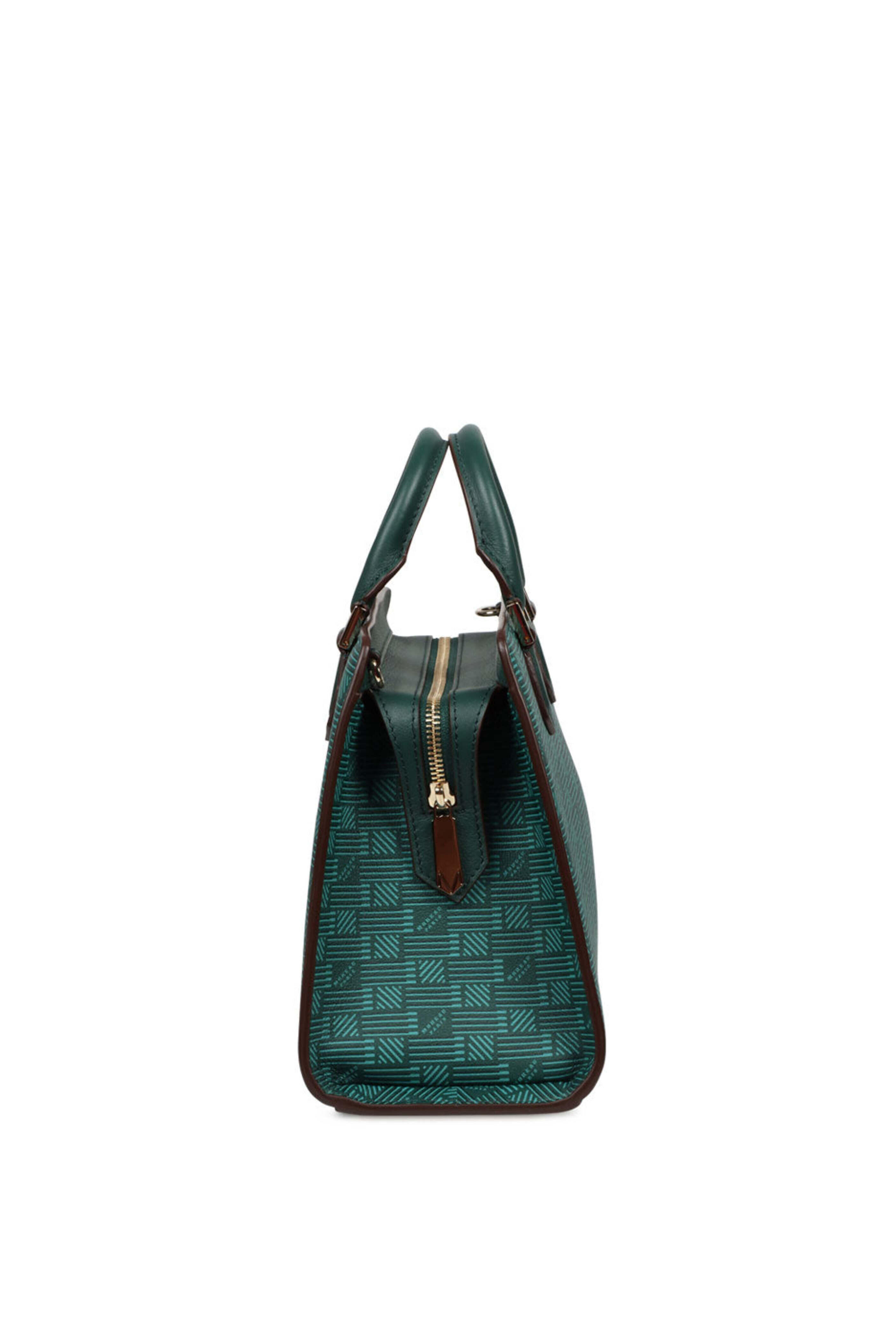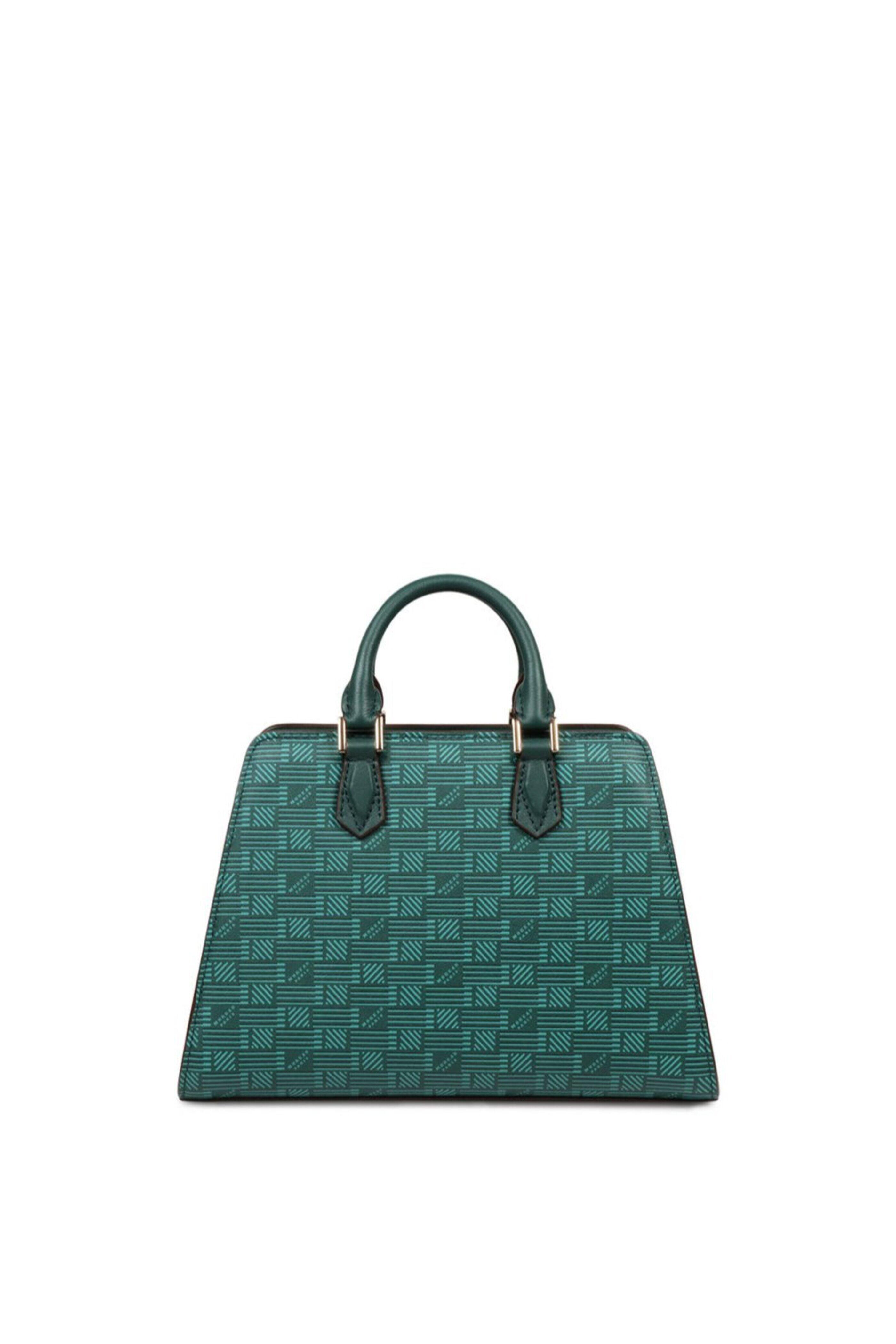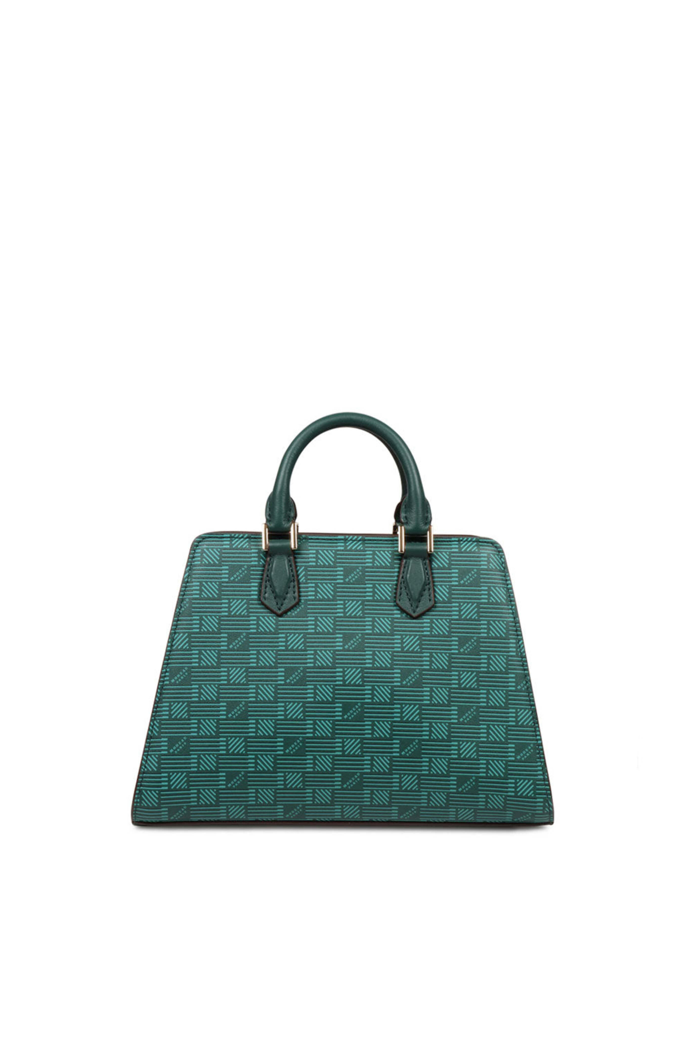 Morea Laura Top Handle Bag in Dark Green. Signature Moreanutte canvas. Top zip closure . Two retractable top handles . Detachable crossbody strap . Interior slip pocket . Leather outer . Green leather lining. Made in France.