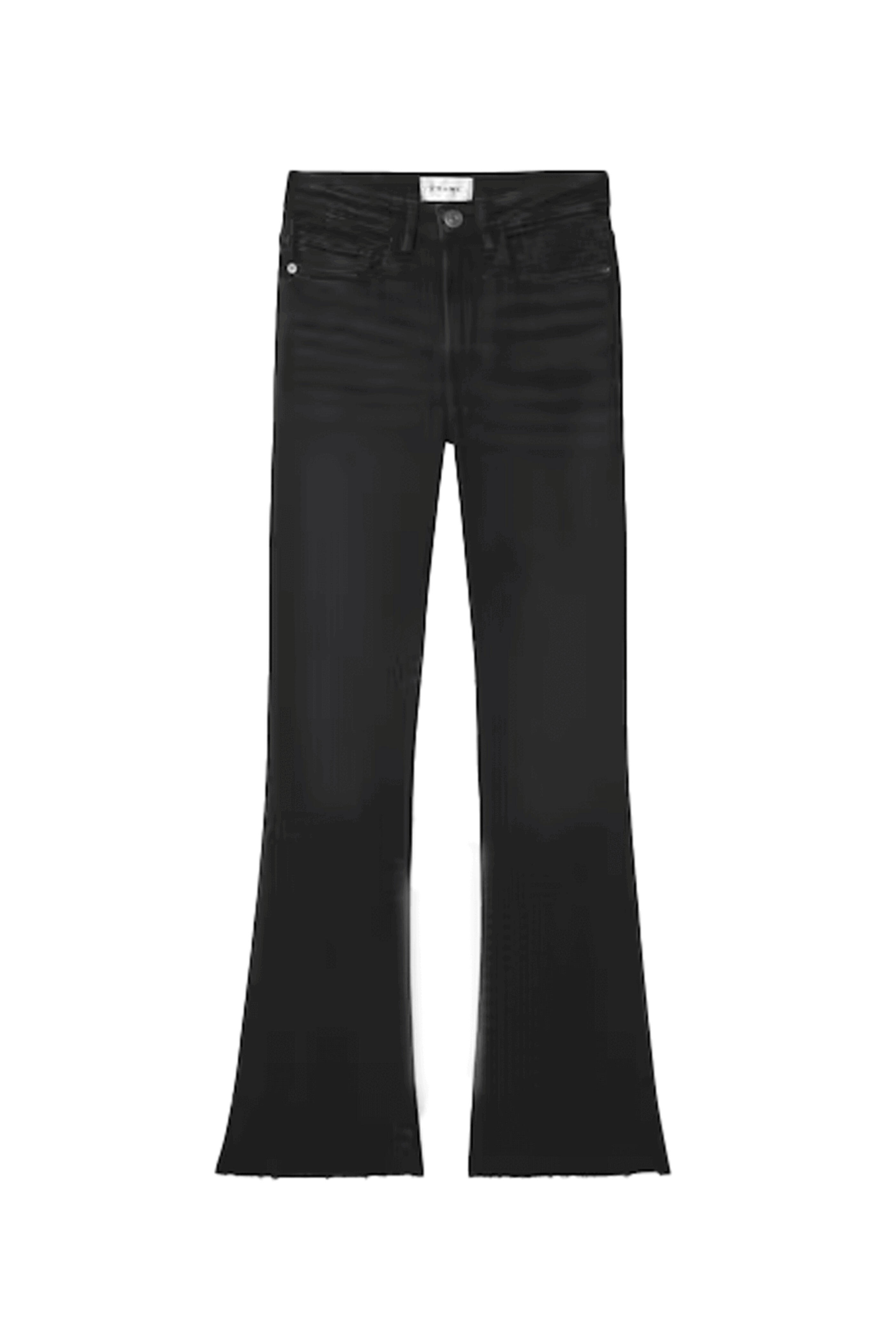 Frame Denim Le Crop Mini Boot Raw Fray Jean in Black Thorn. High rise. Button closure. Zip fly. Five pocket detail. Boot cut silhouette. Ankle length. Stretch fabrication.
