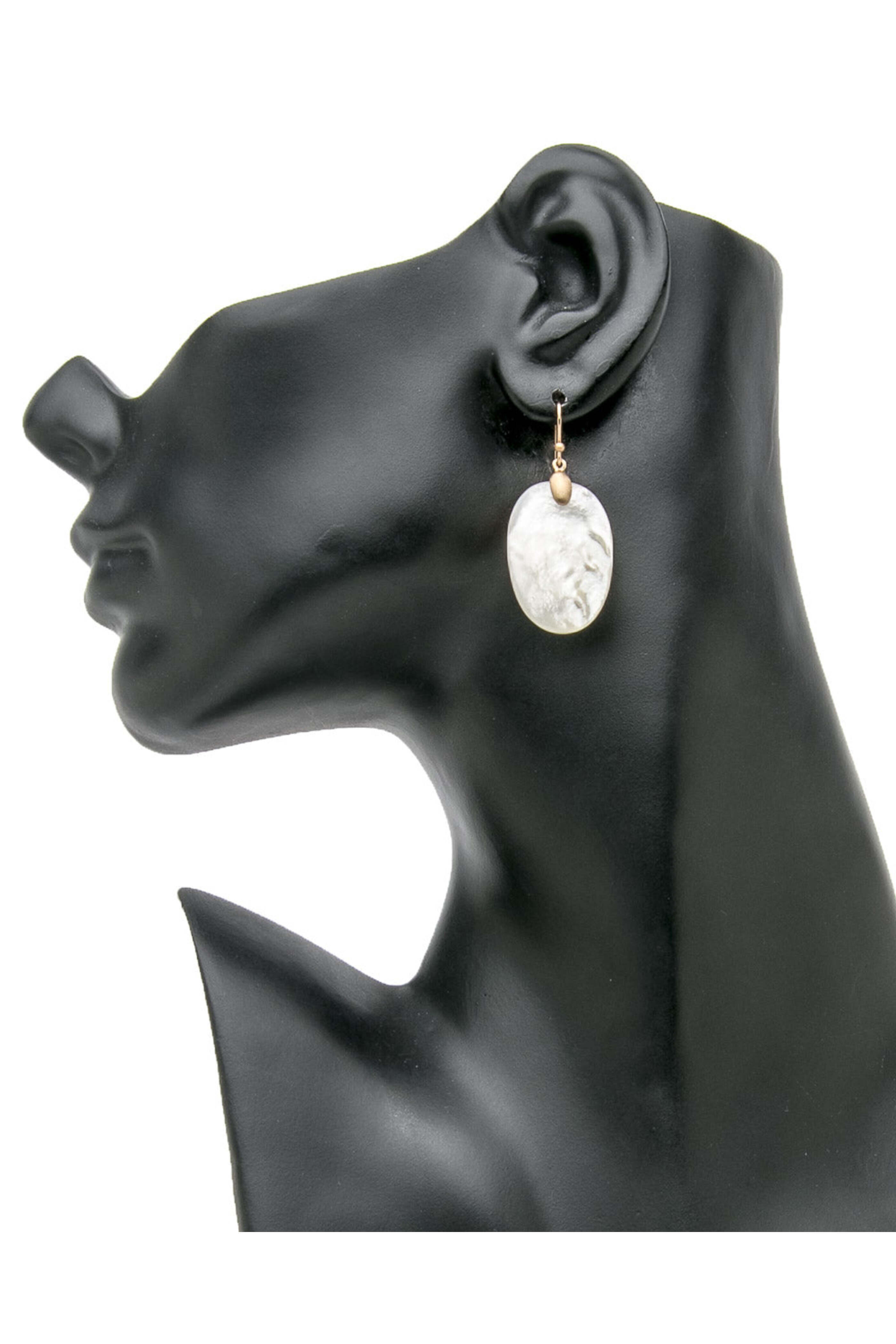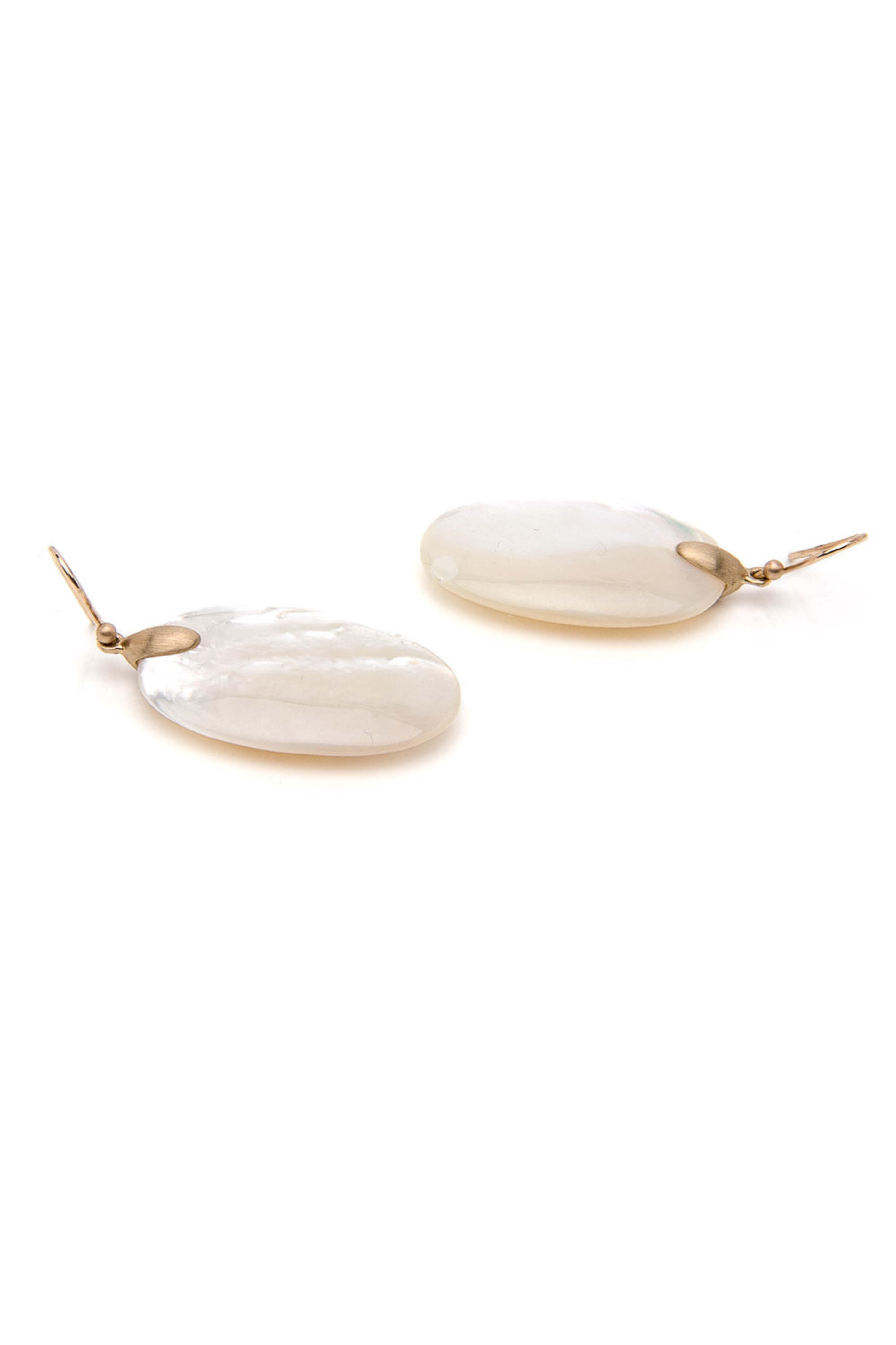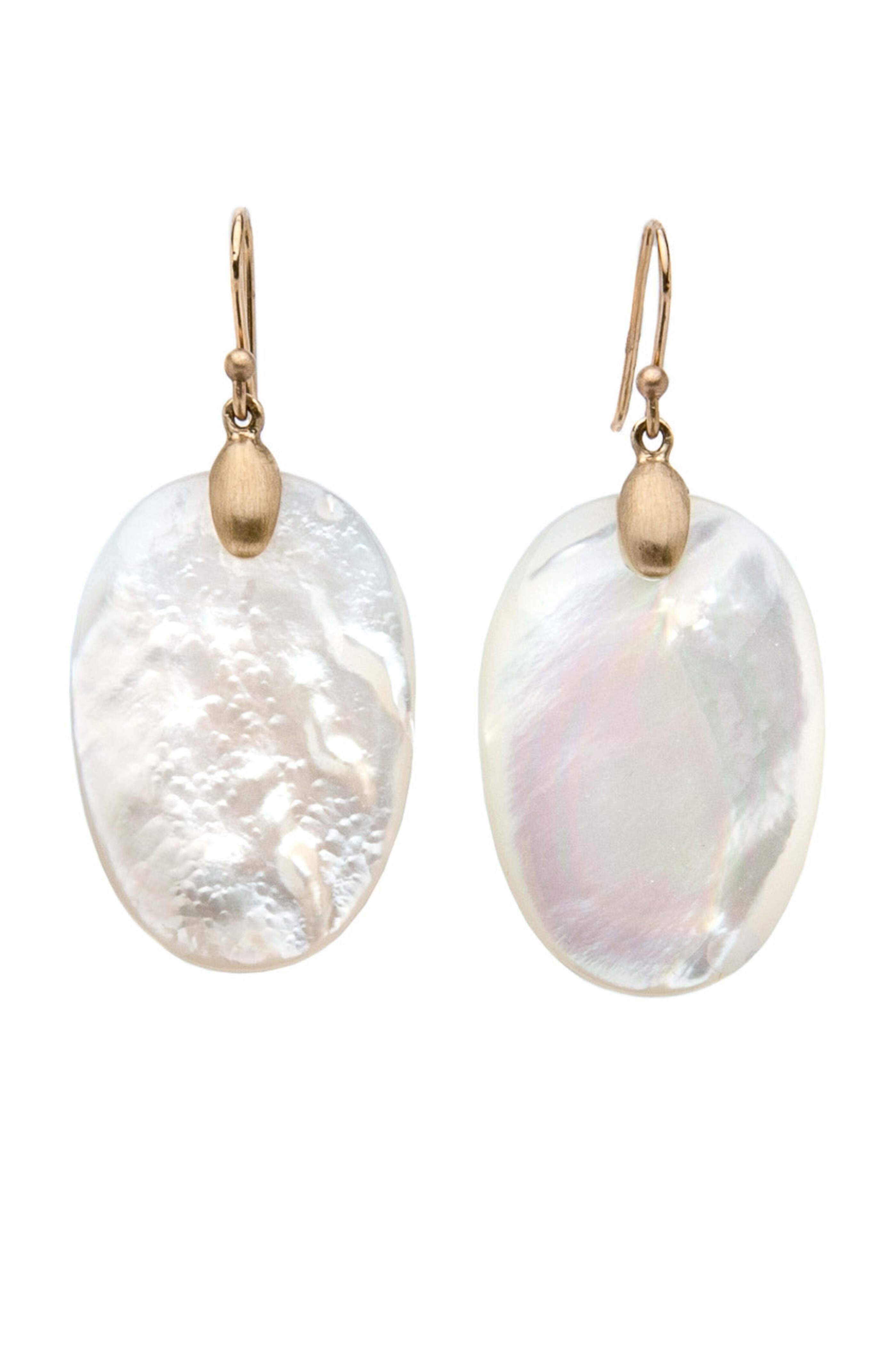 - Ted Muehling Mother of Pearl Large Chip Earrings-Gold Top Signature large chip drop earrings in white mother of pearl with gold top 14k yellow gold wire Approx. 0.75" at the widest point French wire backs