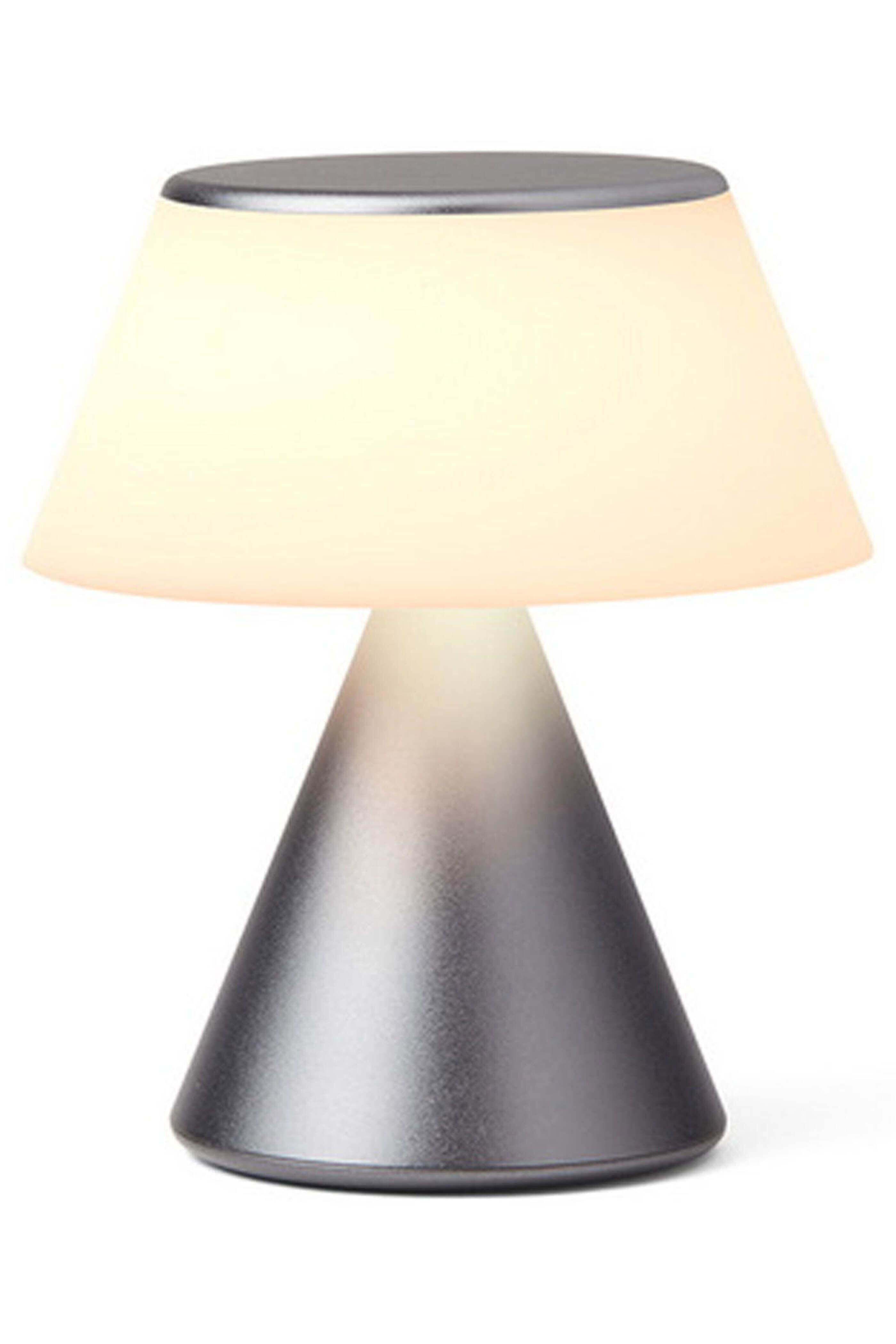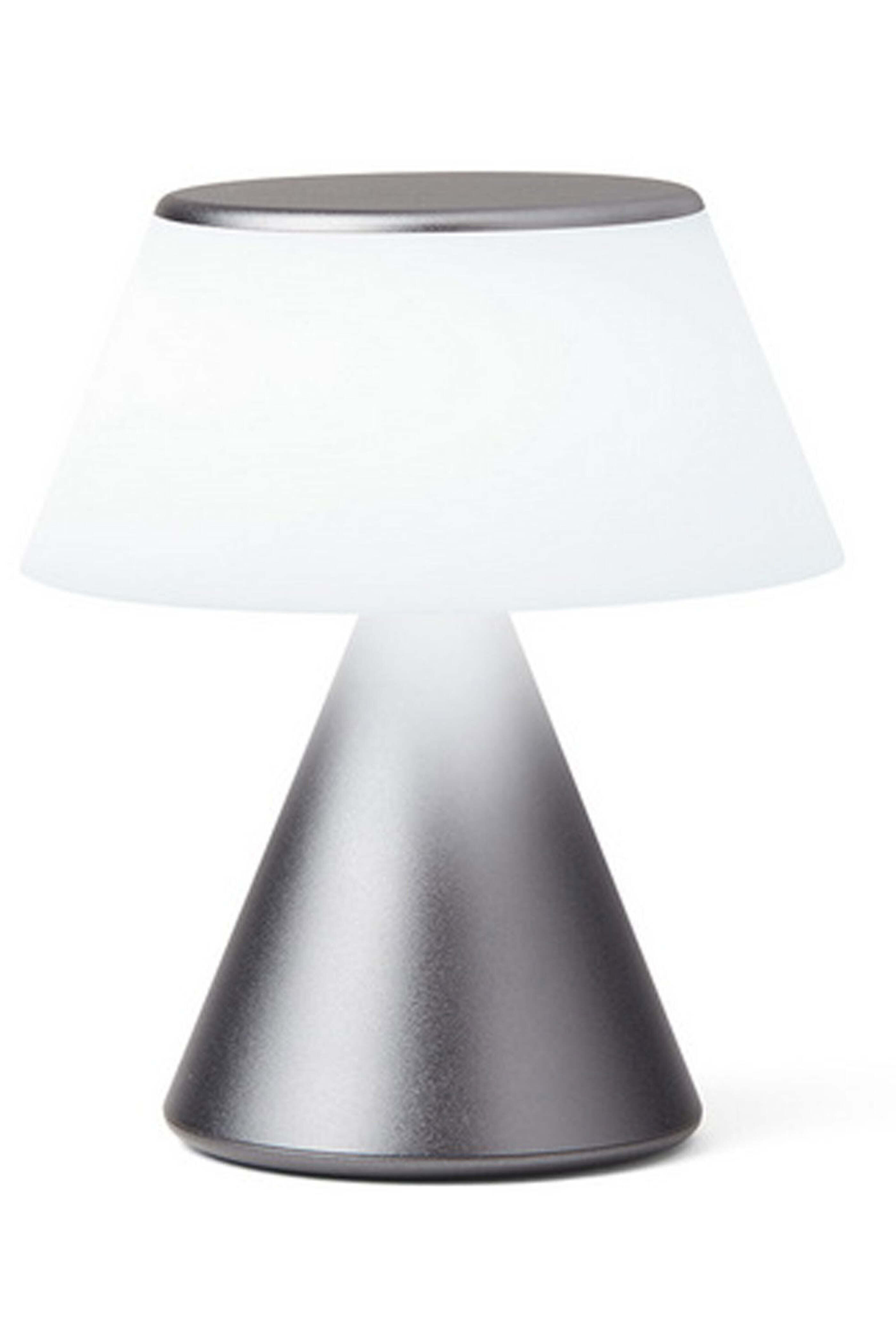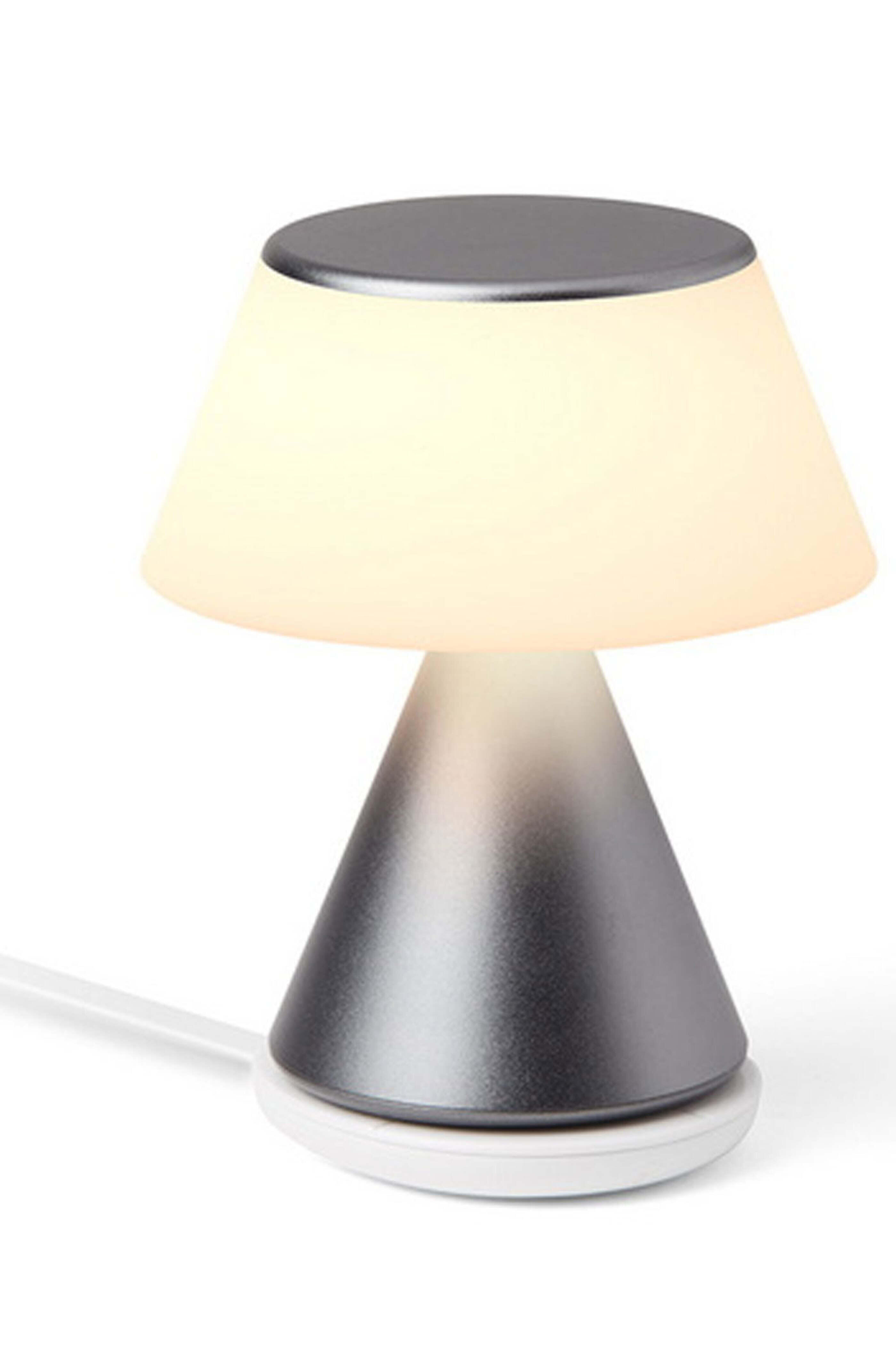 Lexon Luma M in Gun Metal. Portable LED lamp with synchronization feature. Dimmer. RGB light with 9 different colors. Touch controls. Battery life: Up to 24 hours. Outdoor friendly design (IPX4). Max lumen output: 40. Charging time: 2h. Rechargeable via USB-C (cable included) or wirelessly. Power supply: 5V USB power adapter (not included). Material: Aluminum / ABS. 3.66 x 4.25. Imported.