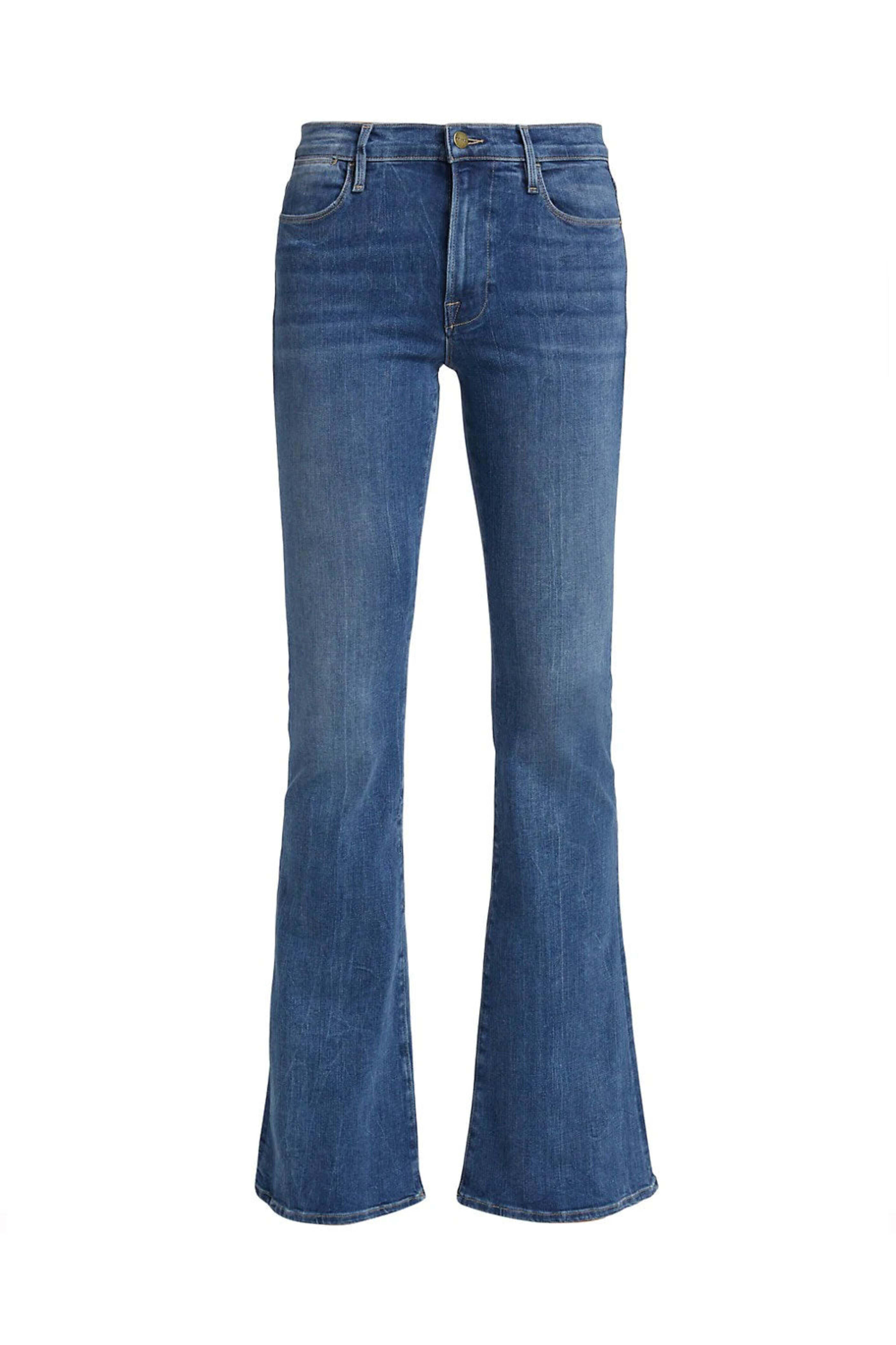 Frame Le High Flare in Ashton. High rise. Button closure. Zip fly. Belt loops. Five pocket style. Flare silhouette. Full length. Stretch denim fabrication. 94% cotton, 4% polyester, 2% elastane.
